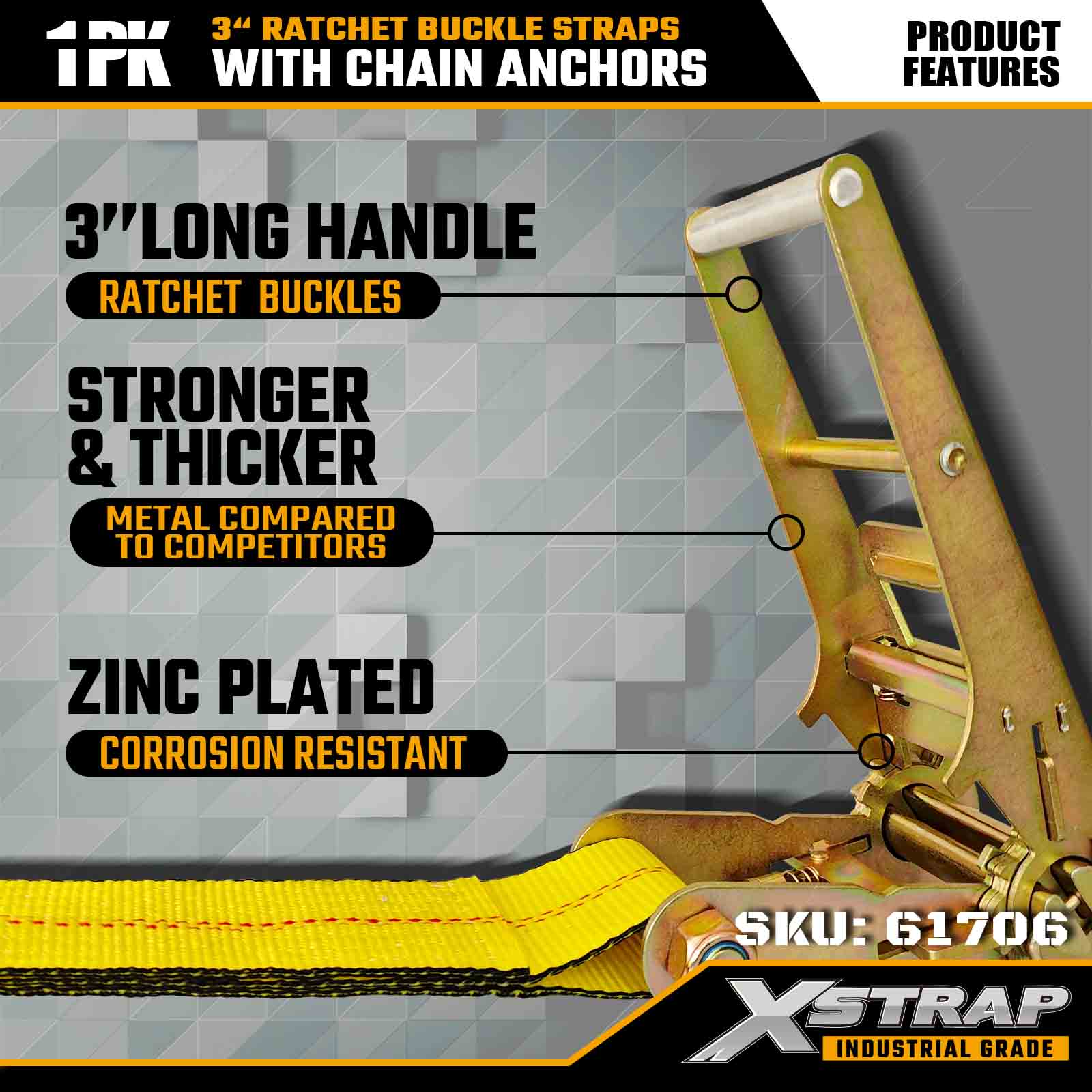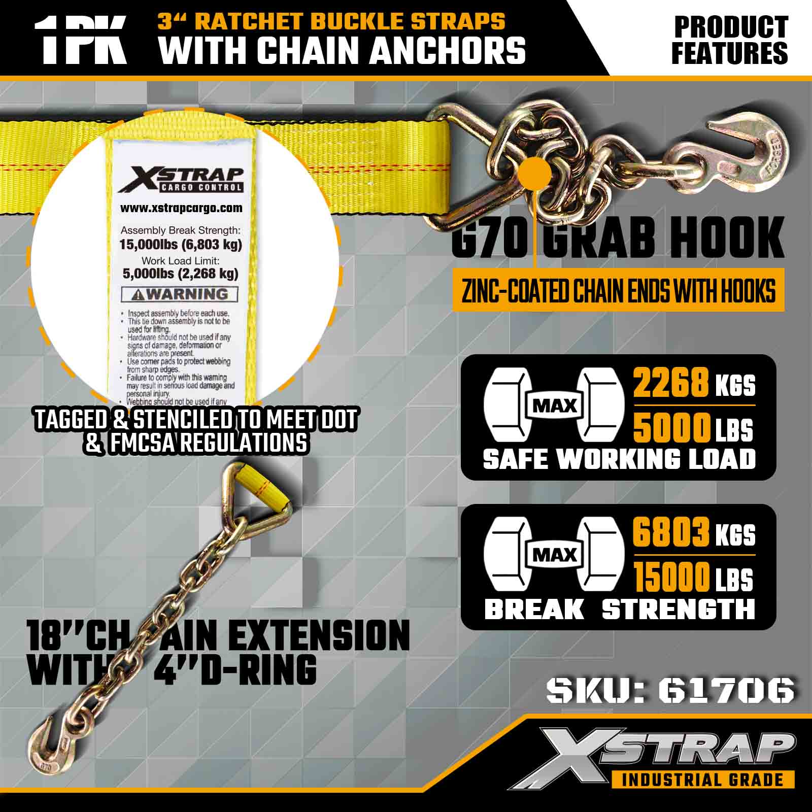 Cureaua cu cataramă cu clichet Xstrap 61706 3" × 30ft (pachet de 1) este proiectată pentru asigurarea încărcăturii grele, oferind ancore de lanț forjate și un sistem de clichet de înaltă tensiune. Cu un WLL de 5.000 lbs și 15.000 lbs rezistență la rupere, oferă rezistență la rupere, oferă mașini de transport plat și fiabile pentru transportul industrial, de performanță.