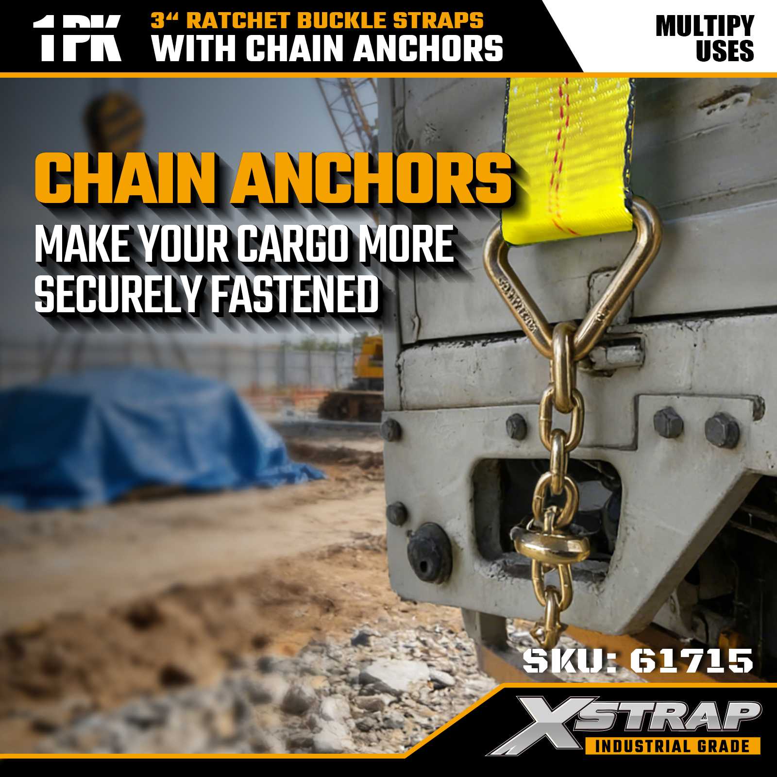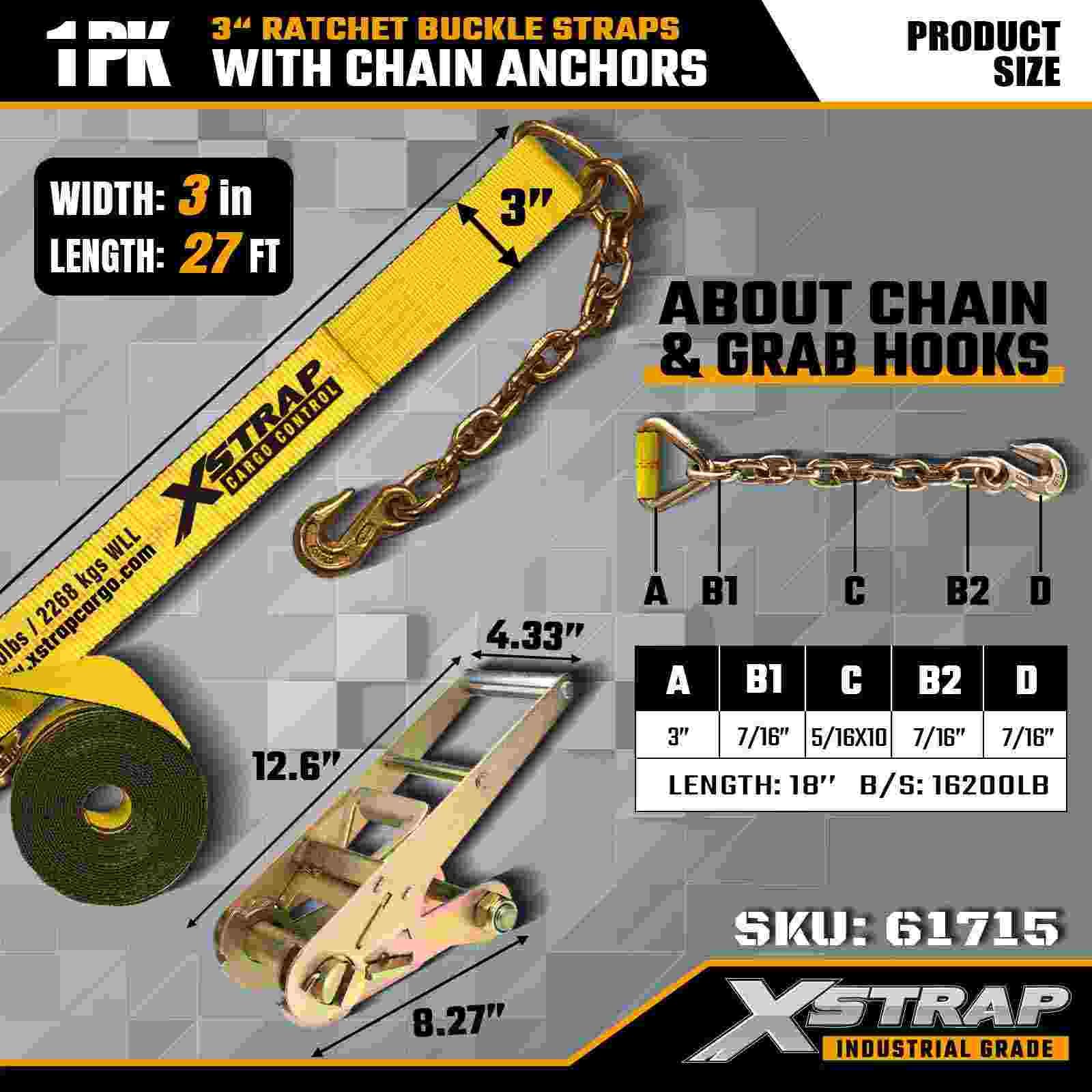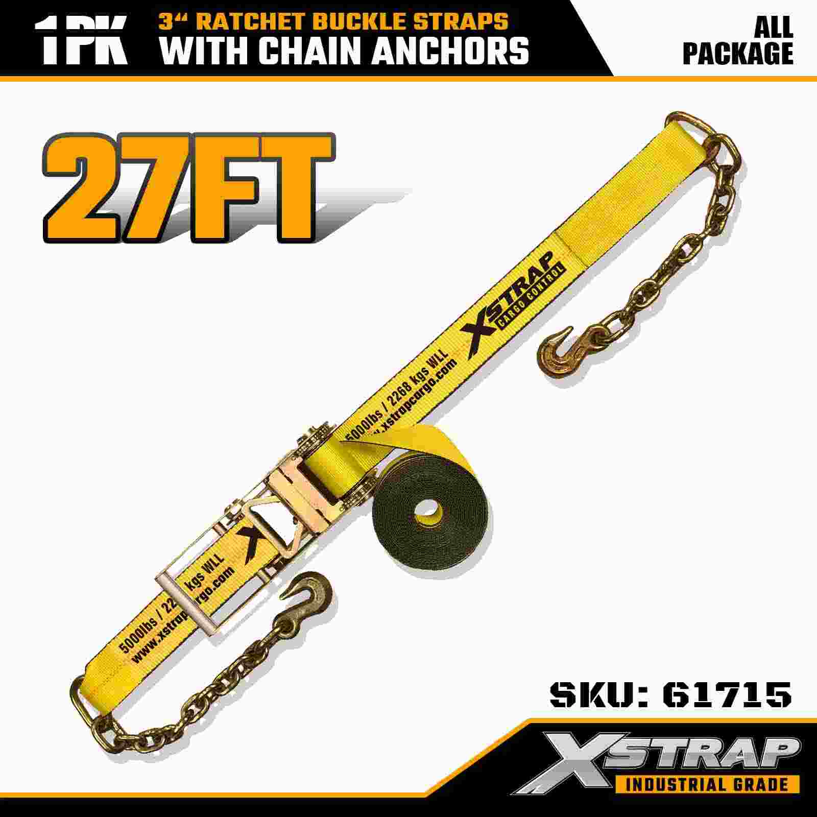 Xstrap 61715 Curele cu cataramă cu clichet de 3" x 27ft (pachet de 1) – Ancore cu lanț, capacitate de încărcare de 5.000 lbs, rezistență la rupere de 15.000 lbs. Proiectate pentru controlul încărcăturii grele, aceste curele combină chingile de calitate industrială cu chingile de calitate industrială cu lanțuri, capete de ancore și capete de transport pentru remorcă.