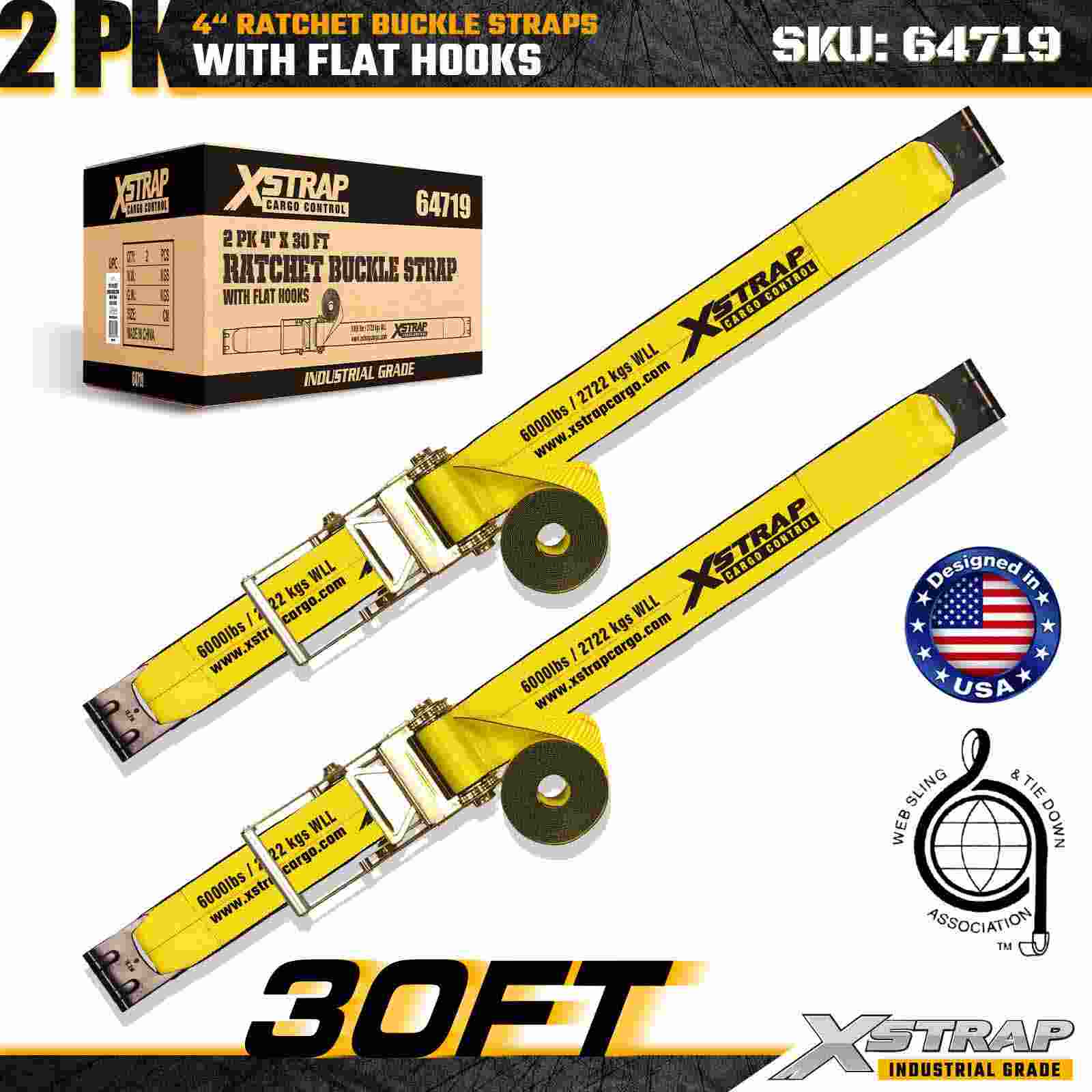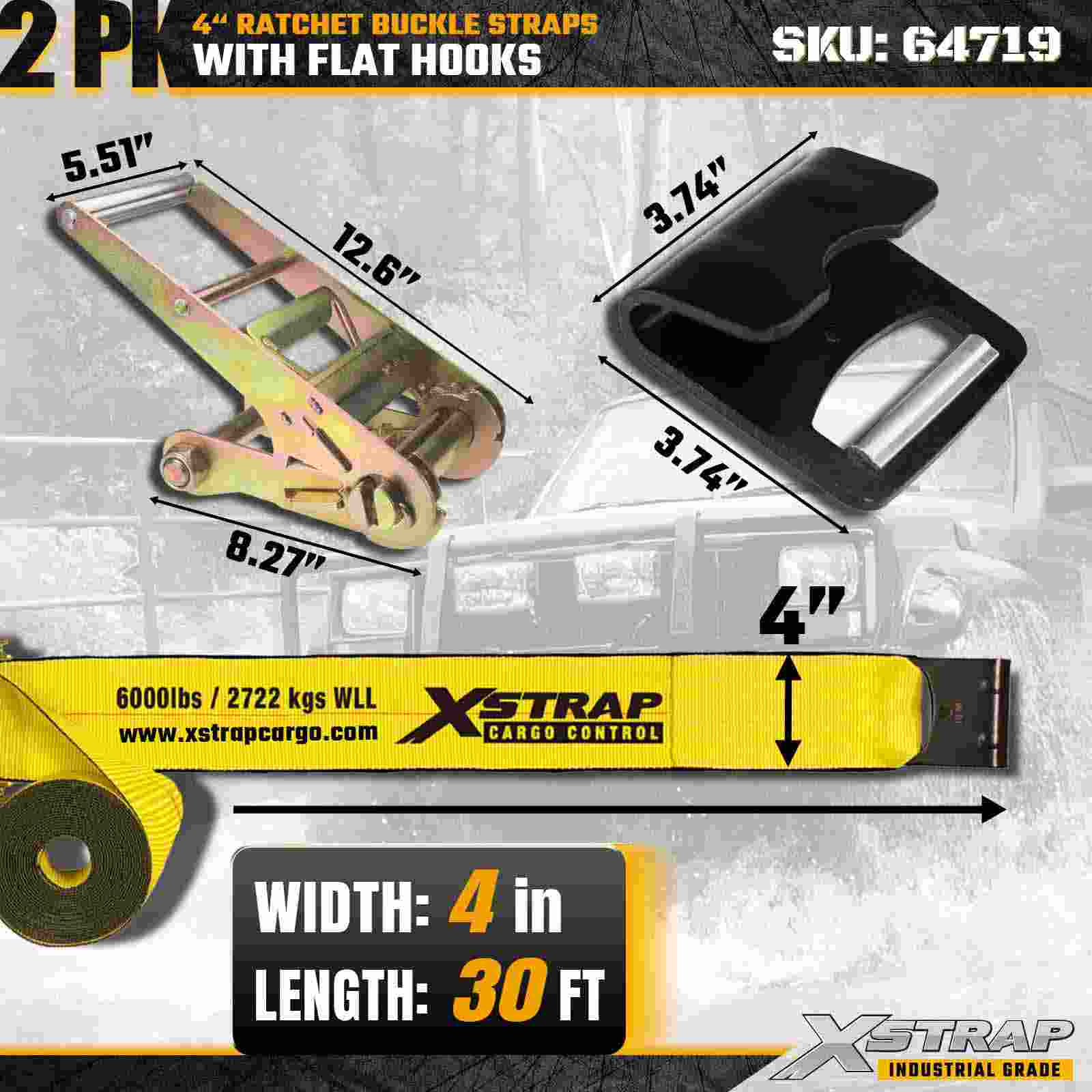 Curelele cu cataramă cu clichet Xstrap 64719 de 4" × 30 ft (pachet de 2) oferă o fixare grea a încărcăturii cu cârlige plate întărite și un mecanism de clichet durabil. Evaluate la 6.000 lbs WLL și 18.000 lbs rezistență la rupere, sunt ideale pentru transportul cu platformă, transportul și aplicațiile industriale de mărfuri.
