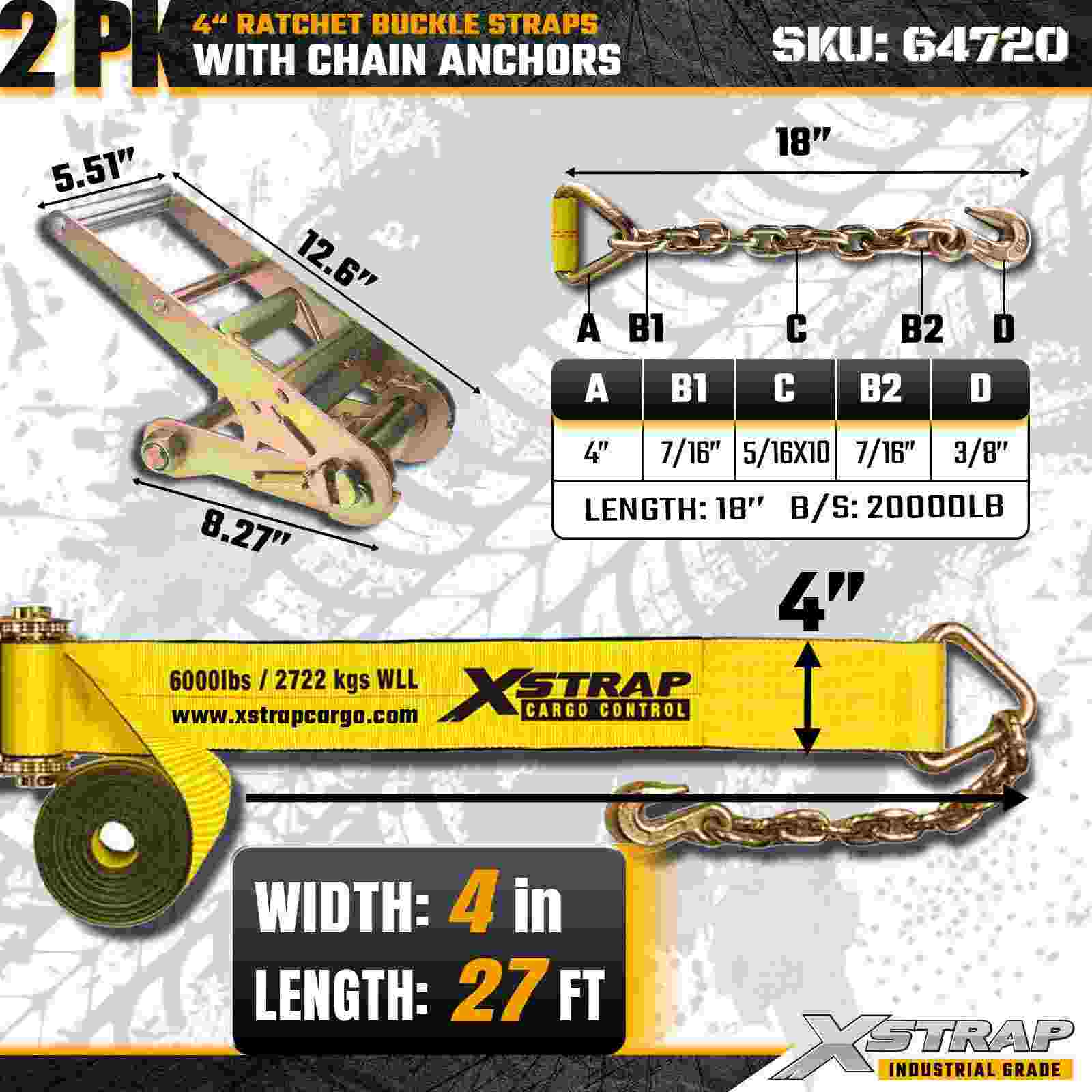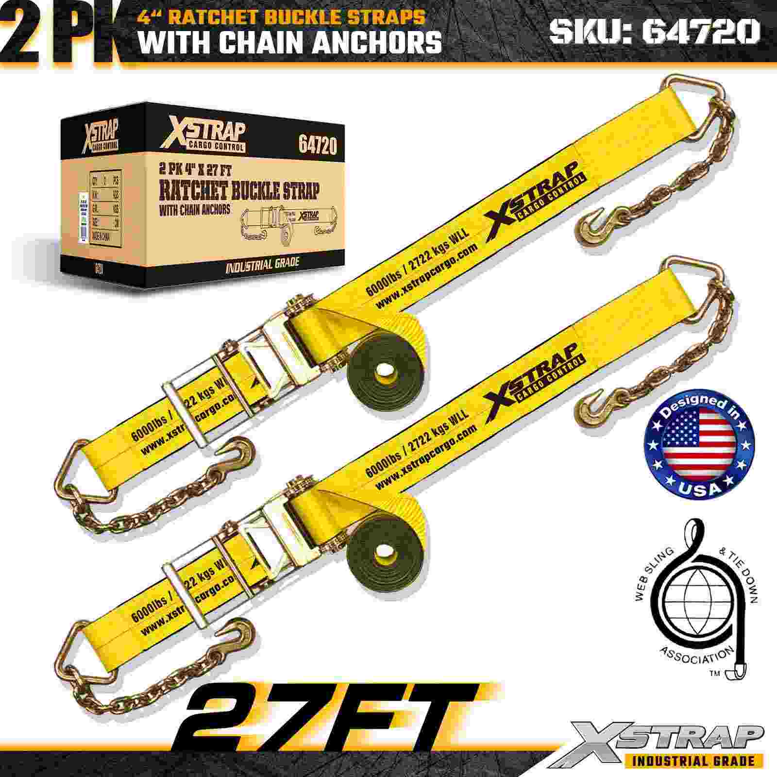 Curelele cu cataramă cu clichet Xstrap 64720 4" × 27ft (pachet de 2) sunt proiectate pentru fixarea încărcăturii grele, având ancore robuste cu lanț și un mecanism de clichet întărit. Cu o limită de sarcină de lucru de 6.000 lbs și 18.000 lbs, aceste curele de oțel sunt ideale pentru transportul, rezistența la rupere a încărcăturii și aplicații industriale de marfă care necesită rezistență și fiabilitate maxime.