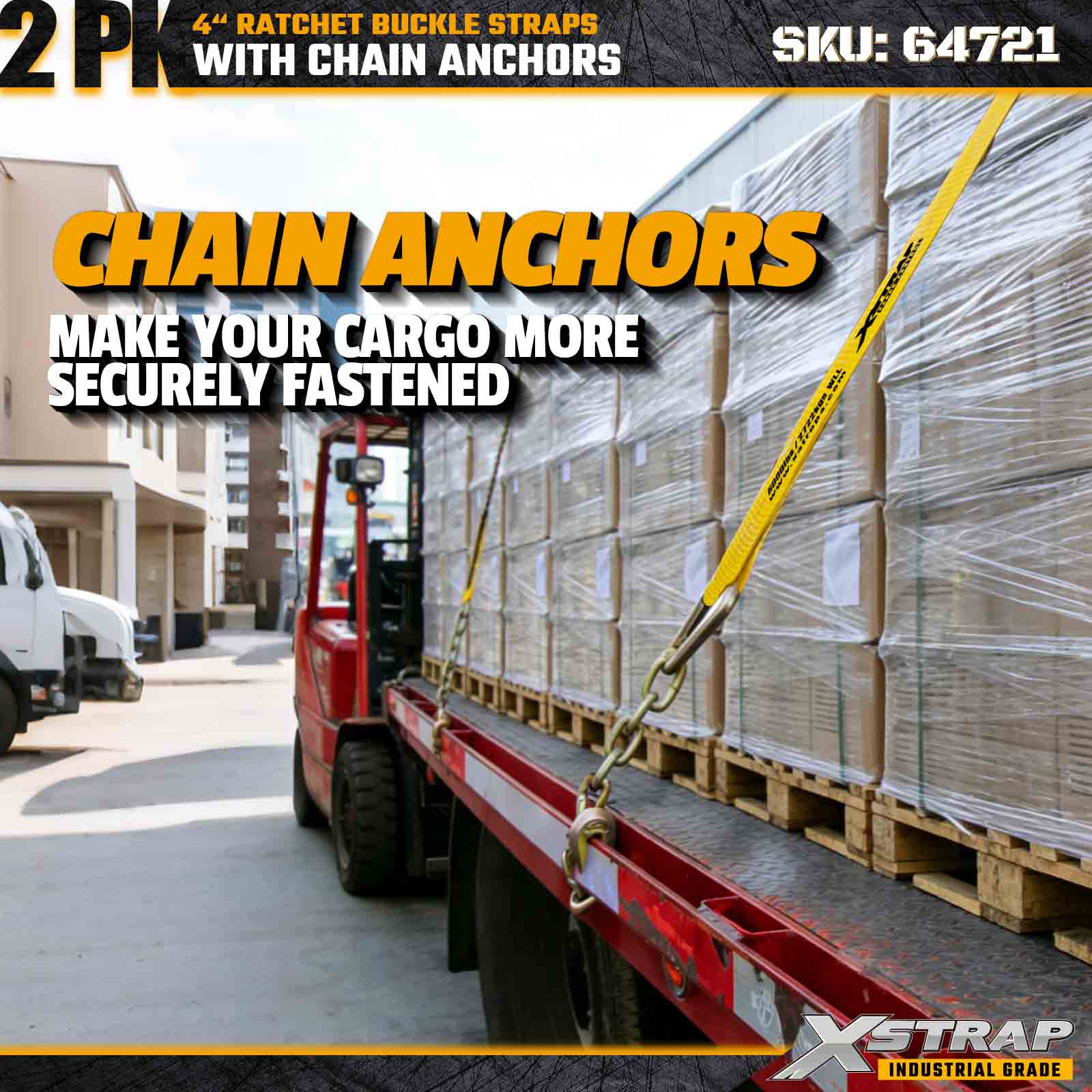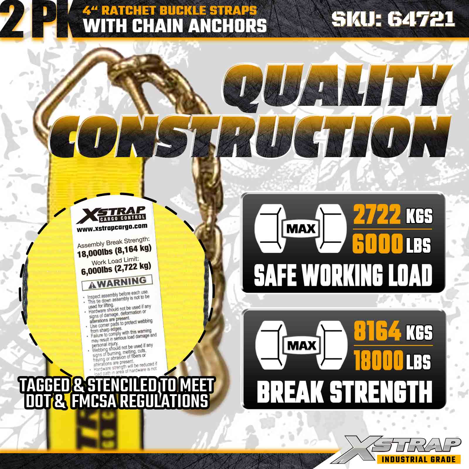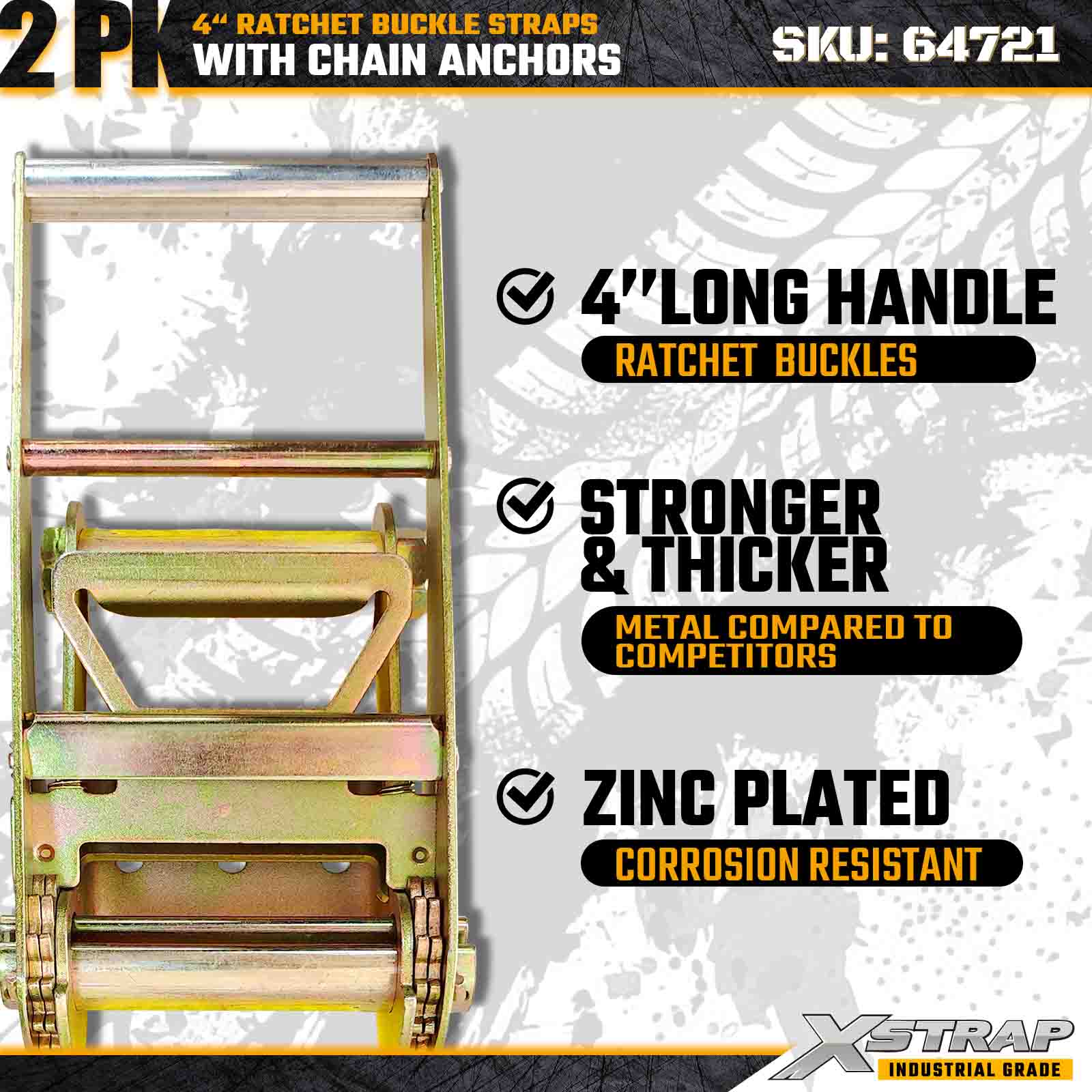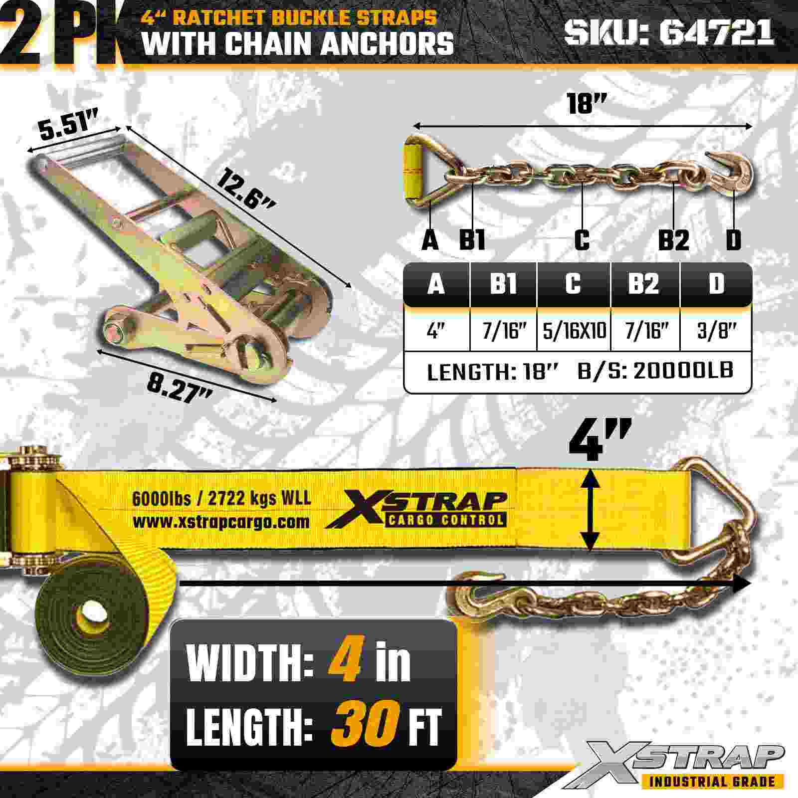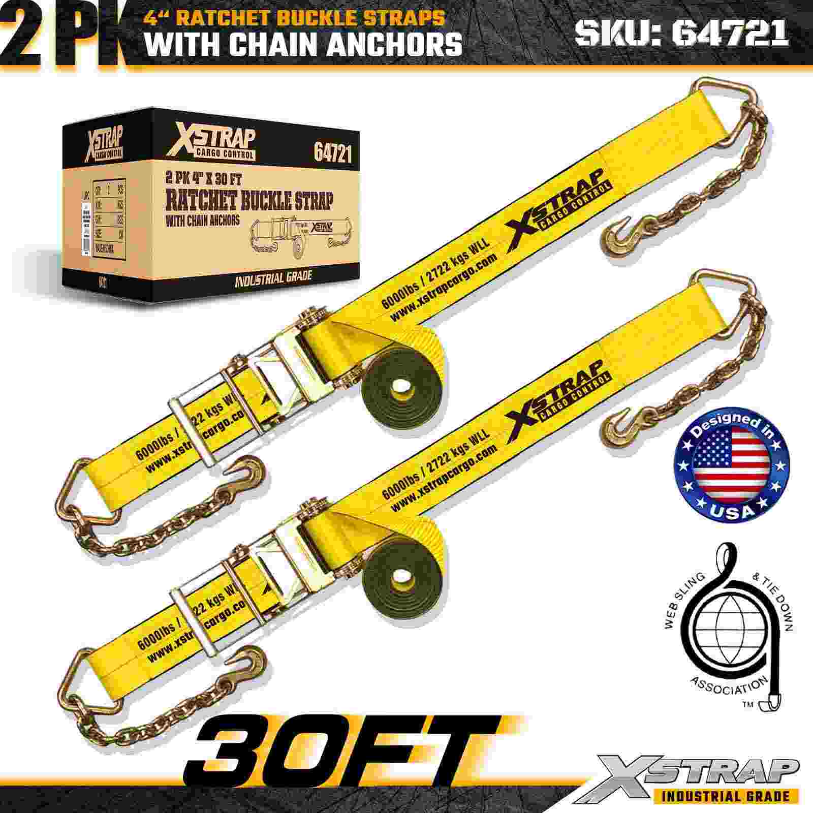 Curelele cu cataramă cu clichet Xstrap 64721 4" × 30ft (pachet de 2) sunt proiectate pentru asigurarea încărcăturii grele, având ancore robuste cu lanț și un mecanism de clichet întărit. Cu o sarcină limită de lucru de 6.000 lbs și 18.000 lbs, aceste curele de oțel sunt ideale pentru transportul, rezistența la rupere a încărcăturii și aplicații industriale de marfă care necesită rezistență și fiabilitate maxime.