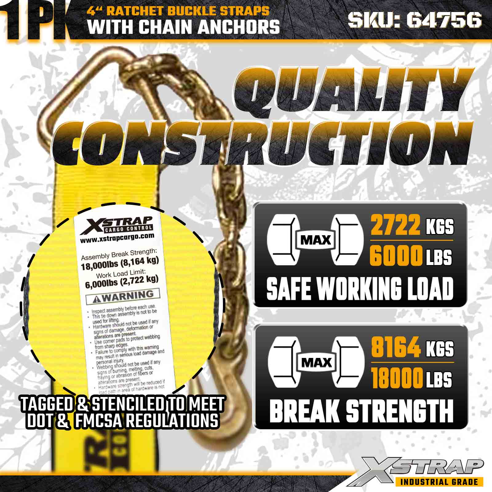 Cureaua cu cataramă cu clichet Xstrap 64756 4" × 50ft (pachet de 1) este proiectată pentru asigurarea încărcăturii extreme, având ancore robuste cu lanț și un mecanism de clichet întărit. Cu o limită de sarcină de lucru de 6.000 lbs și 18.000 lbs rezistență la rupere, acest pluschinga lungă este ideală pentru încărcături supradimensionate, transport de mașini, transport de oțel și logistică industrială care necesită o rază maximă de acțiune și fiabilitate.