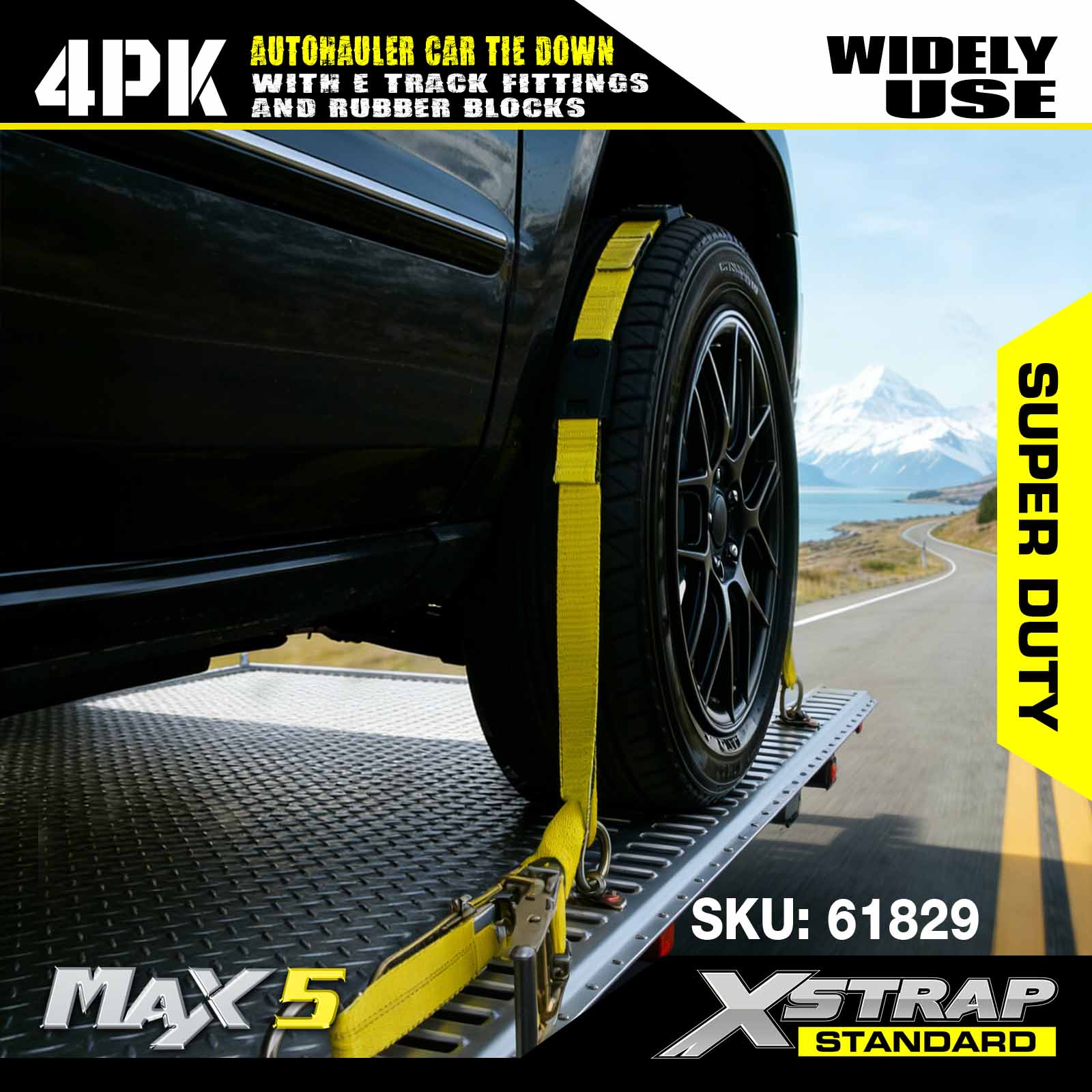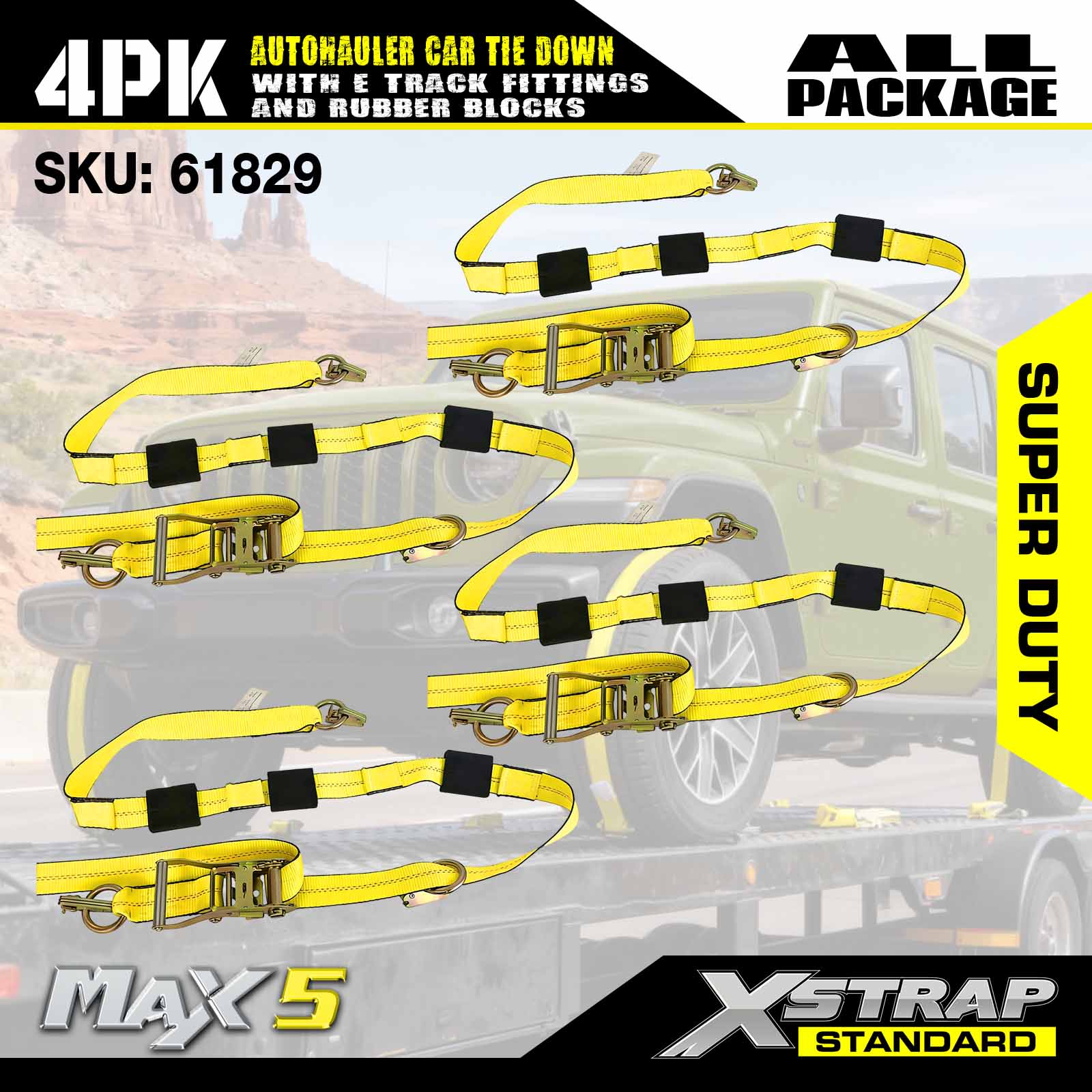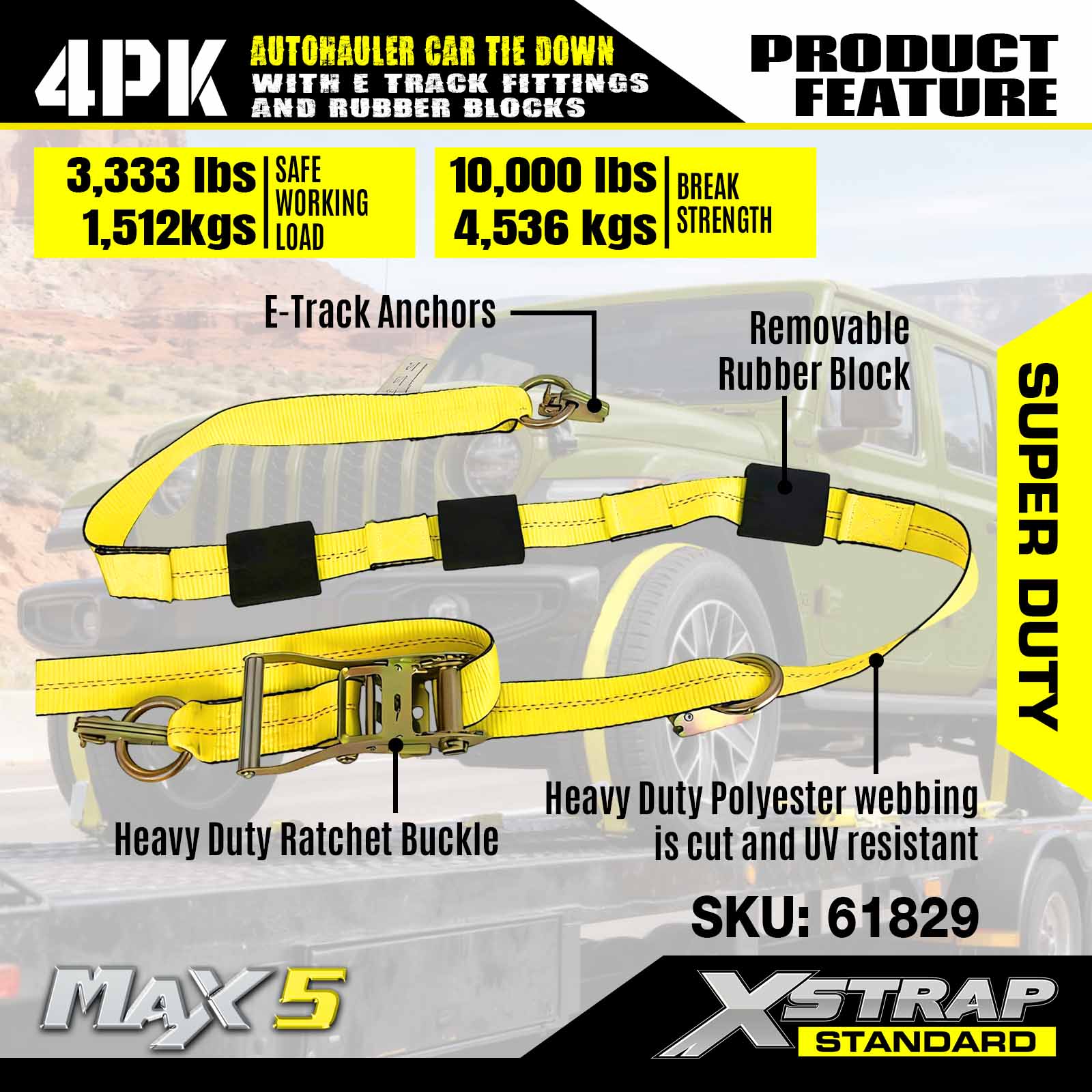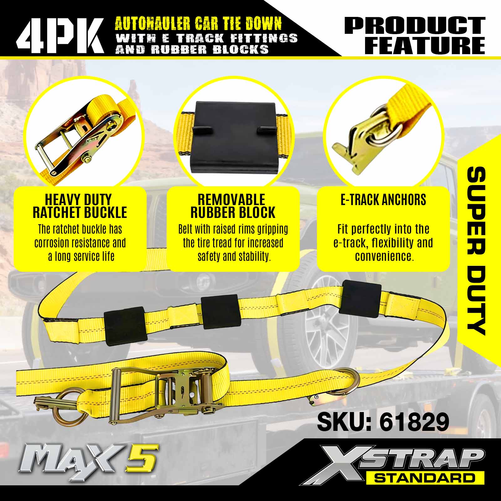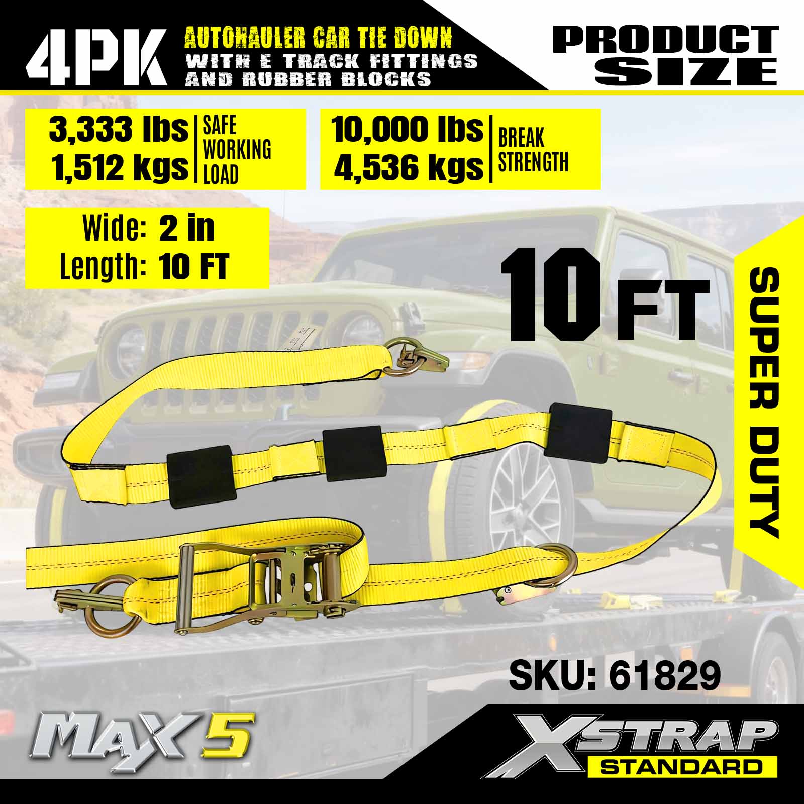 Curele pentru anvelope Xstrap E Track pentru remorcă Curea de transport auto de 2" x 10 pi - Rezistență la rupere garantată de 10.000 lb - (4) Kit premium de fixare a vehiculului cu blocuri de cauciuc Agrafe pentru roți pentru camion, UTV