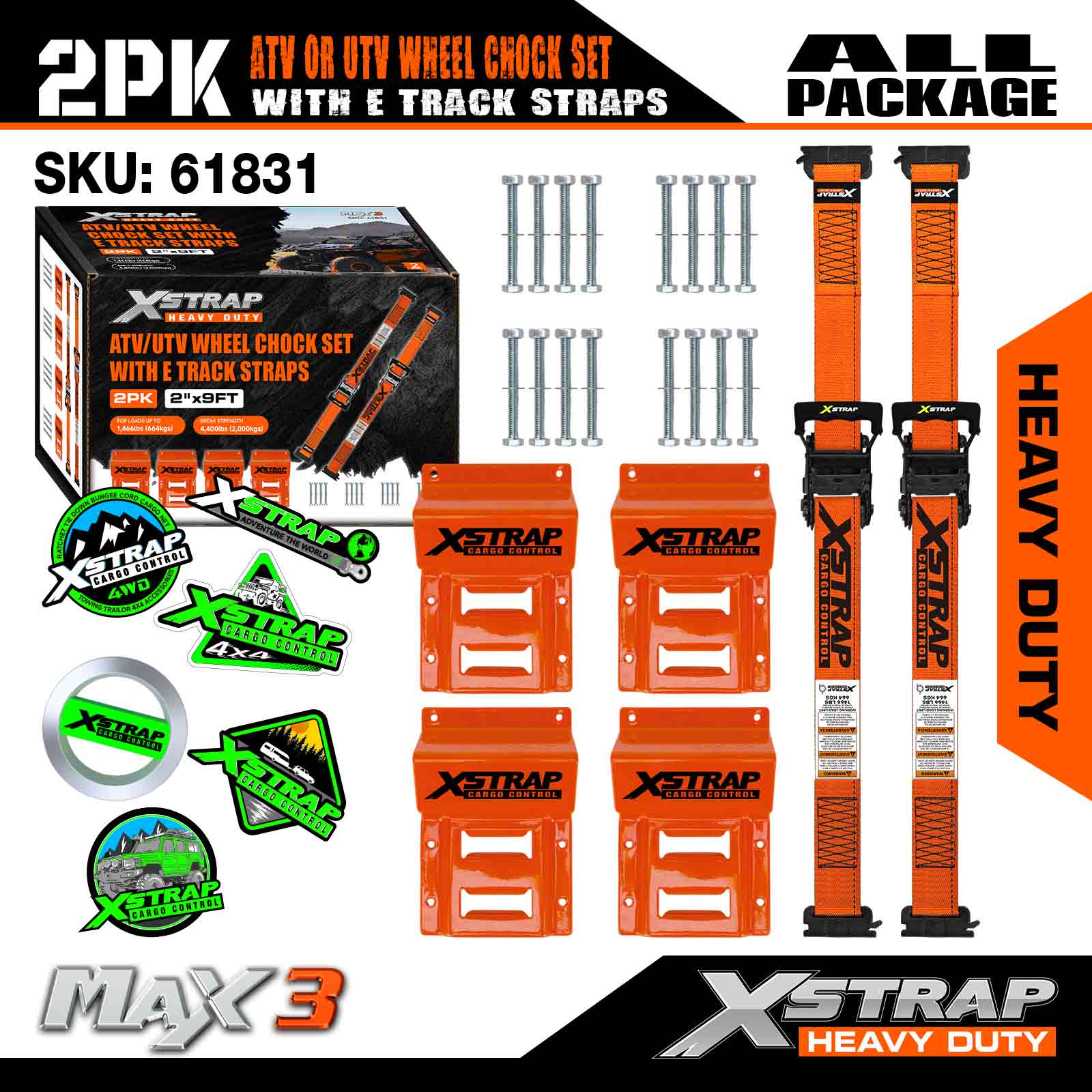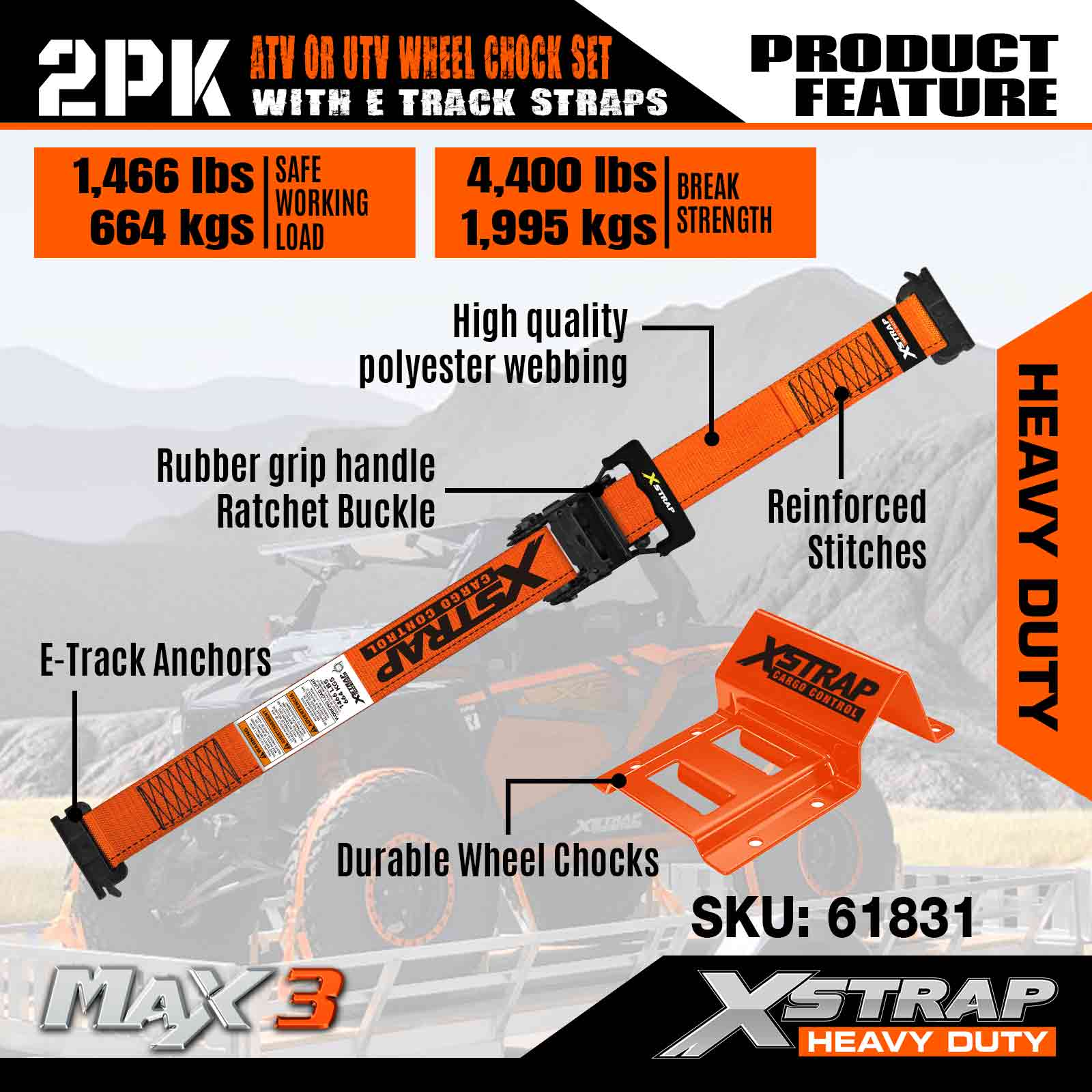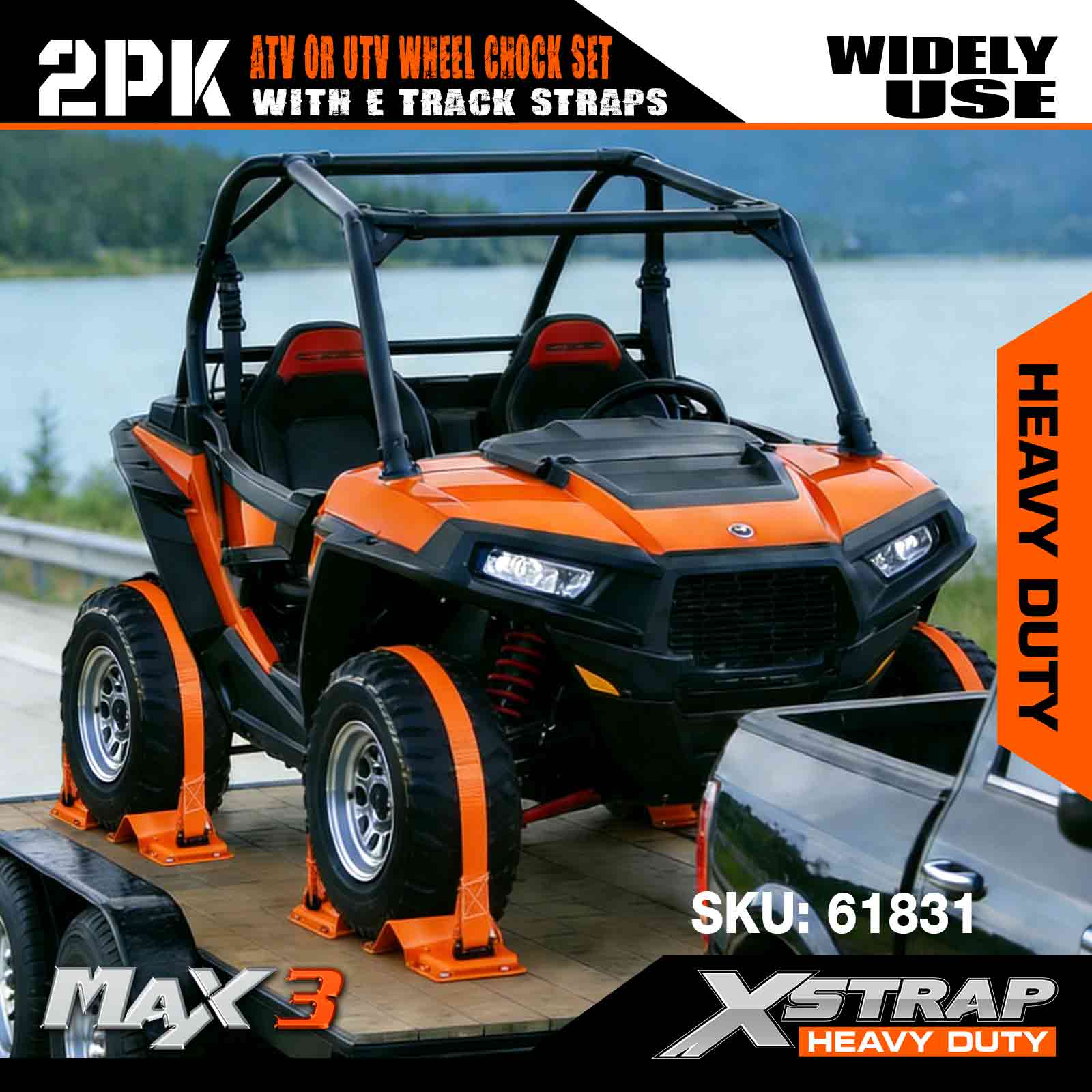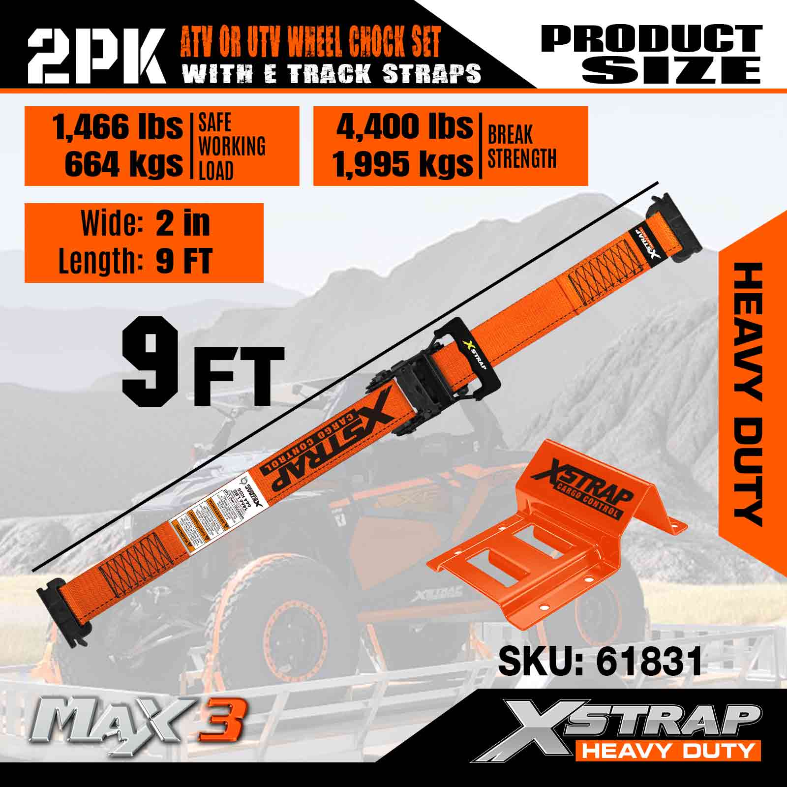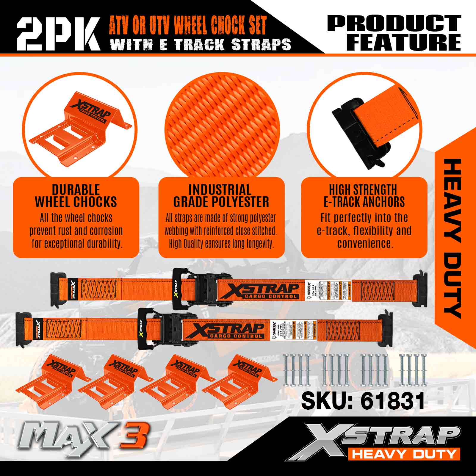 Kit de fixare pentru fixarea roților UTV Xstrap 4.400 lb Rezistență la rupere (4) Curele cu clichet pentru anvelope de remorcă de rezistență (8) Cale pentru roți - Sistem E Track pentru ATV, UTV, mașină de tuns iarba Mașină cu patru roți - Portocaliu