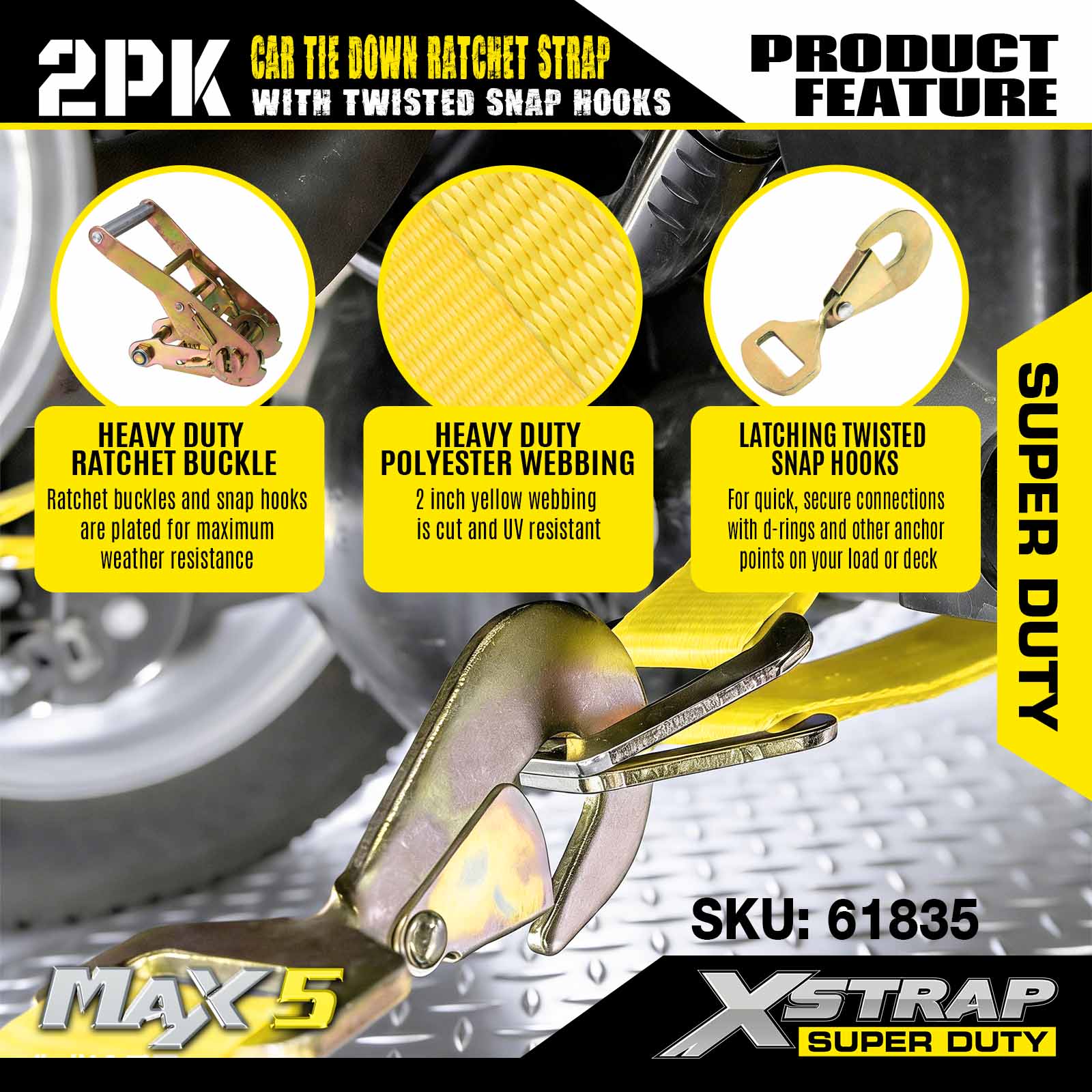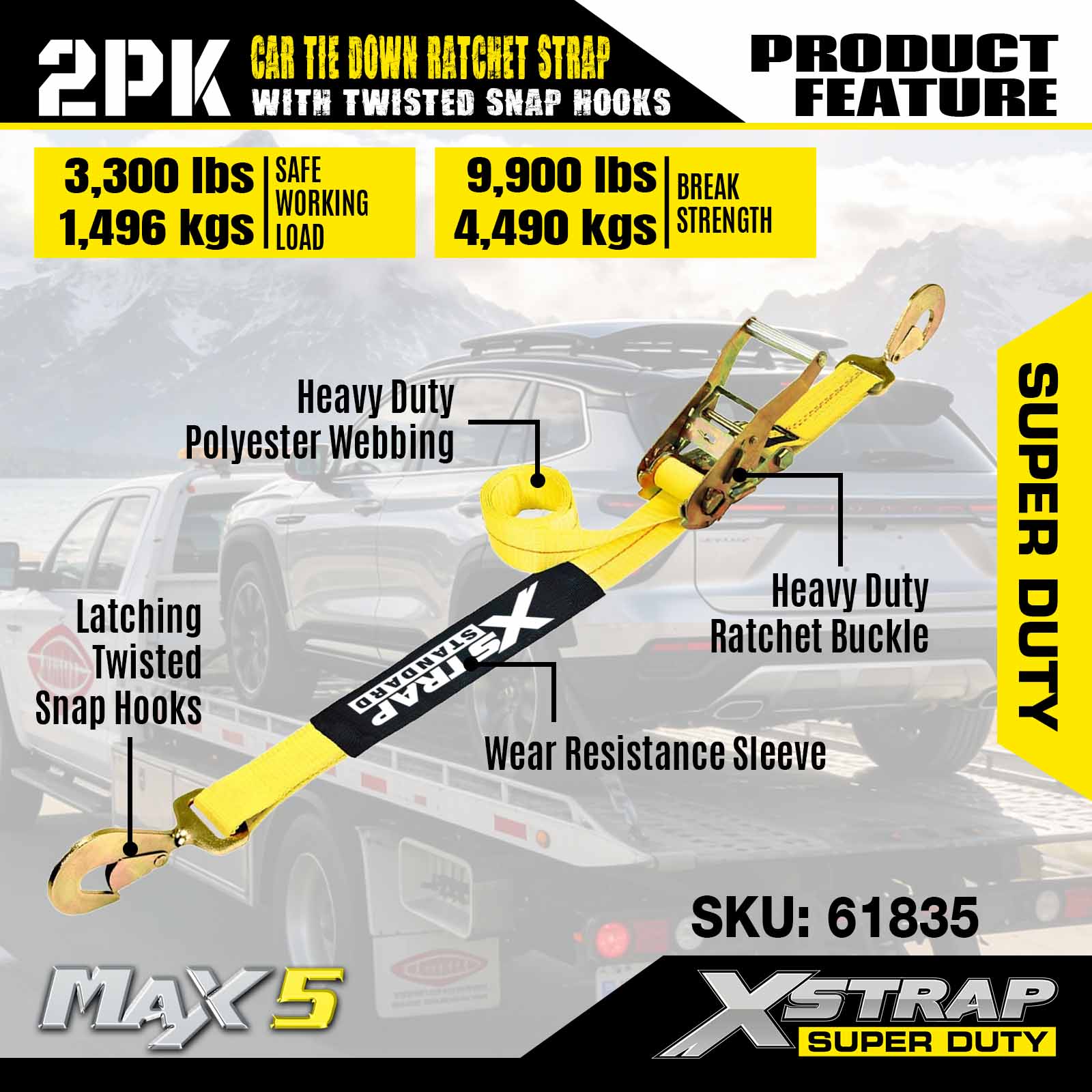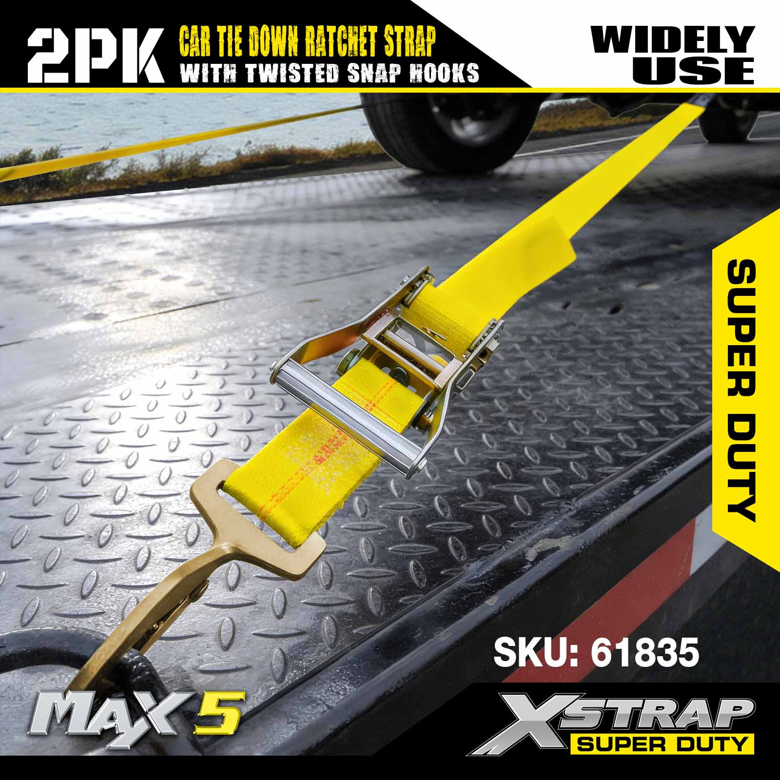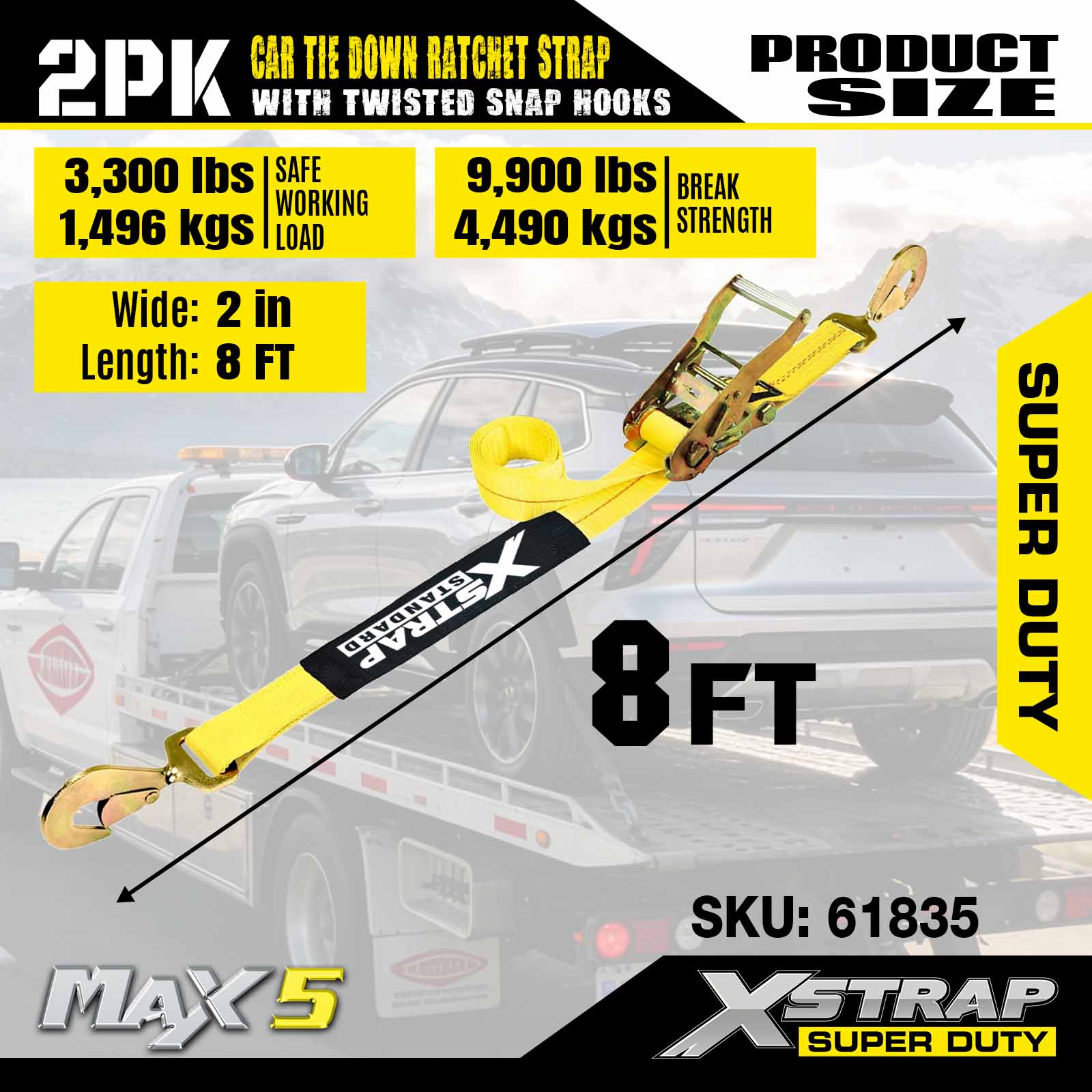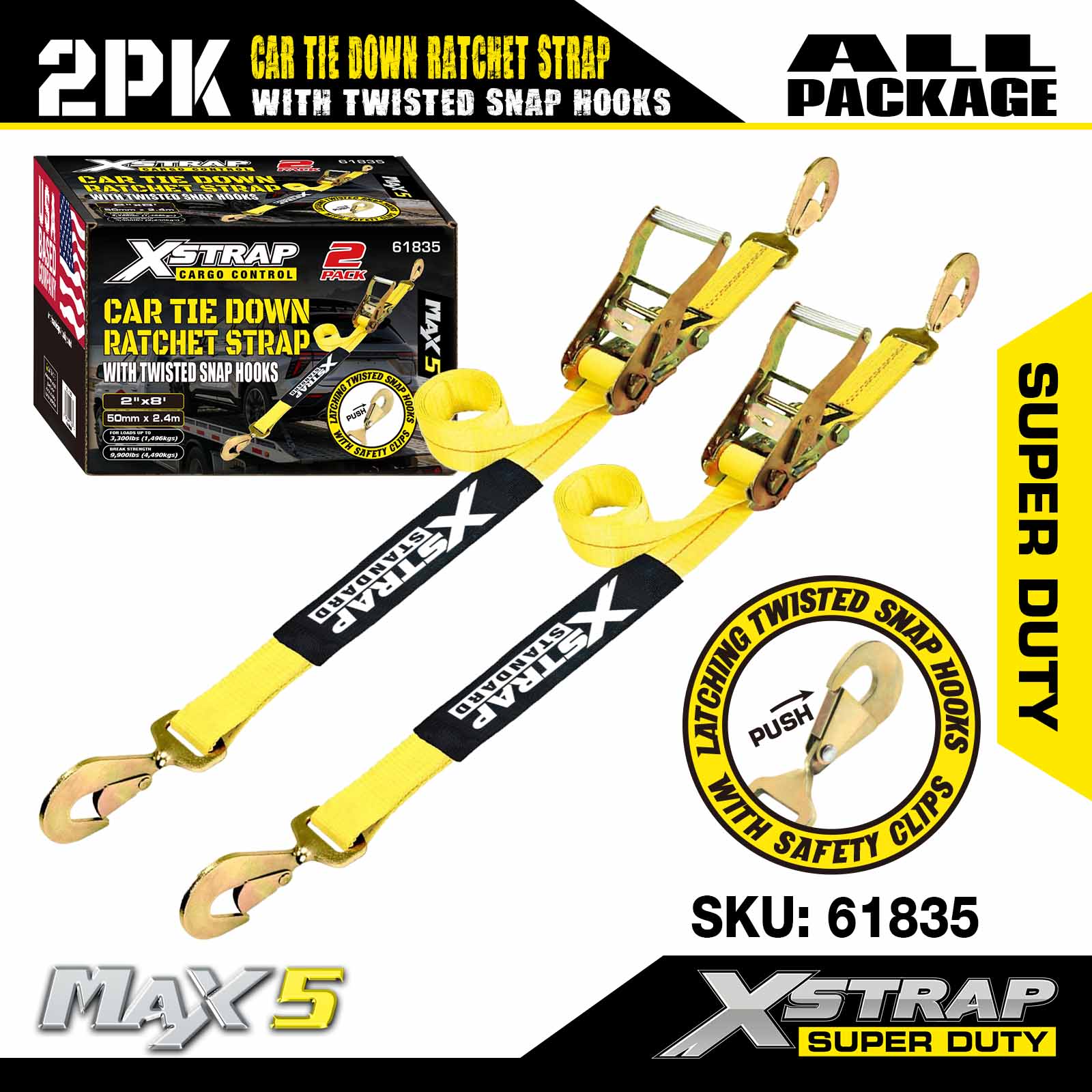 Curele de fixare a mașinii Xstrap pentru remorcă, 2 inchi x 8 inchi, curele cu clichet pentru transportul de mașini, 2 buc., rezistență la rupere de 10.000 de livre