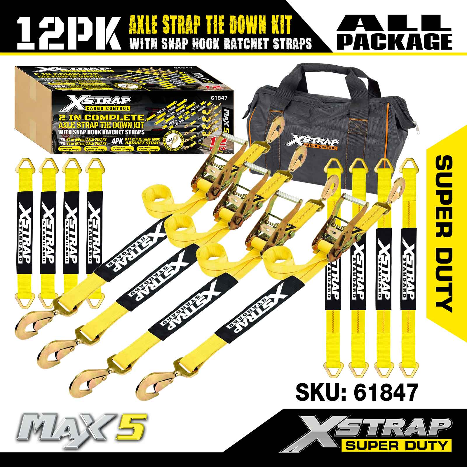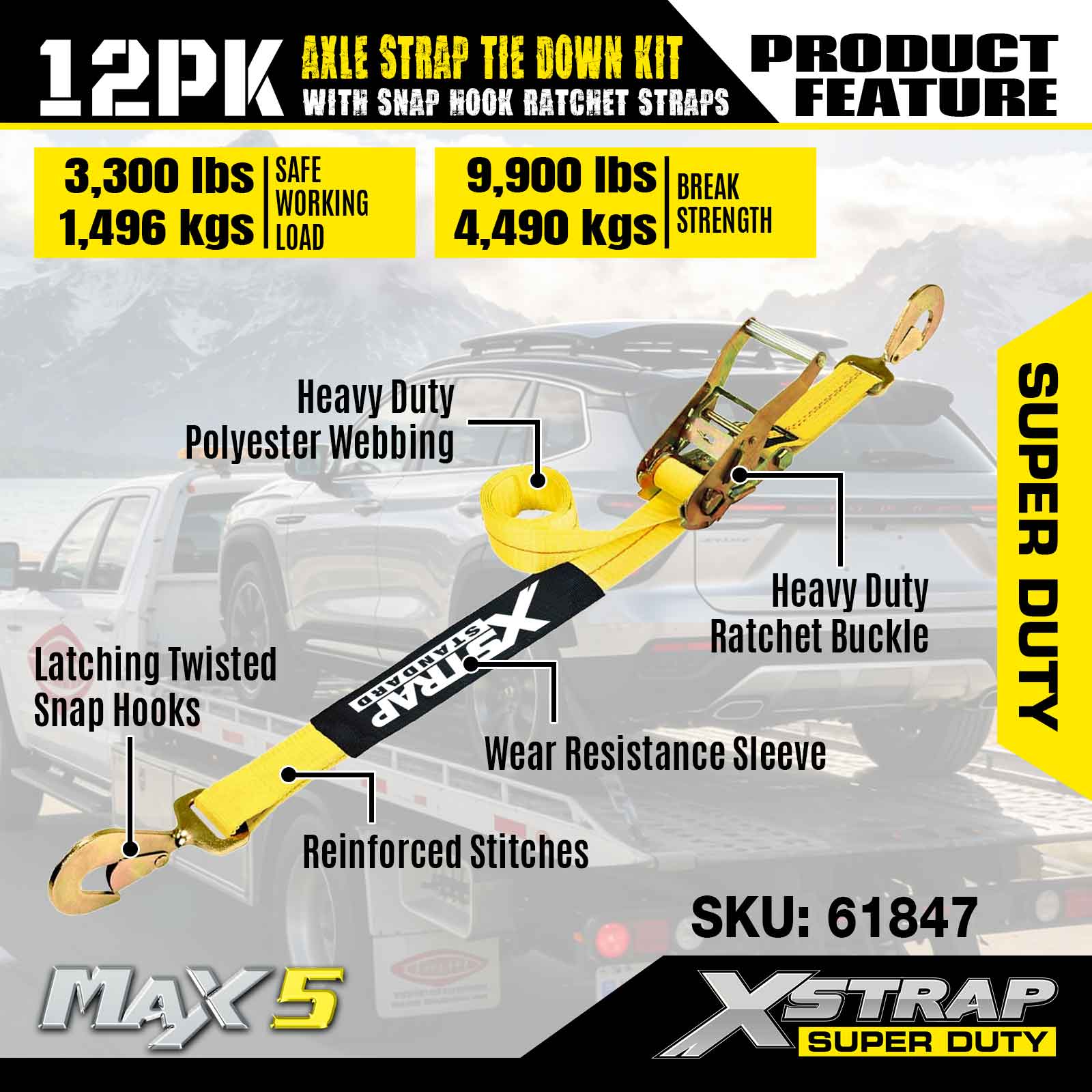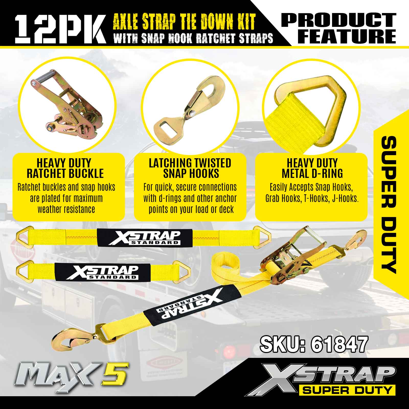 Kit de fixare a curelei de axă Xstrap 12PK (cu curele cu clichet cu cârlig) – Super Duty. Are o sarcină de lucru sigură de 3.300 lb (1.496 kg) și o rezistență la rupere de 10.000 lb (4.490 kg).