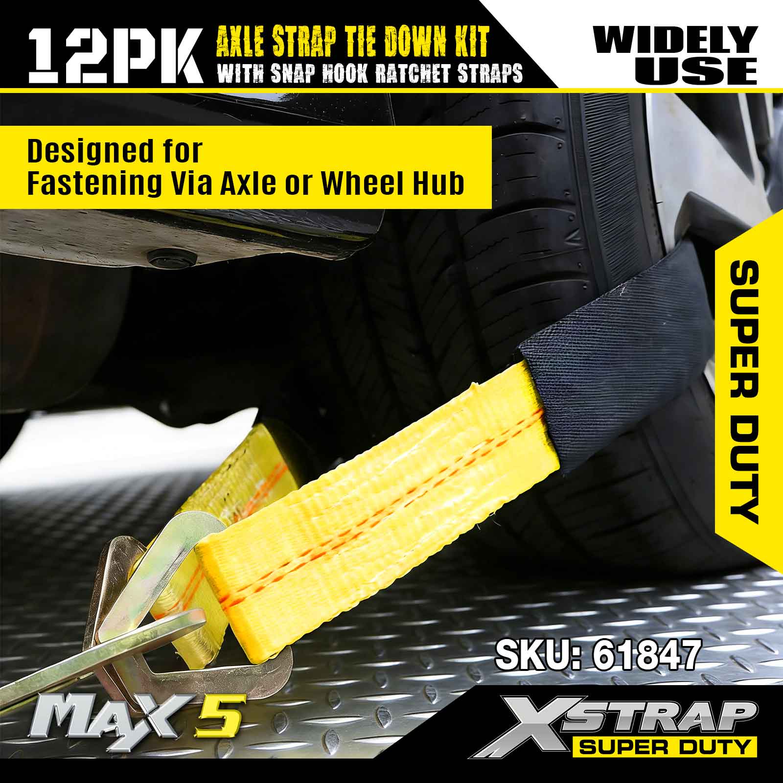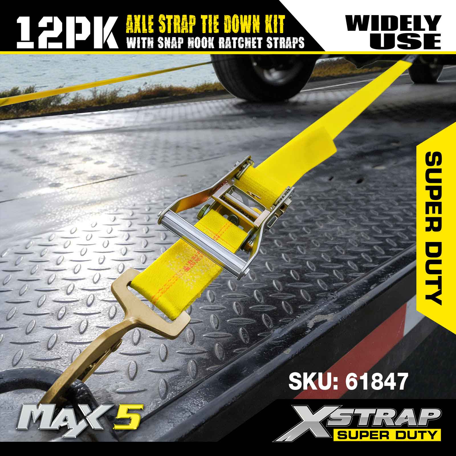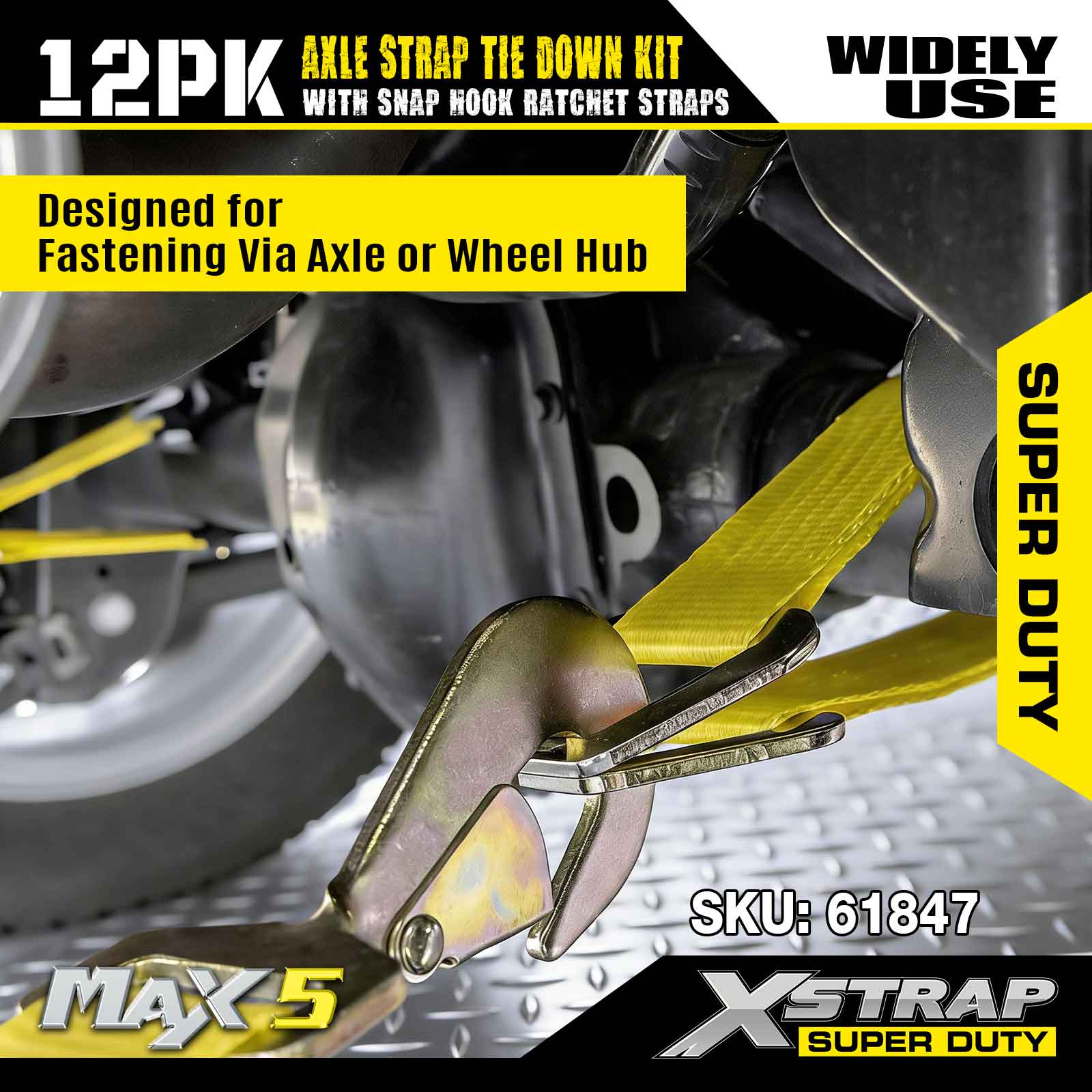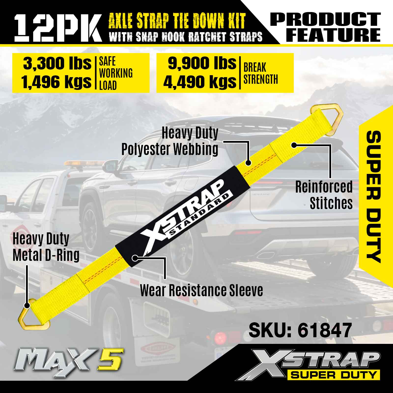 Kit de fixare a curelei de axă Xstrap 12PK (cu curele cu clichet cu cârlig) – Super Duty. Are o sarcină de lucru sigură de 3.300 lb (1.496 kg) și o rezistență la rupere de 10.000 lb (4.490 kg).
