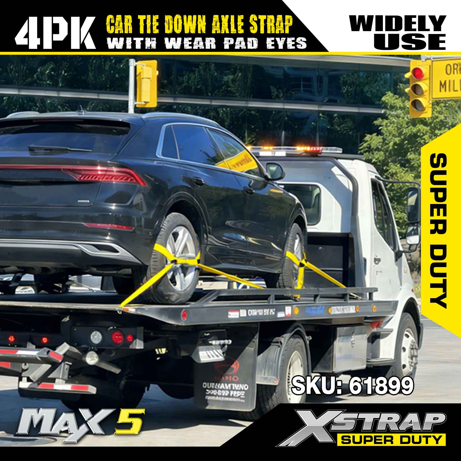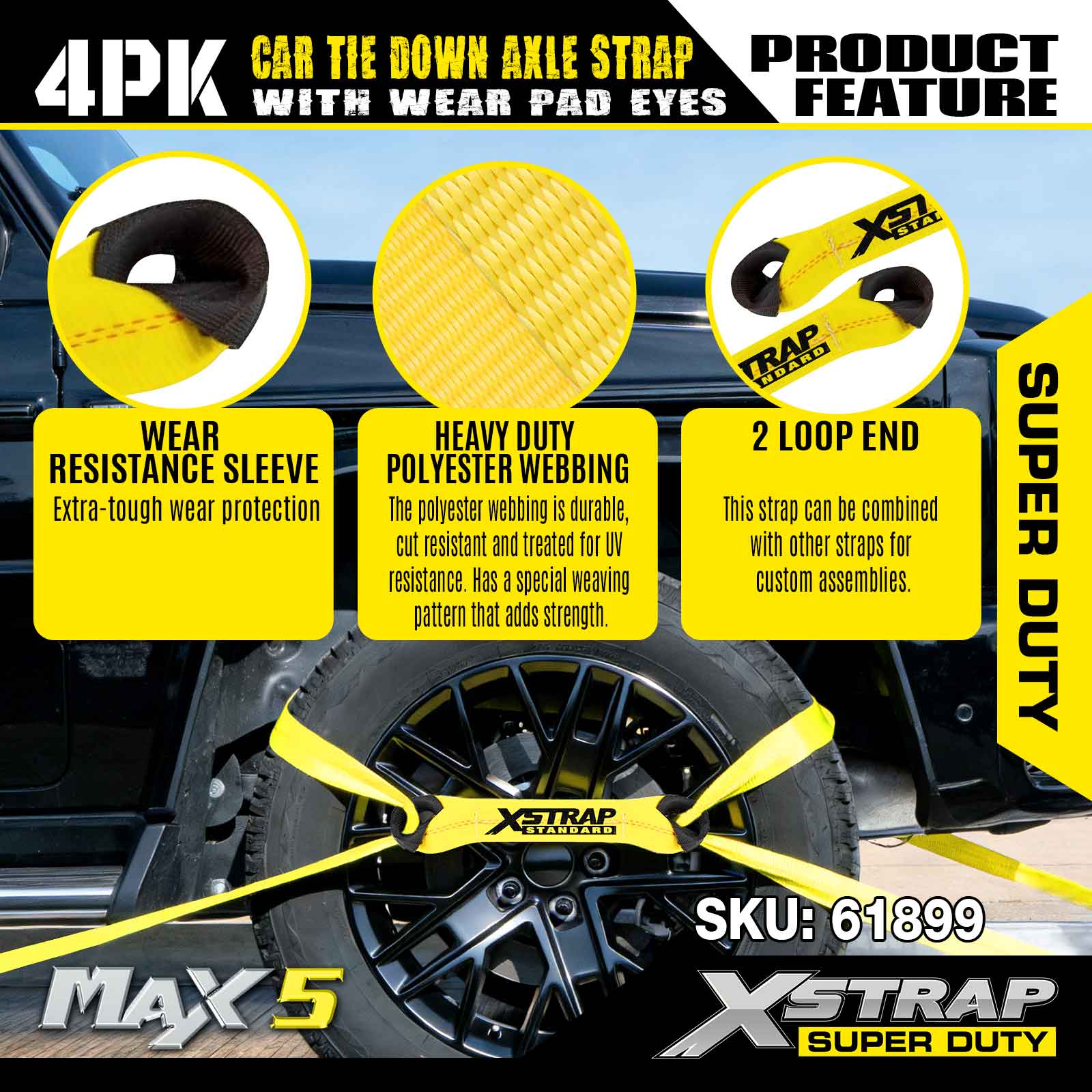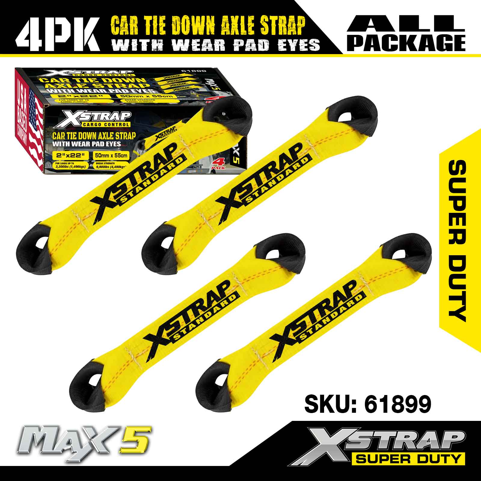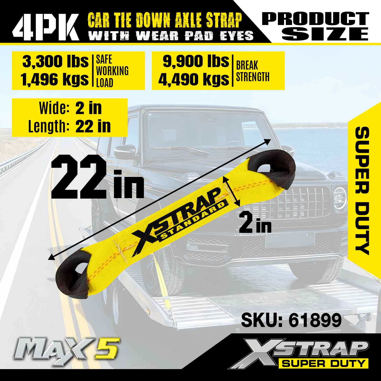 Xstrap 4PK Cureaua de fixare a axului pentru mașină (cu ochi pentru plăcuțe de uzură) – Super Duty. Are o sarcină de lucru sigură de 3.300 lb (1.496 kg) și o rezistență la rupere de 9.900 lb (4.490 kg).