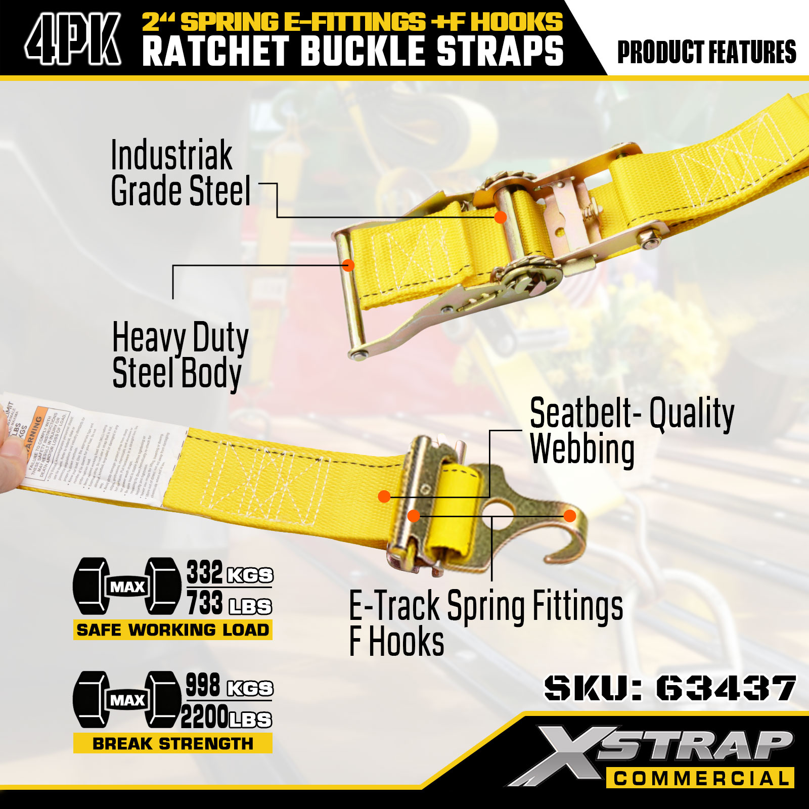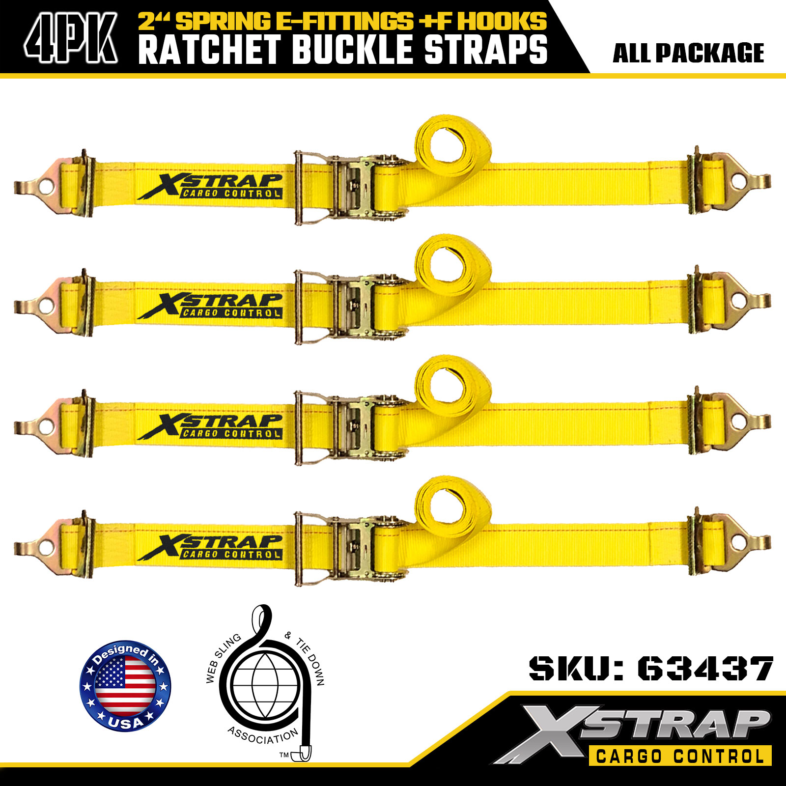 Xstrap 4 pachete de curele de fixare cu clichet pentru utilizare grea, poliester de înaltă rezistență 2" x 12 pi, cu fitinguri E și cârlige F, 733 lbs pentru remorci, camioane, furgonete și motociclete