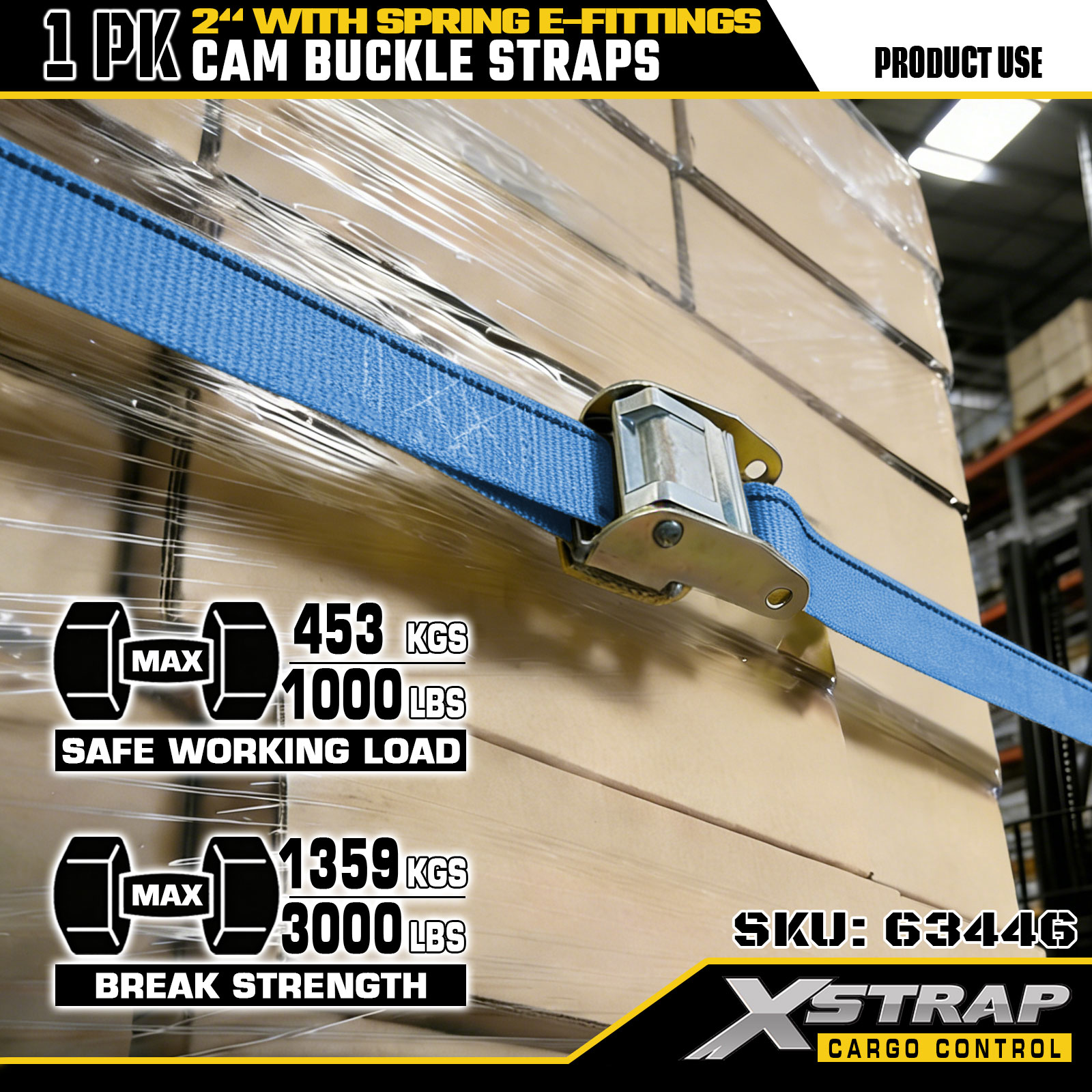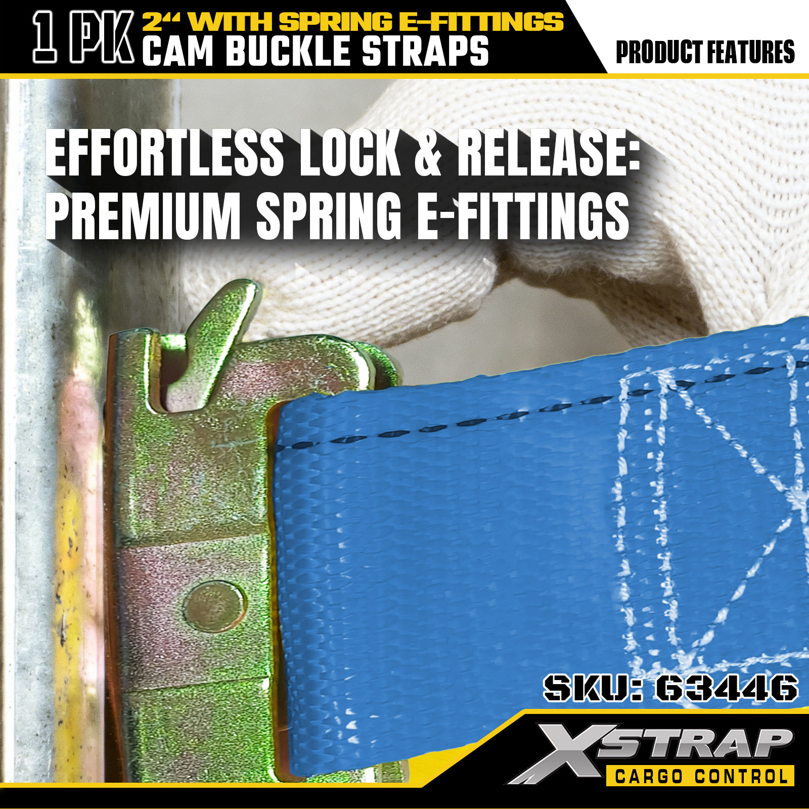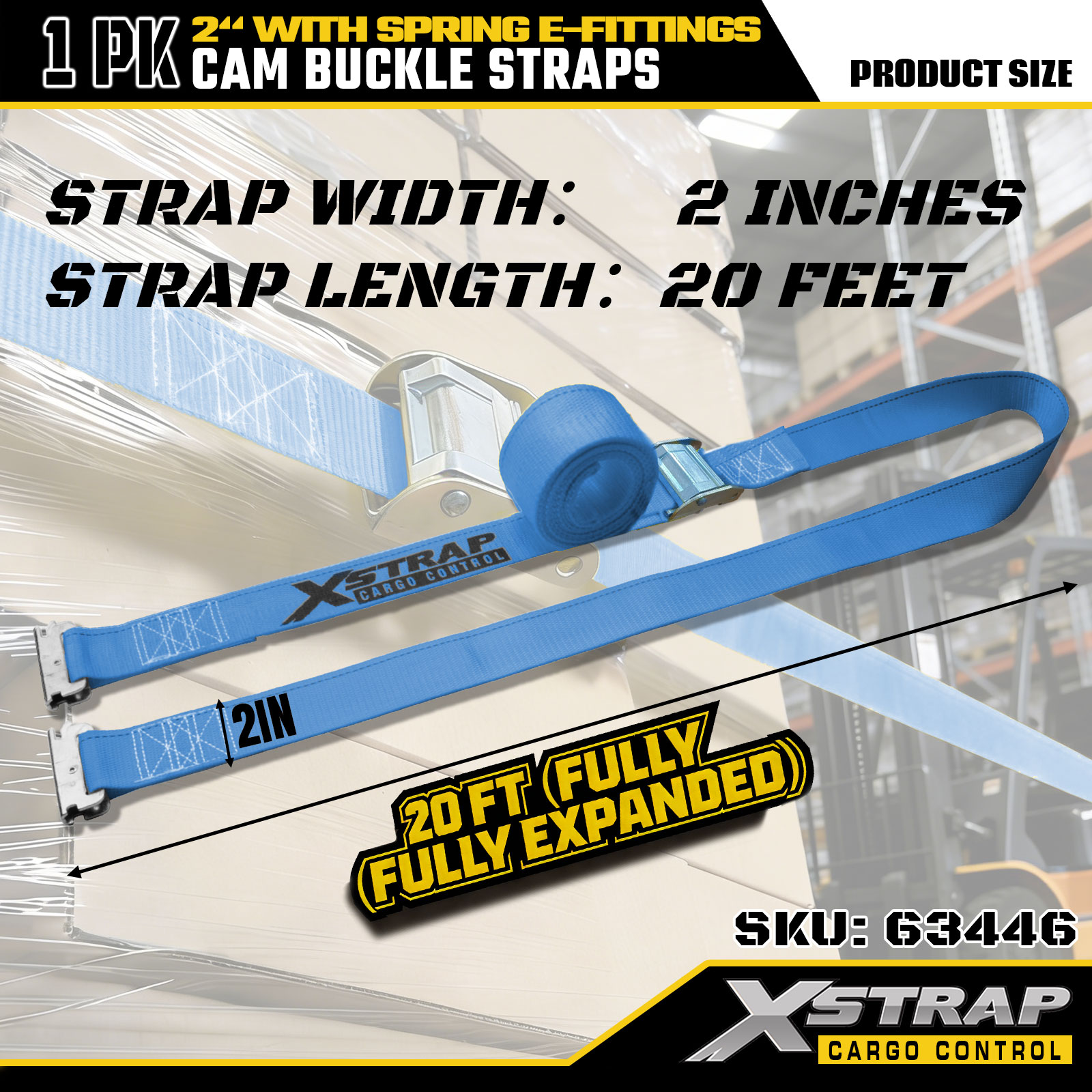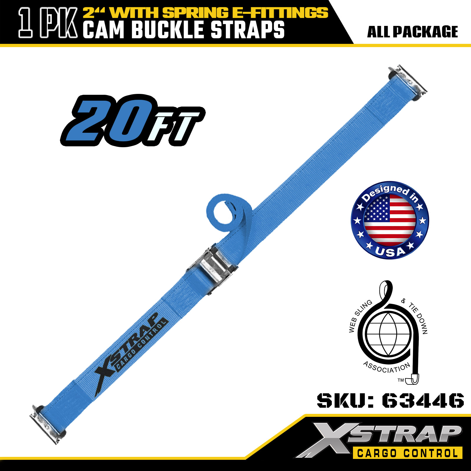 Xstrap 63446 Curea cu clichet pentru utilizare grea 2" x 20' (1PK) - poliester albastru cu accesorii E-arcuri și cârlige F, 733 lbs SWL și 332 lbs rezistență la rupere pentru controlul încărcăturii, mutarea și transportul