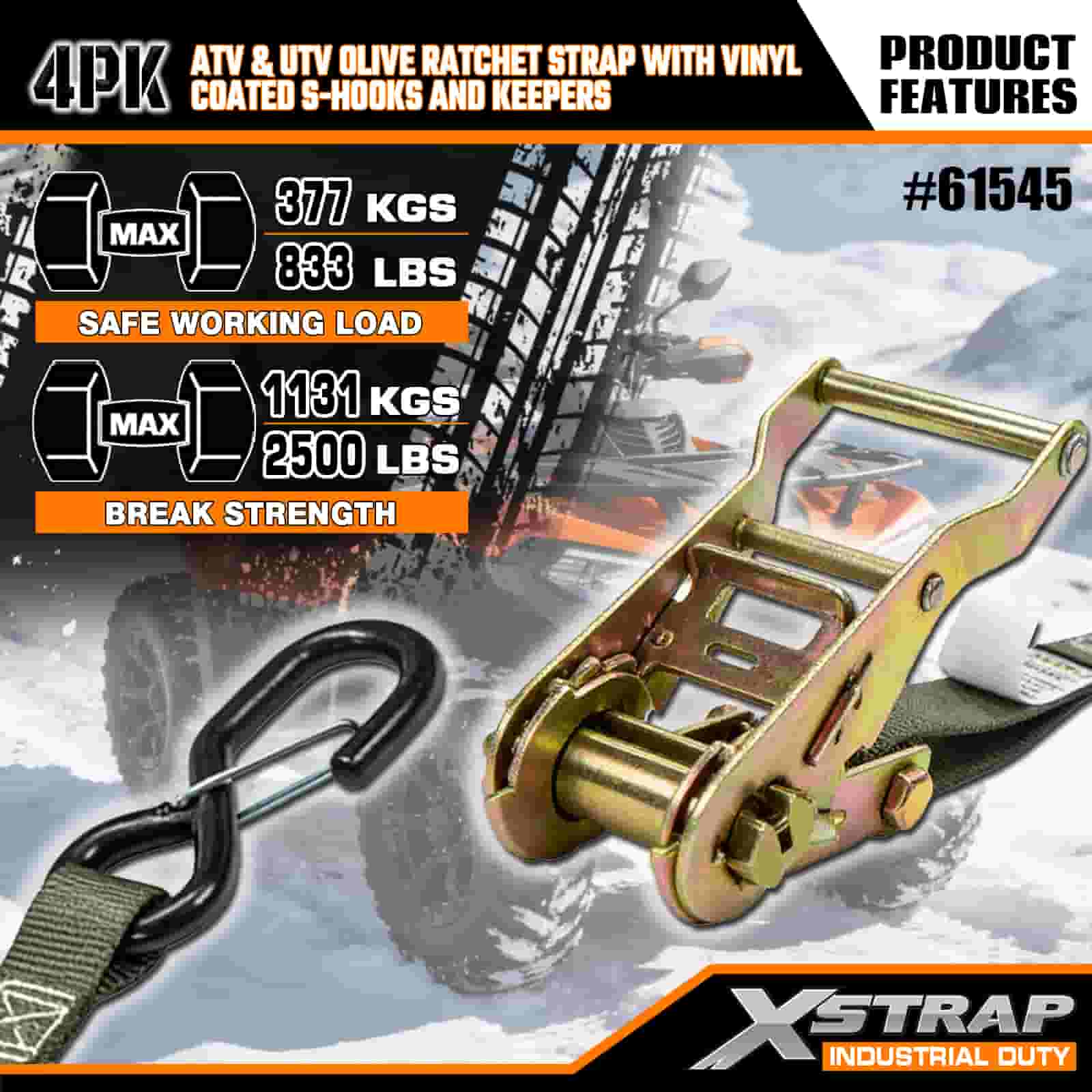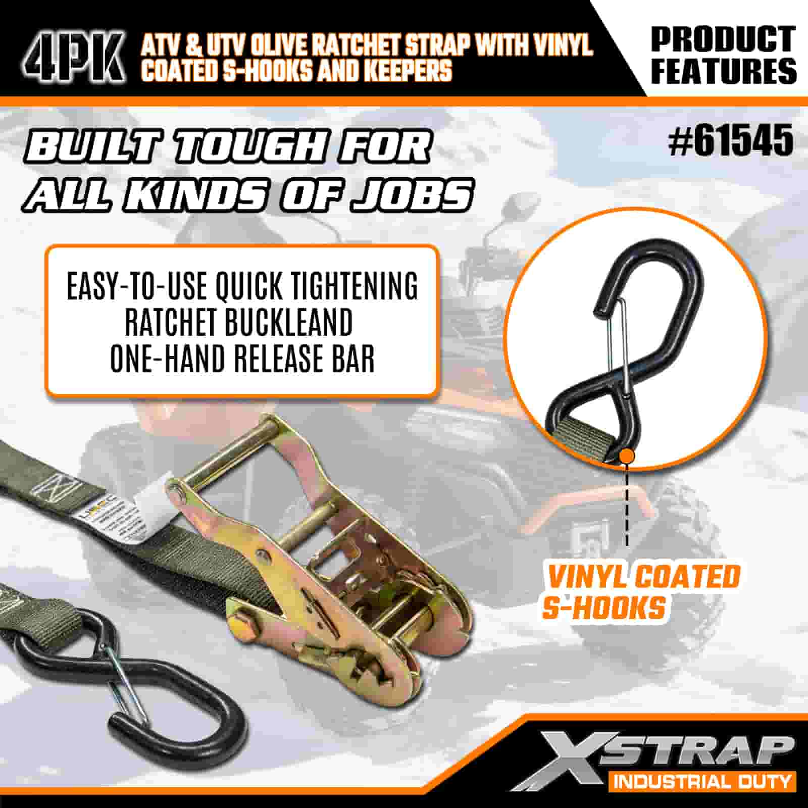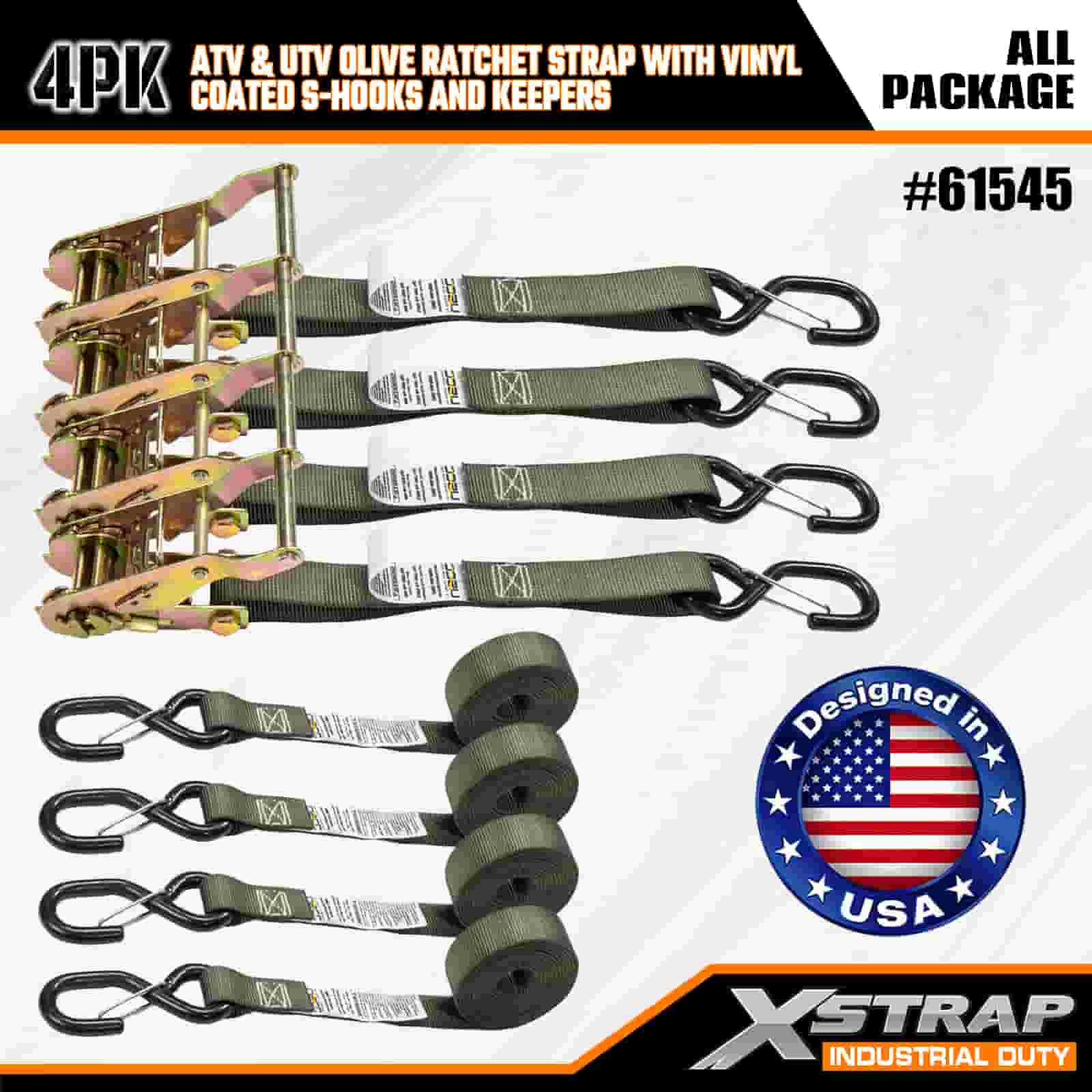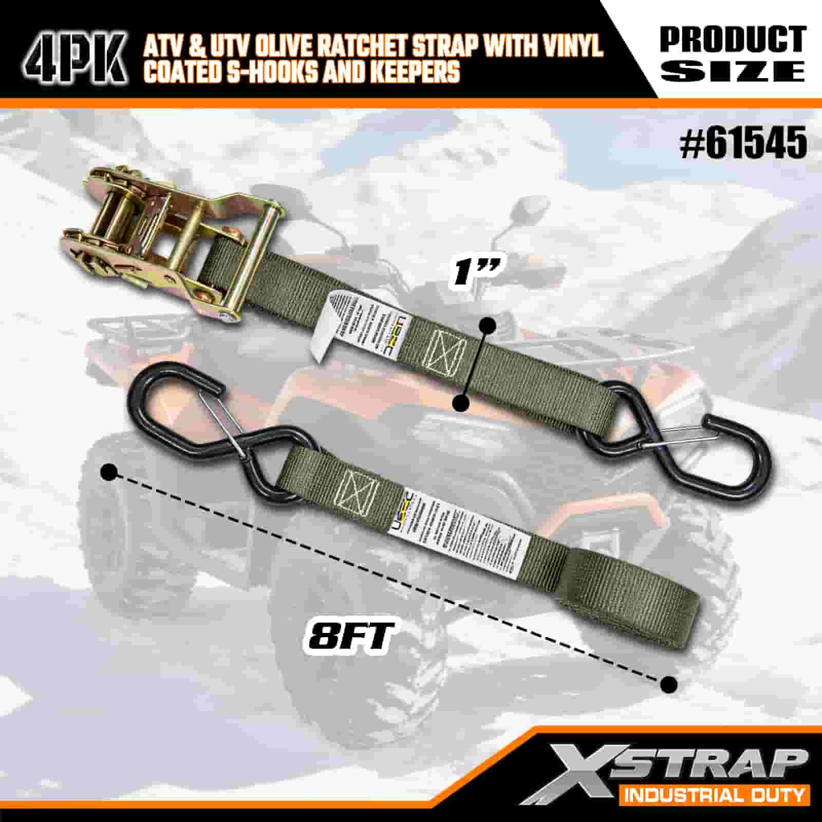Curea cu clichet Xstrap 4PK cu cârlige S de siguranță acoperite cu vinil, curea cu clichet din poliester de 1 inch x 8 pi, curele de fixare pentru ancorare de încărcătură cu o capacitate de 833 lbs cu cârlige S de siguranță pentru remorcă de mare rezistență, barcă de schi, mașină mică, echipament greu.