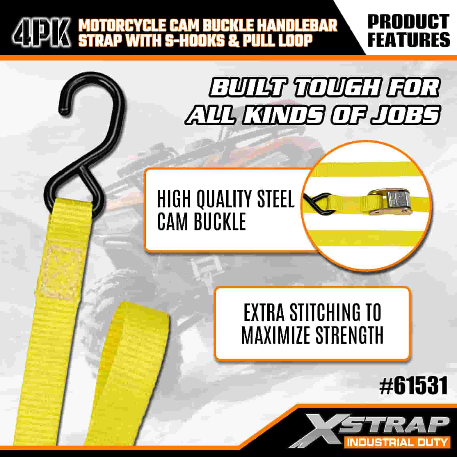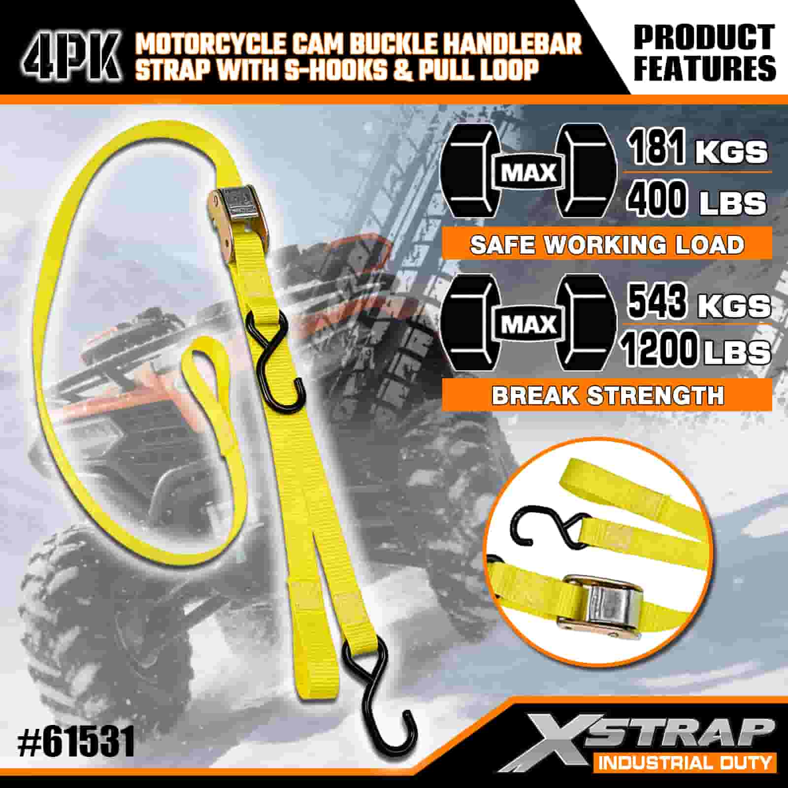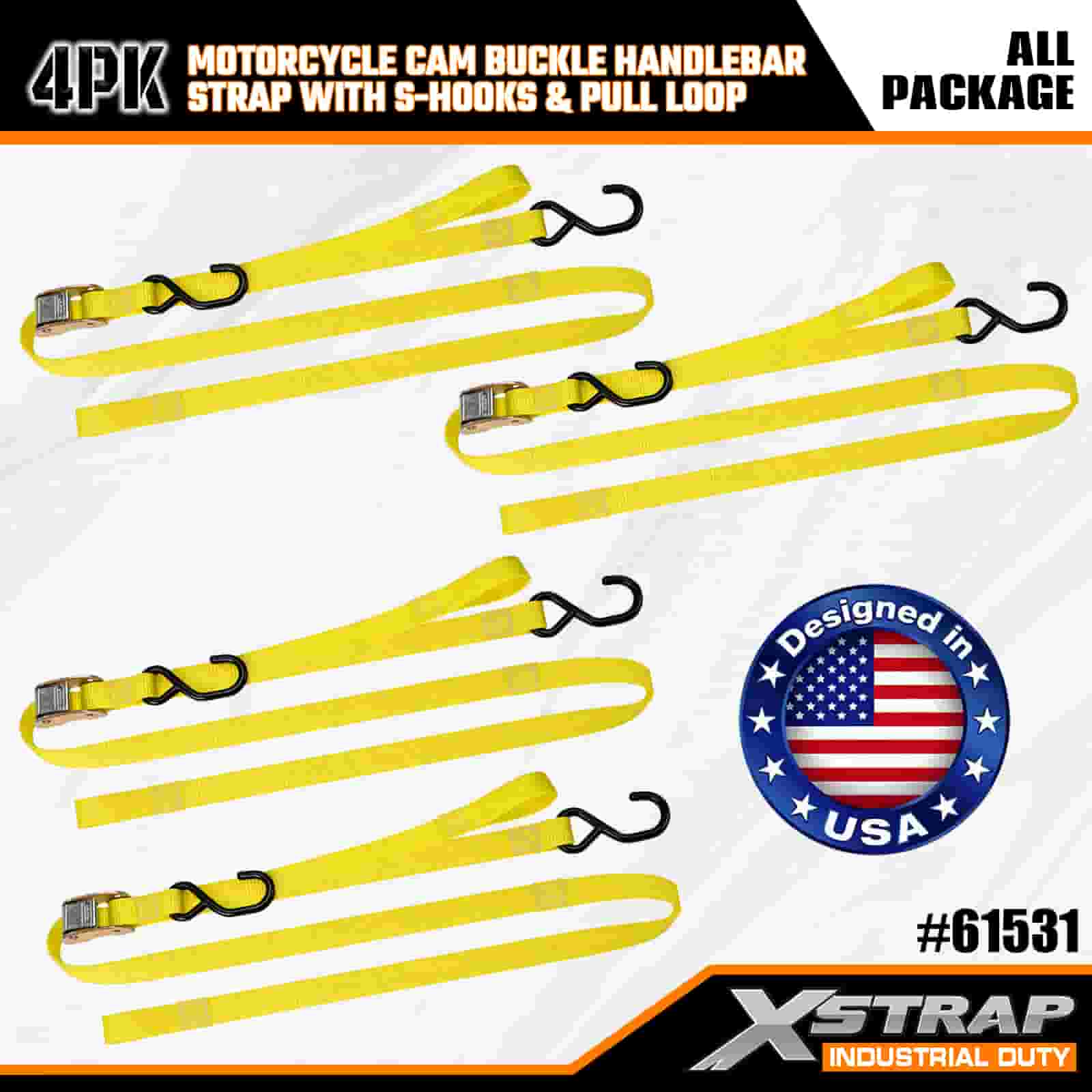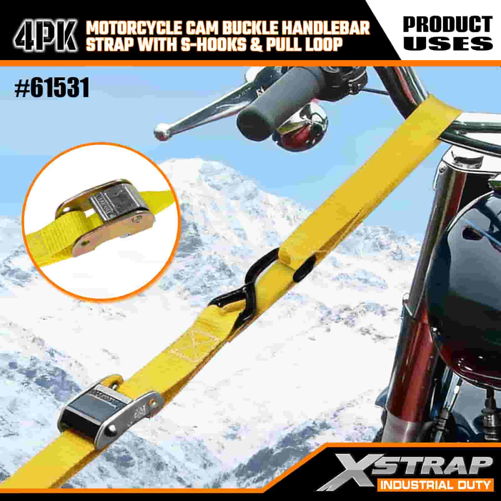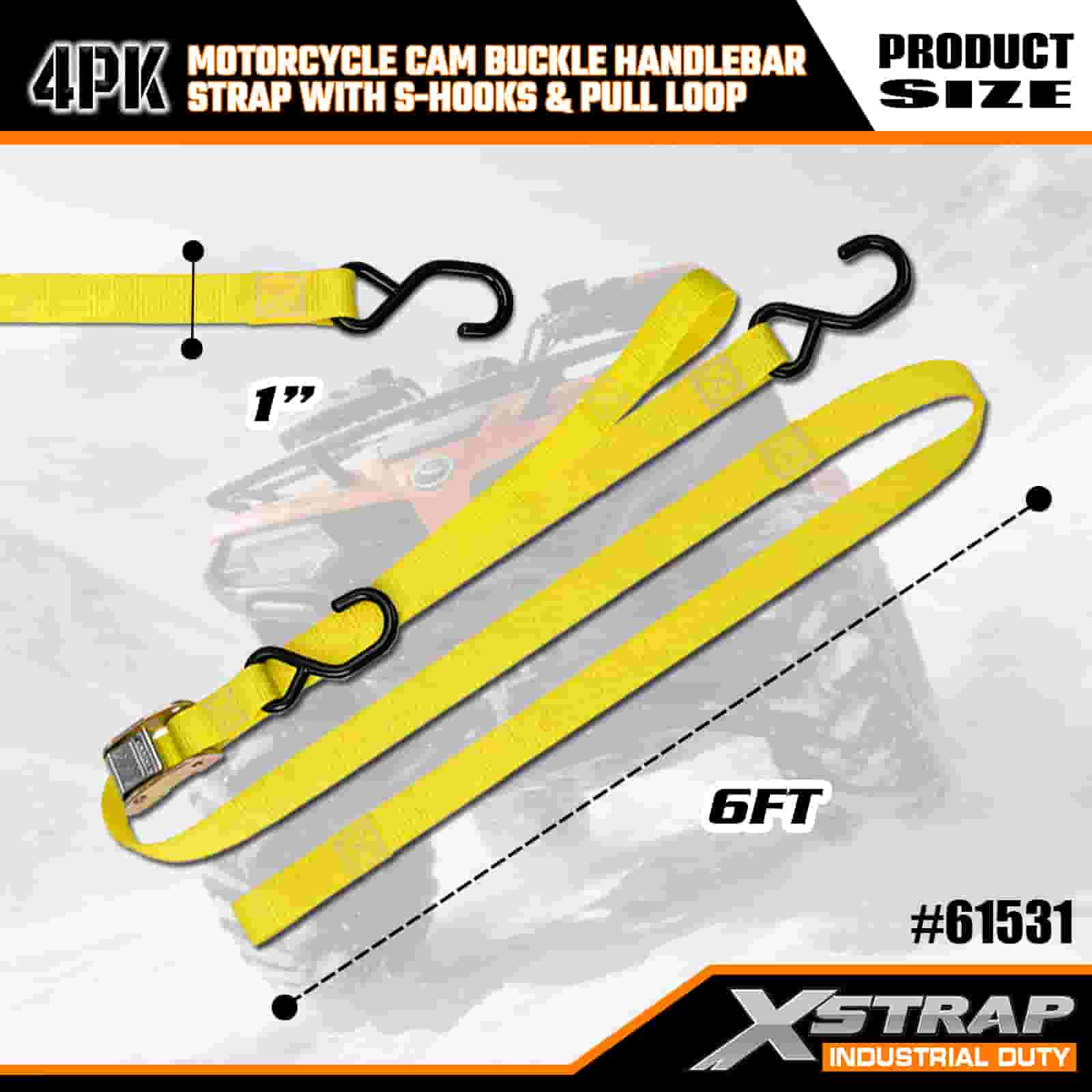 Xstrap 4PK Cureaua de ghidon cu cataramă pentru motociclete cu cârlige în S și buclă de tragere, curea de prindere din poliester de 1 inch x 6 pi Cureaua pentru cataramă cu came de tragere, curele de fixare pentru ancorare pentru încărcătură cu o capacitate de 400 lbs cu cârlige S pentru profesioniștii serioși pentru a securiza remorca de marfă, remorca cu pat plat, barca de schi, mașina mică.