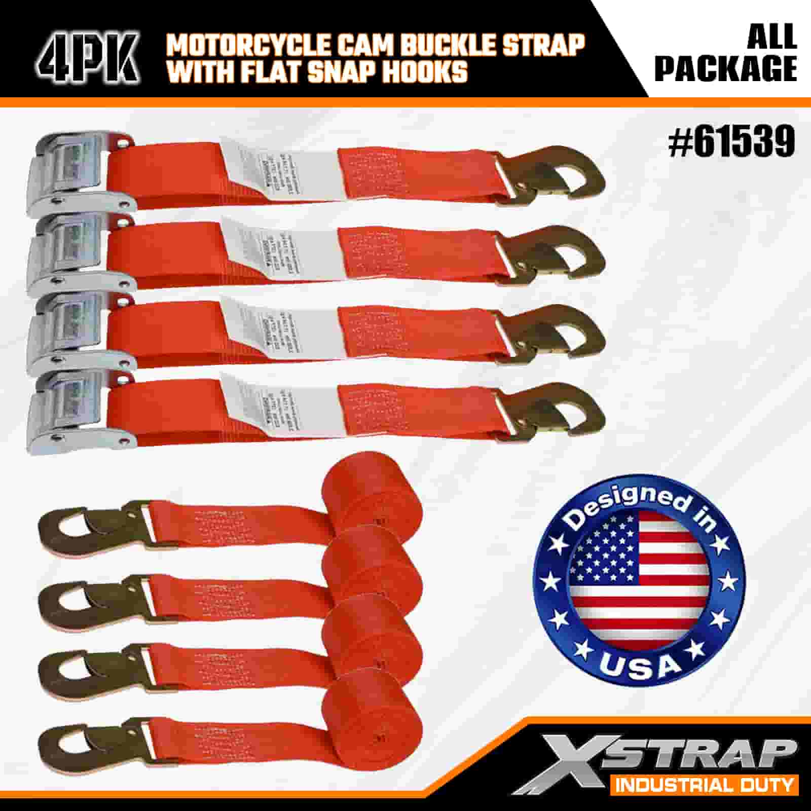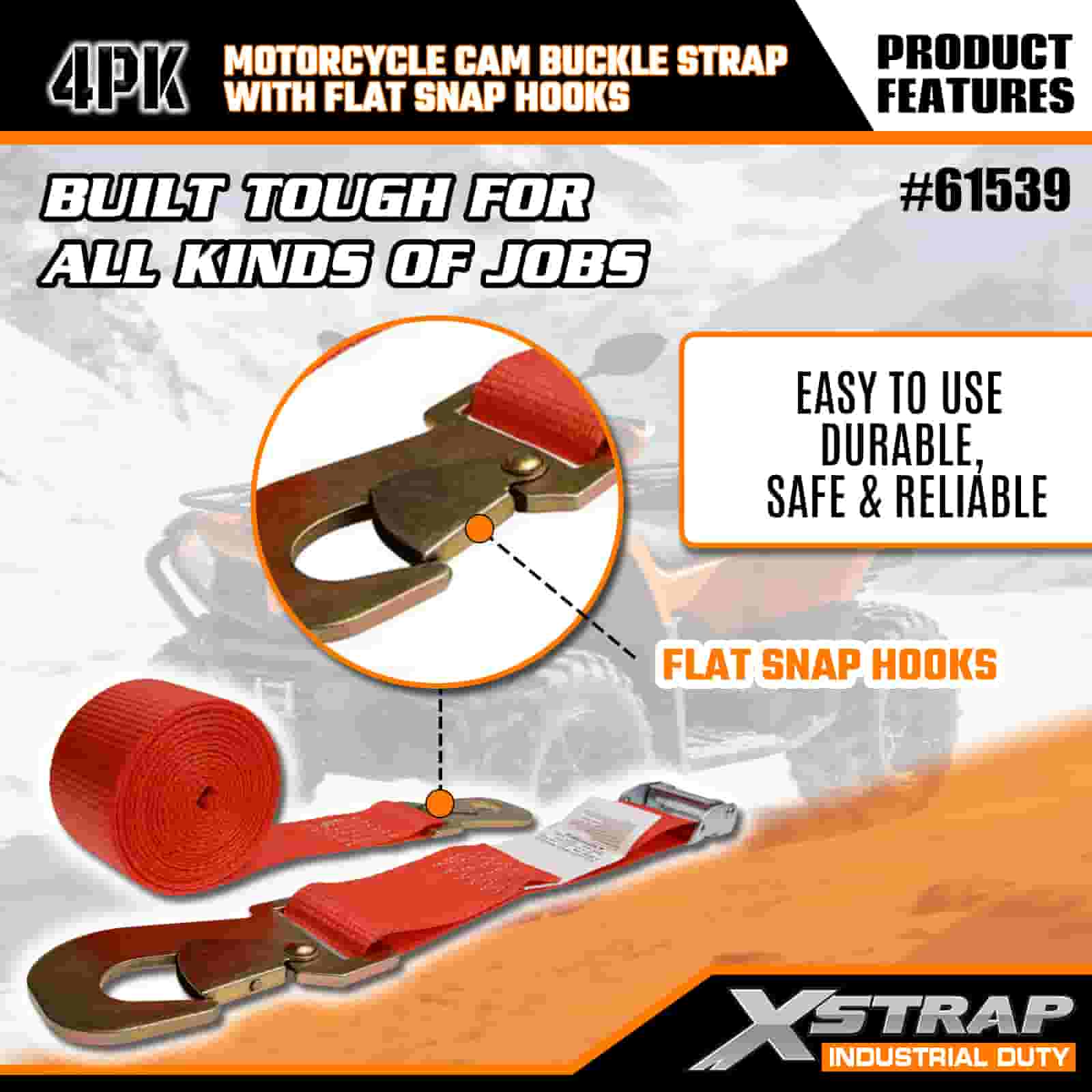 Xstrap 4PK Cureaua cu cataramă pentru motociclete cu cârlig plat, curea de fixare din poliester de 2 inchi x 8 pi Curea cu cataramă cu clichet, capacitate de 400 lb. Curele de fixare pentru ancorarea de încărcătură cu cârlig plat pentru profesioniștii serioși pentru a securiza remorca de marfă, remorca platformă, barcă de schi, mașină mică.