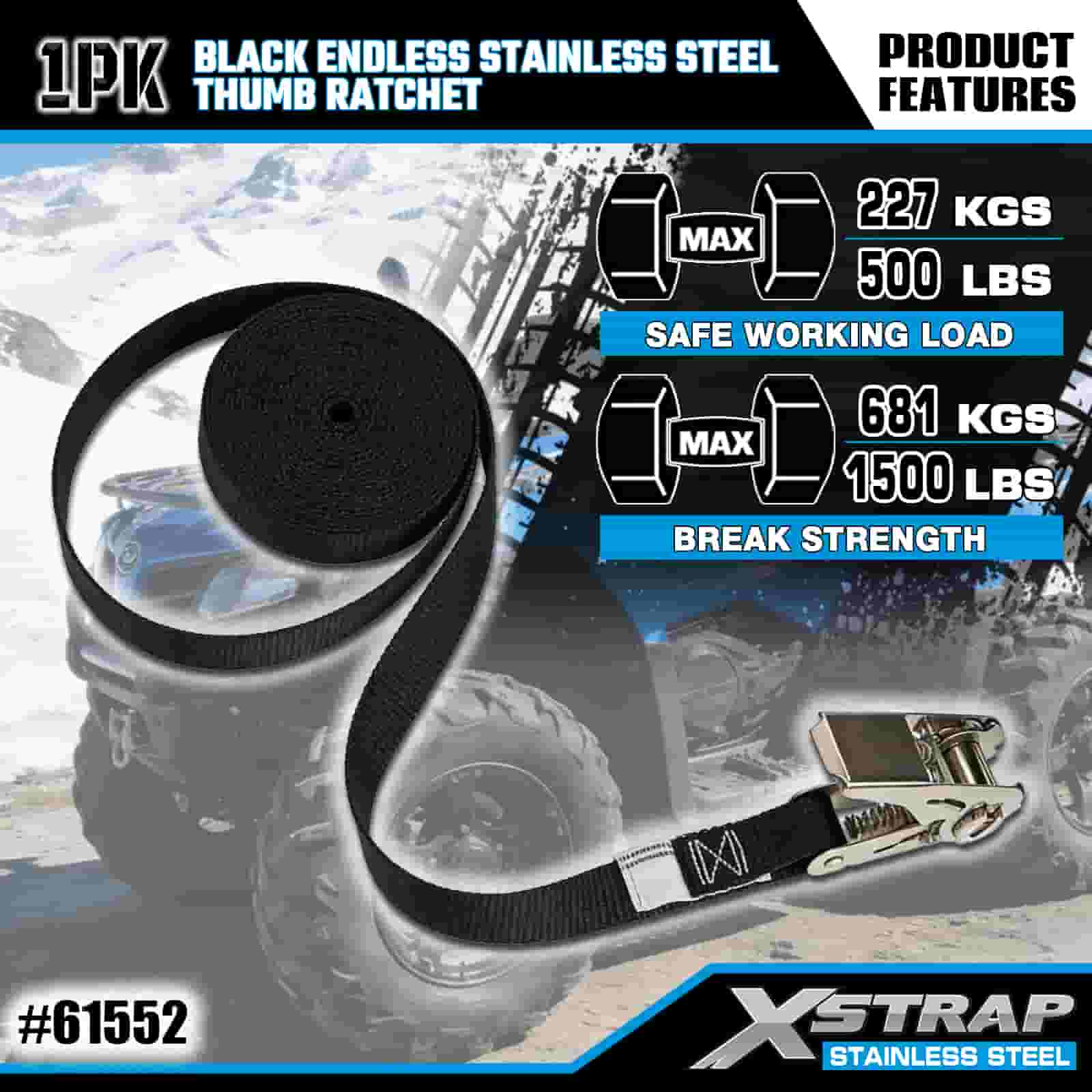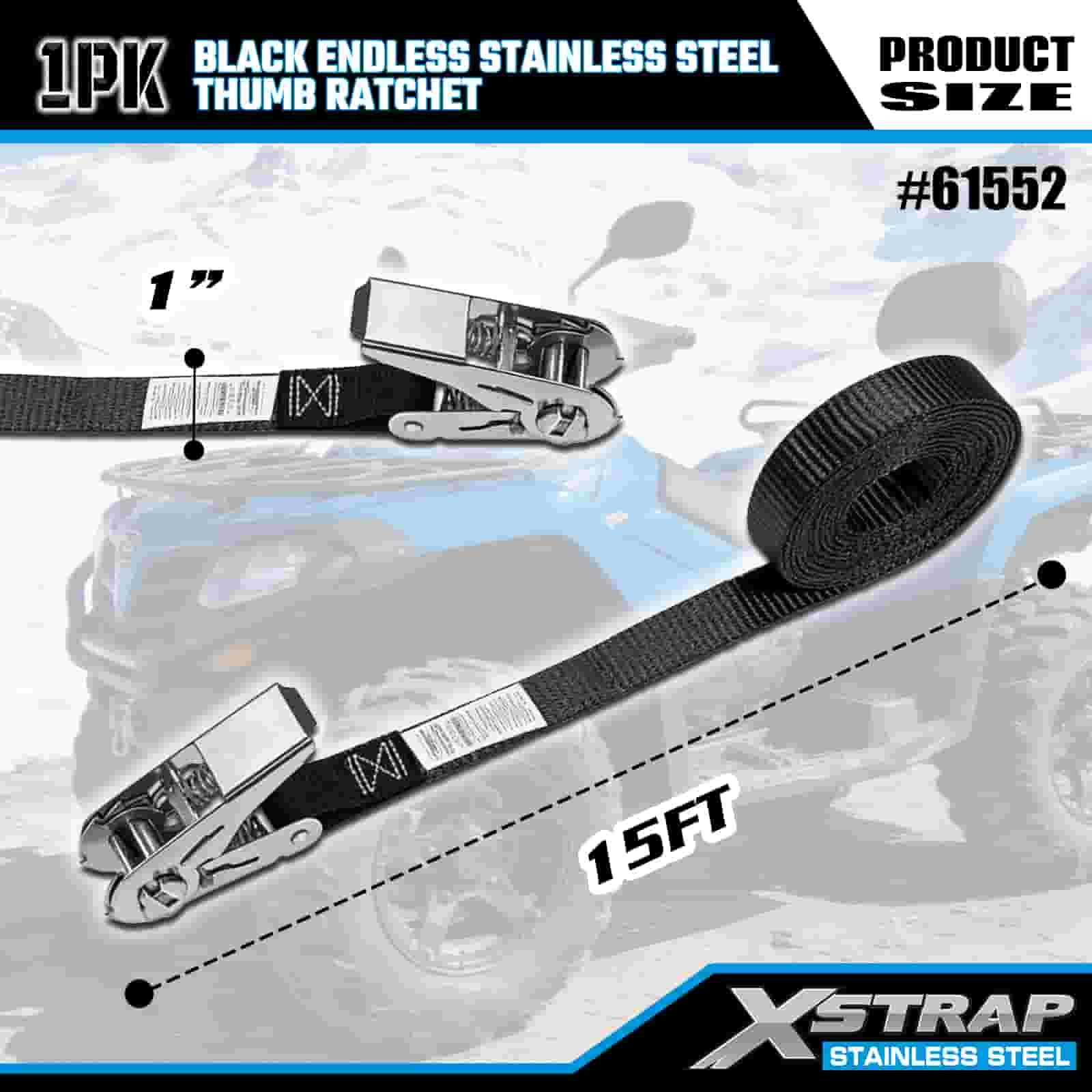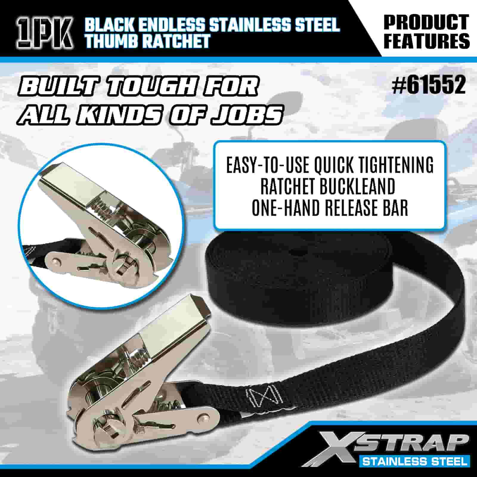 Xstrap Clichet negru fără sfârșit din oțel inoxidabil, 1” x 15’ curea de fixare din poliester curea cu clichet, curele de fixare pentru ancorare de încărcătură cu o capacitate de 500 de livre pentru remorcă, remorcă cu pat plat, barcă de schi, mașină mică, echipament greu.