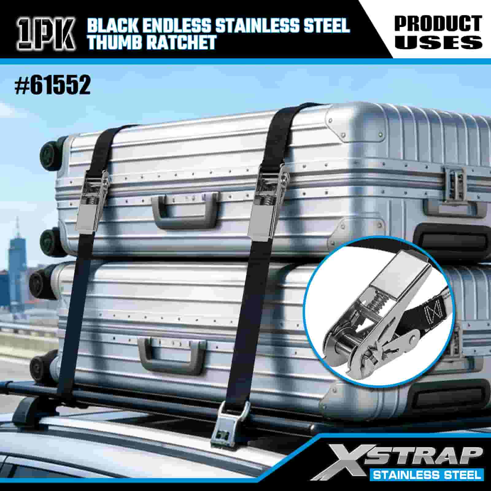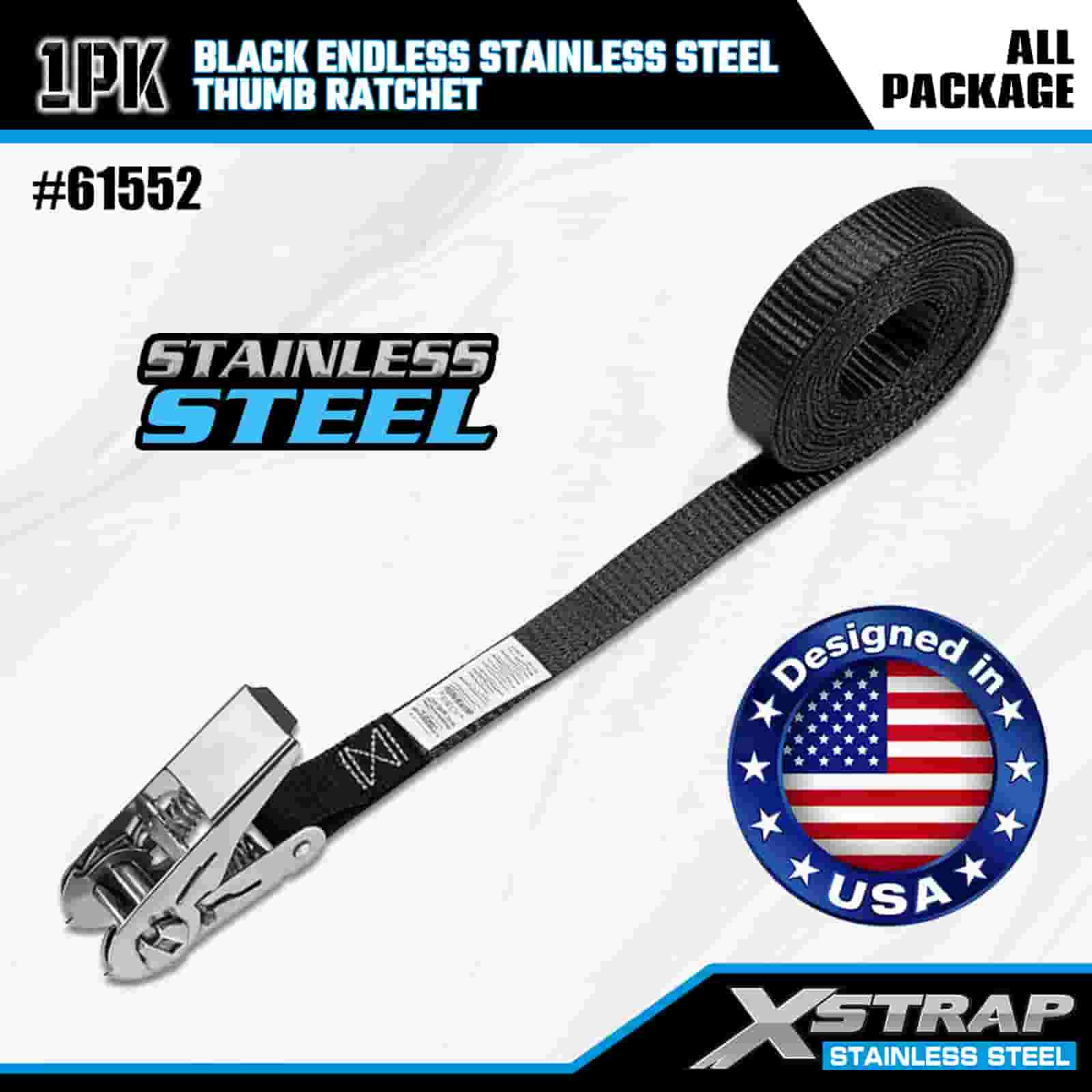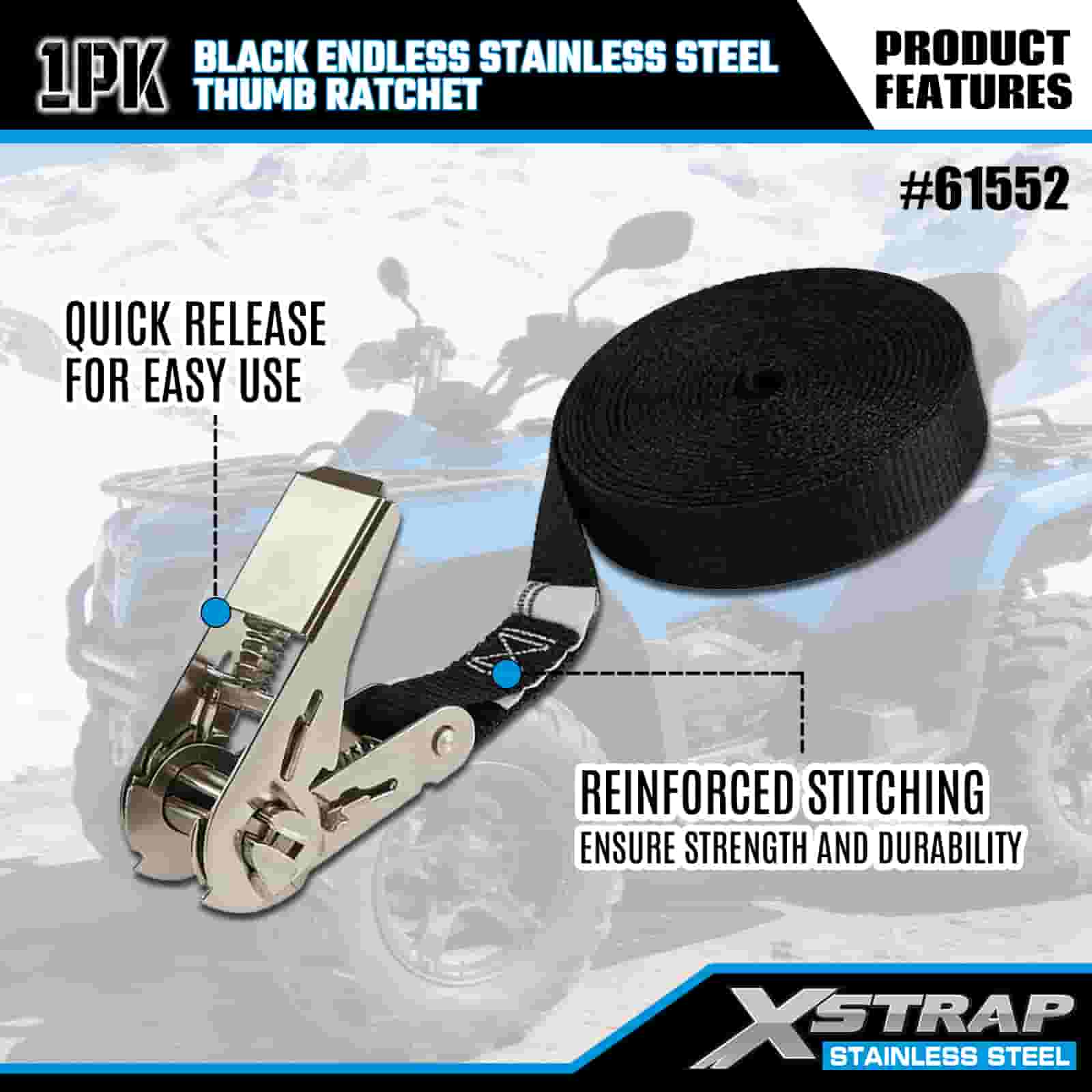 Xstrap Clichet negru fără sfârșit din oțel inoxidabil, 1” x 15’ curea de fixare din poliester curea cu clichet, curele de fixare pentru ancorare de încărcătură cu o capacitate de 500 de livre pentru remorcă, remorcă cu pat plat, barcă de schi, mașină mică, echipament greu.