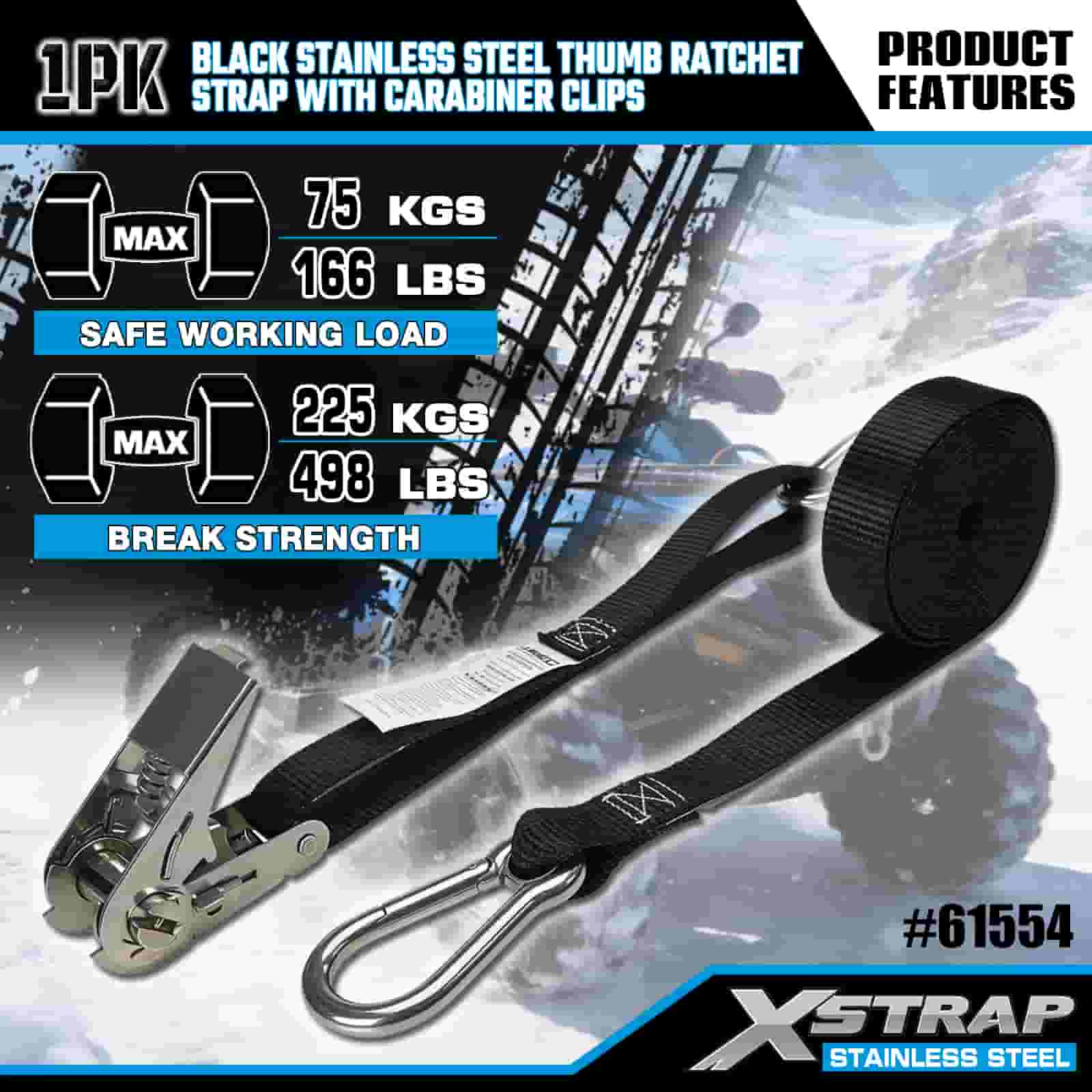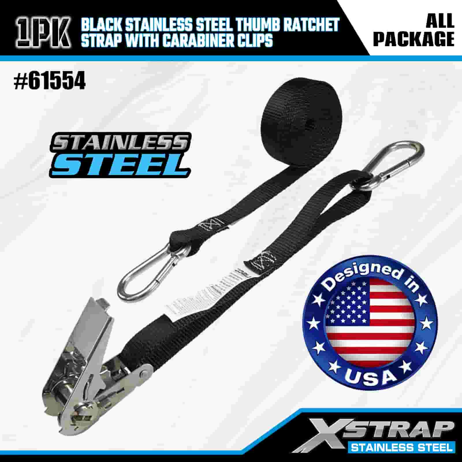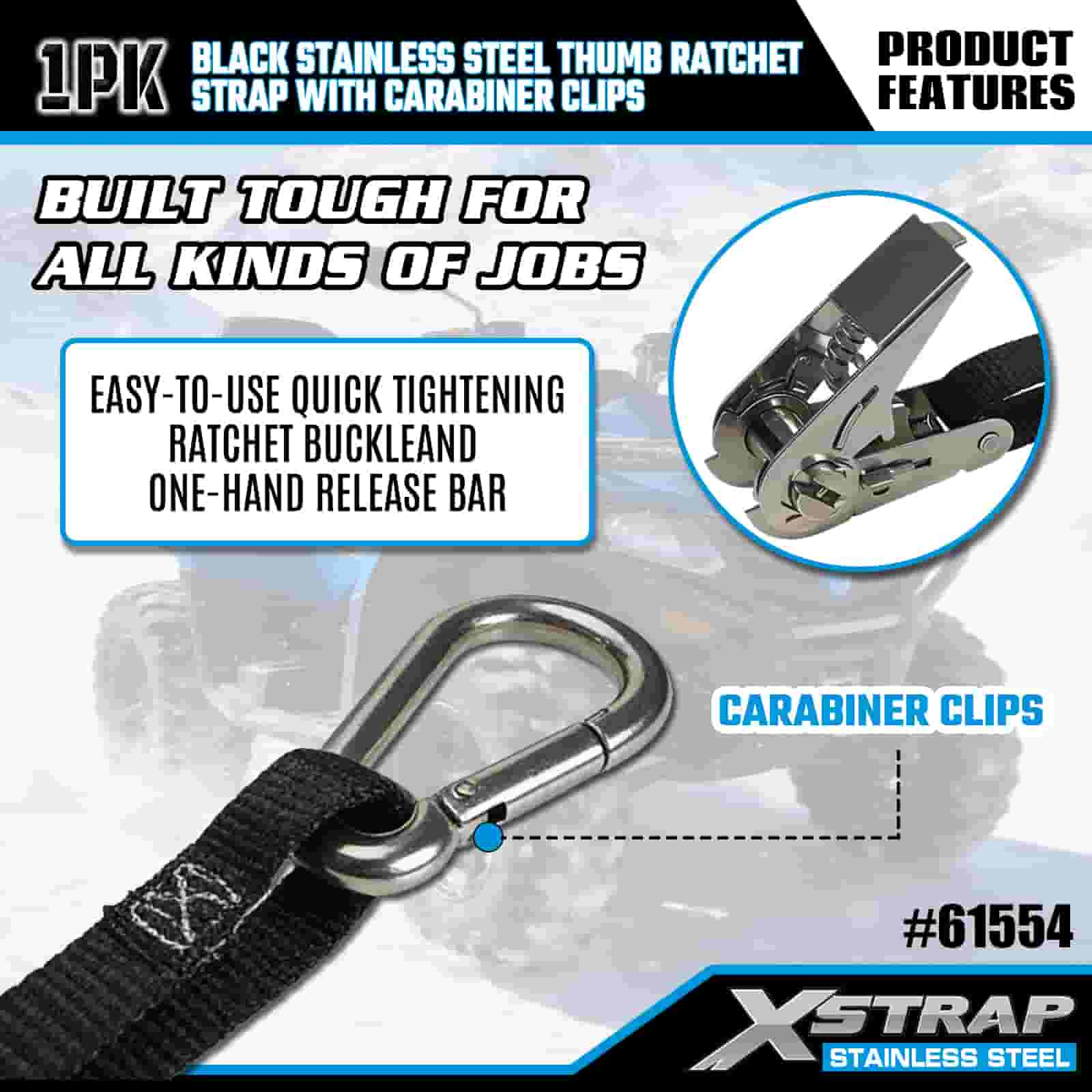 Xstrap Clife pentru degetul mare din oțel inoxidabil negru cu cleme cu carabinier, 1” x 10 pi curea din poliester cu clichet, 166 lbs Capacitate chingi de fixare pentru ancorare pentru încărcătură cu cleme carabiniere pentru remorcă, remorcă cu pat plat, barcă de schi, mașină mică, echipament greu.