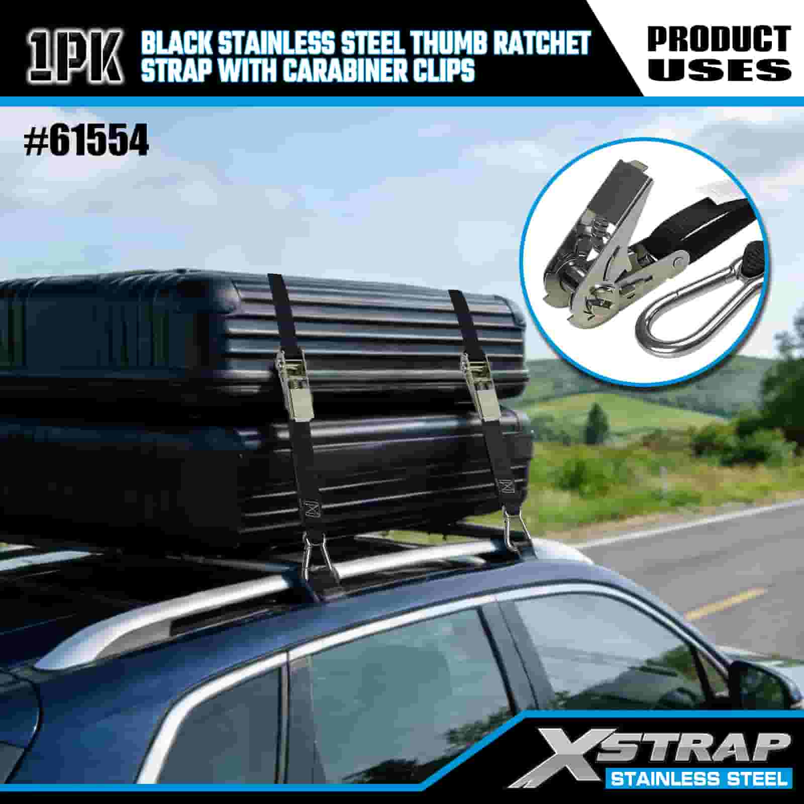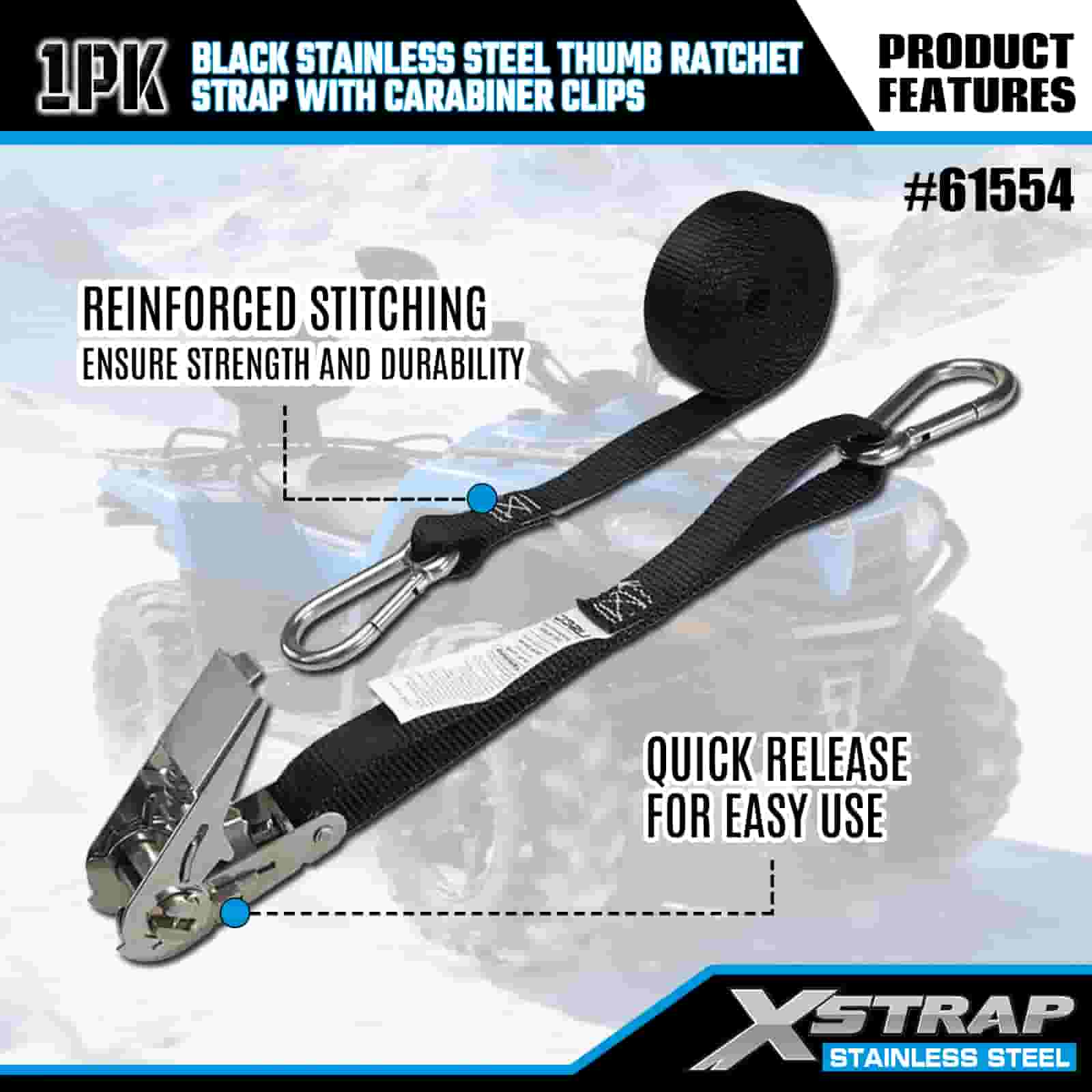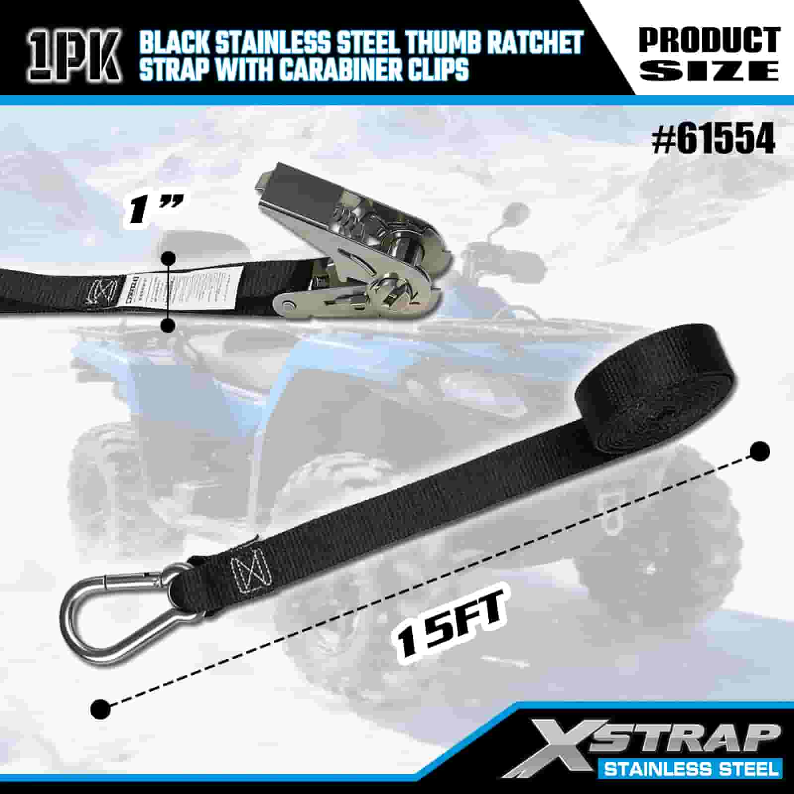 Xstrap Clife pentru degetul mare din oțel inoxidabil negru cu cleme cu carabinier, 1” x 10 pi curea din poliester cu clichet, 166 lbs Capacitate chingi de fixare pentru ancorare pentru încărcătură cu cleme carabiniere pentru remorcă, remorcă cu pat plat, barcă de schi, mașină mică, echipament greu.