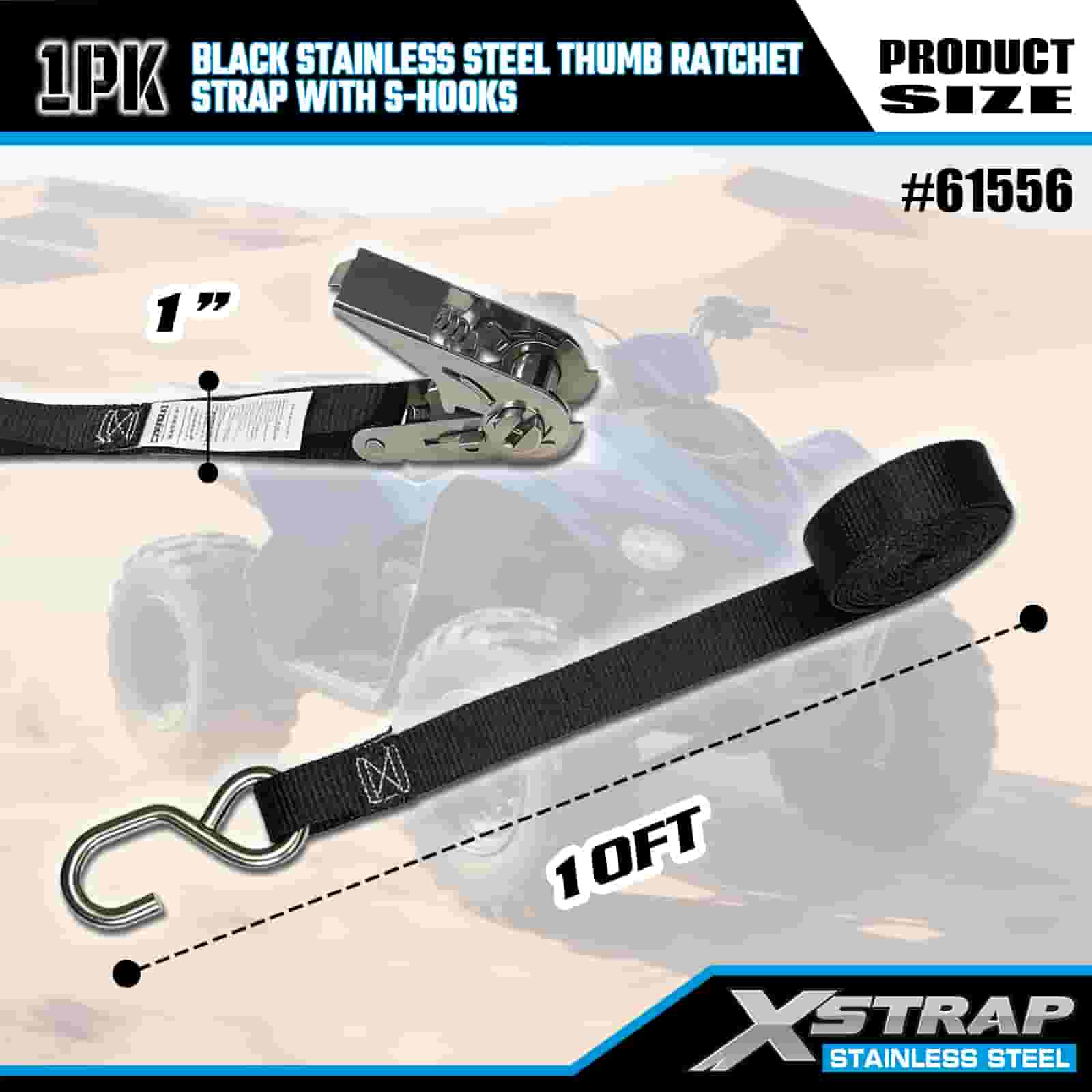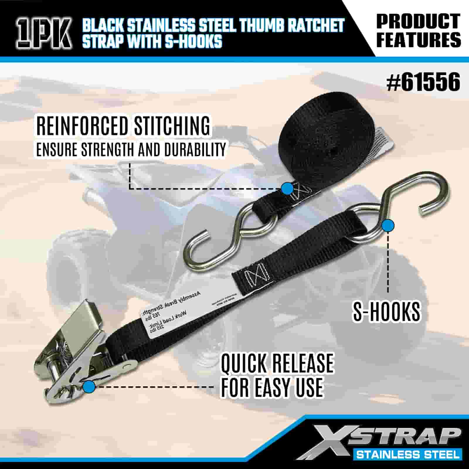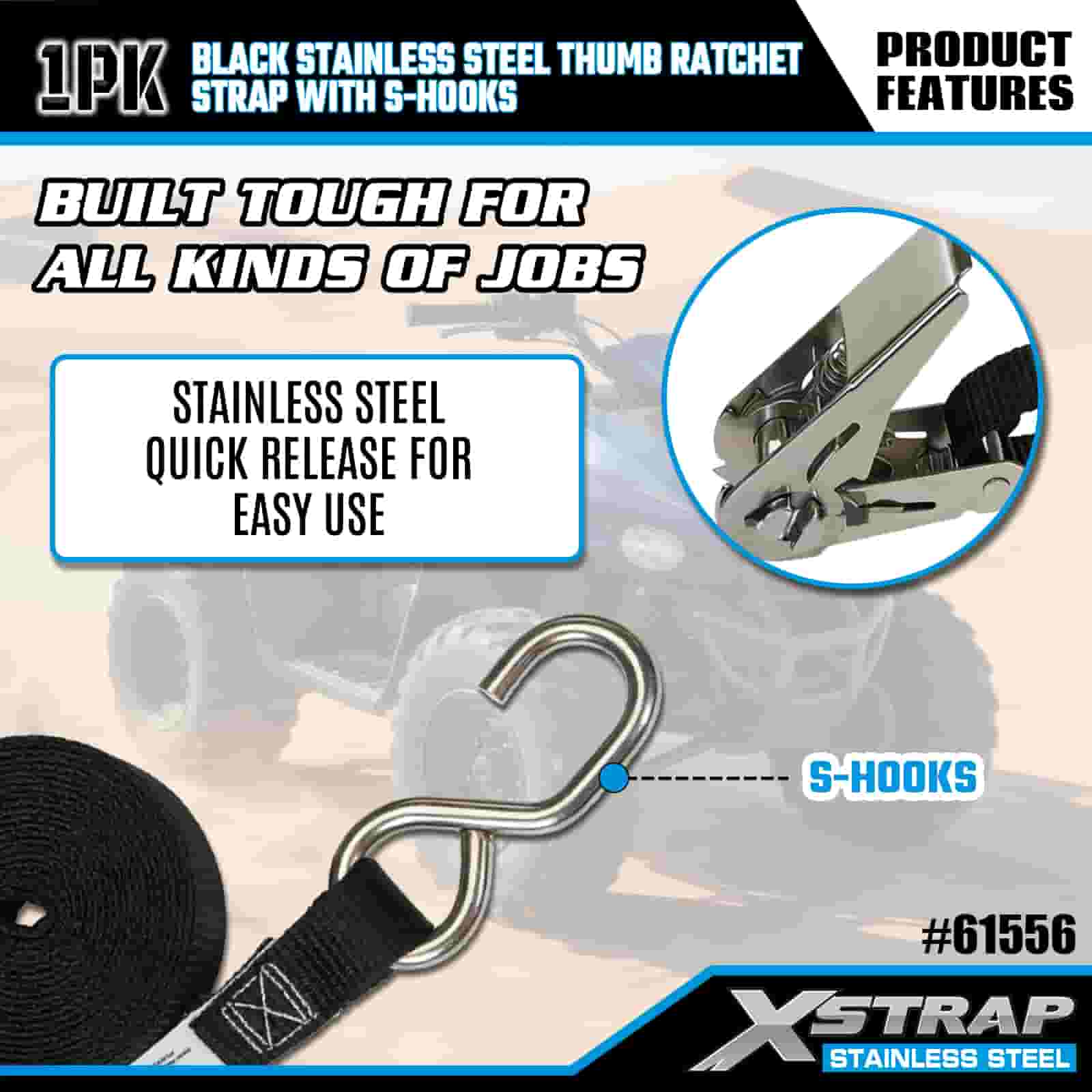Xstrap Clichet cu degetul mare din oțel inoxidabil negru cu cârlige S, 1 inch x 10 pi curea de fixare din poliester curea cu clichet, 255 lbs capacitate chingi de fixare pentru ancorare pentru încărcătură cu cârlige S pentru remorcă, remorcă cu pat plat, barcă de schi, mașină mică, echipament greu.
