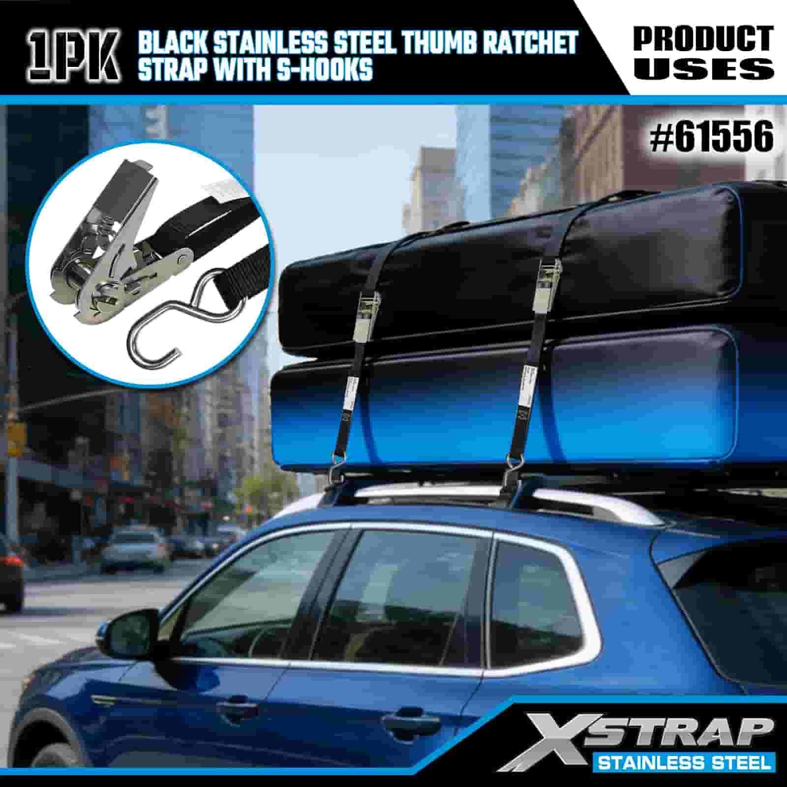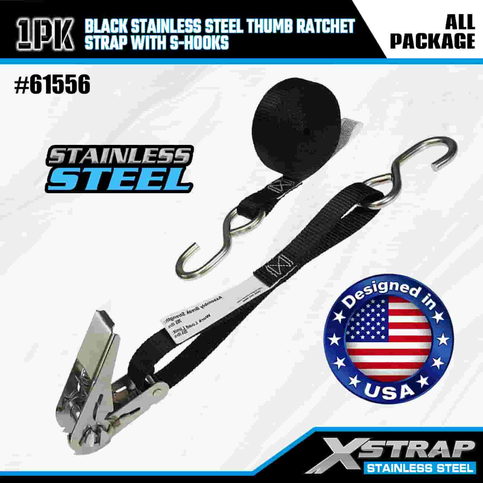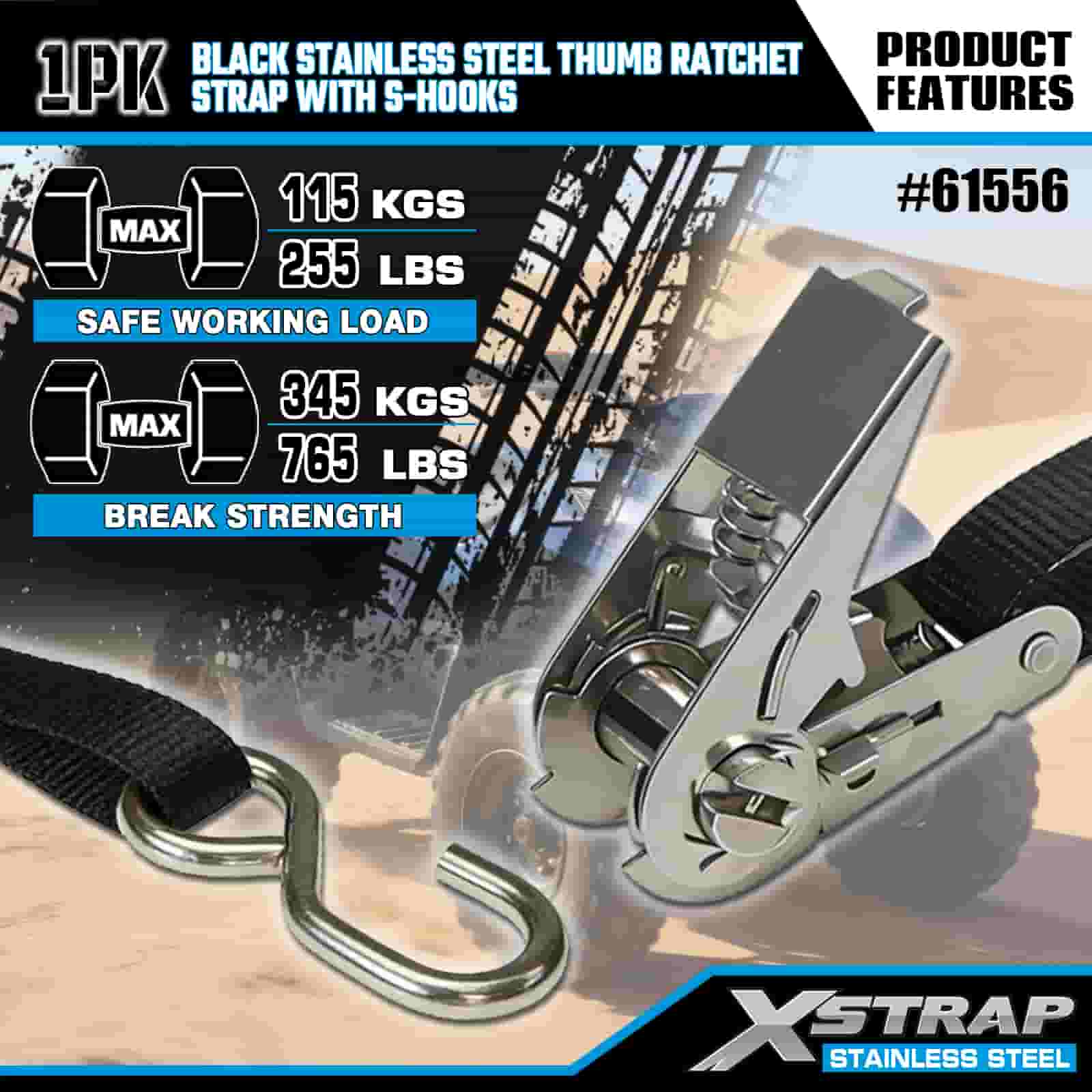 Xstrap Clichet cu degetul mare din oțel inoxidabil negru cu cârlige S, 1 inch x 10 pi curea de fixare din poliester curea cu clichet, 255 lbs capacitate chingi de fixare pentru ancorare pentru încărcătură cu cârlige S pentru remorcă, remorcă cu pat plat, barcă de schi, mașină mică, echipament greu.
