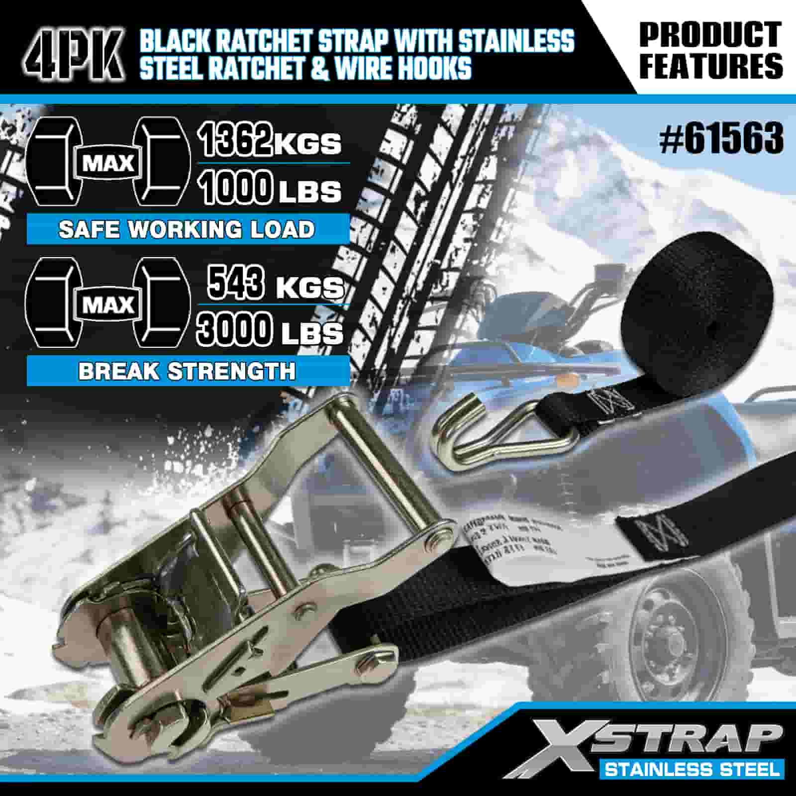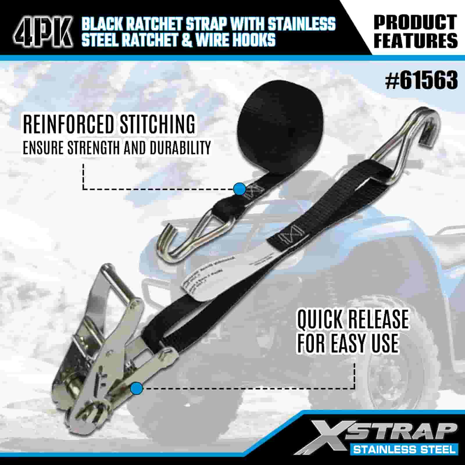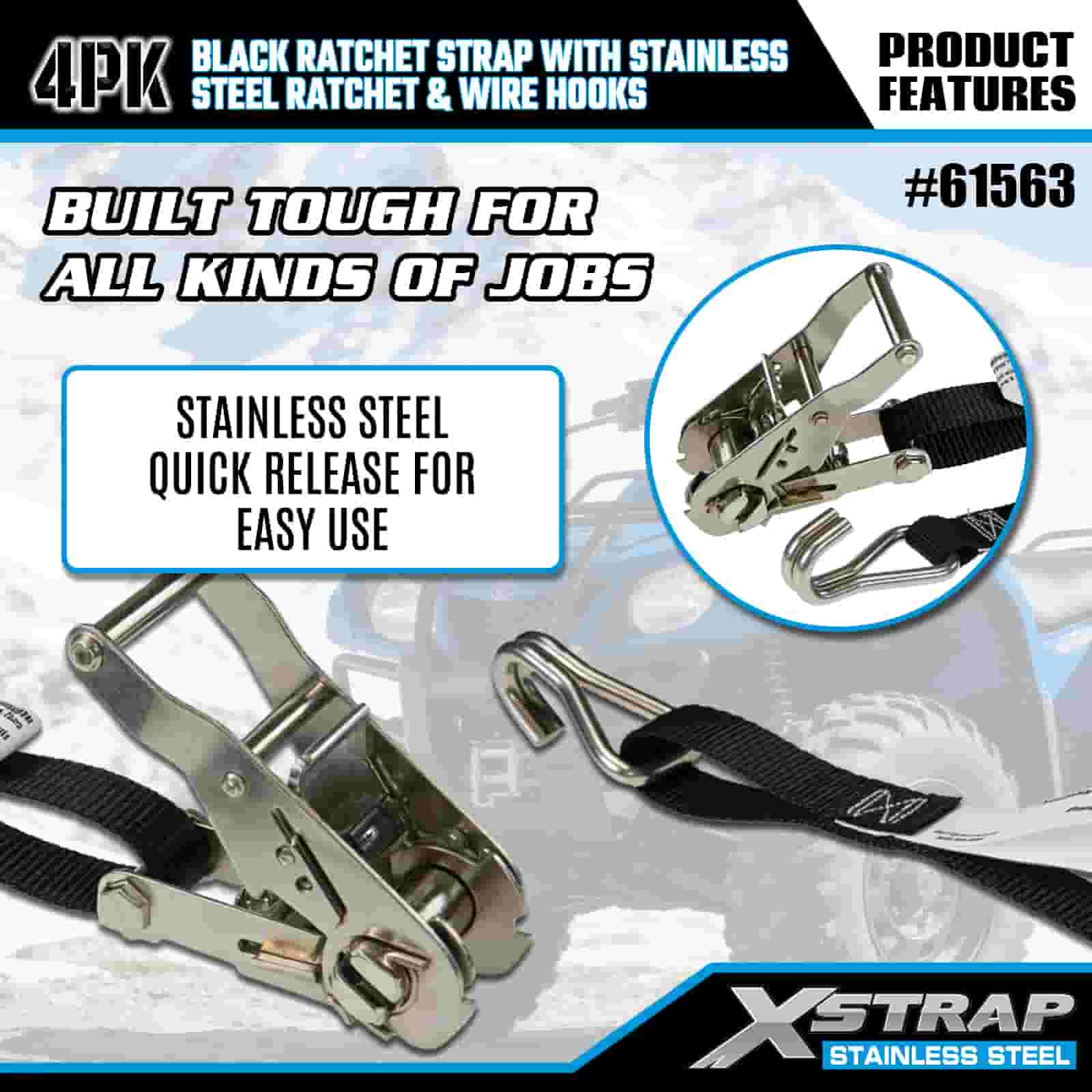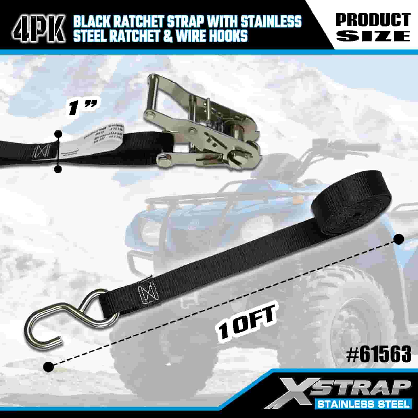 Xstrap 4PK Cureaua cu clichet neagră cu clichet din oțel inoxidabil și cârlige de sârmă, curea cu clichet din poliester de 1 inch x 10 pi, curele de fixare pentru încărcătură cu o capacitate de 1000 lbs cu cârlige de sârmă pentru remorcă, barcă de schi pentru remorcă cu pat plat, mașină mică, echipament greu.
