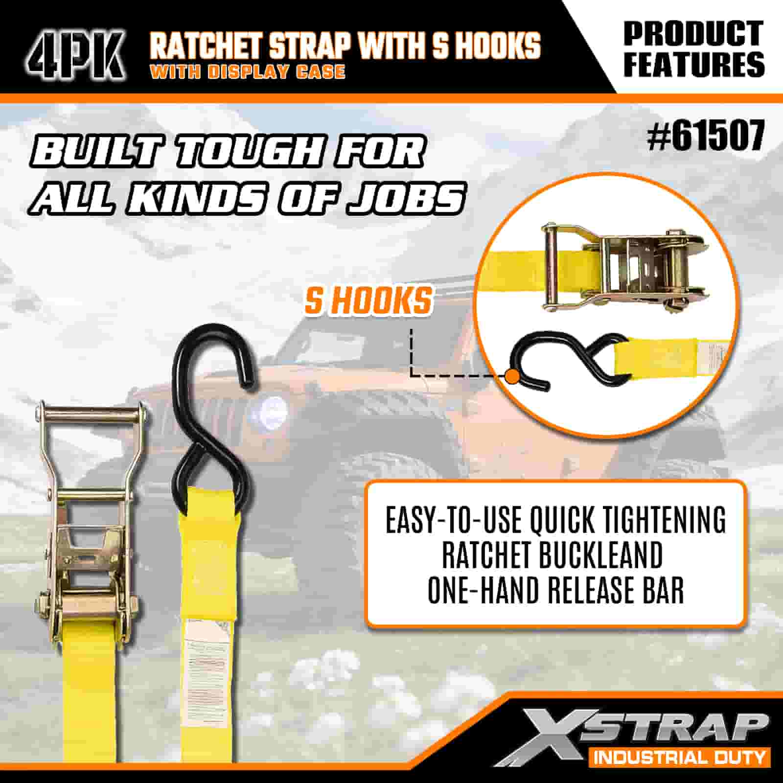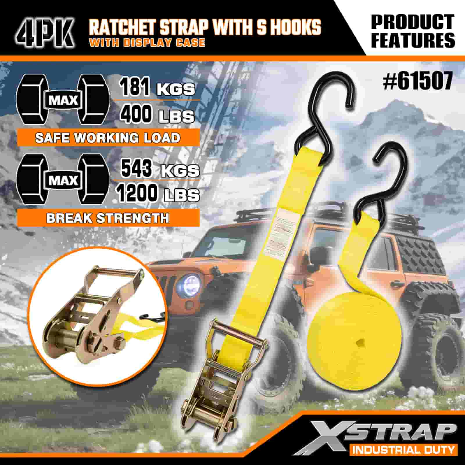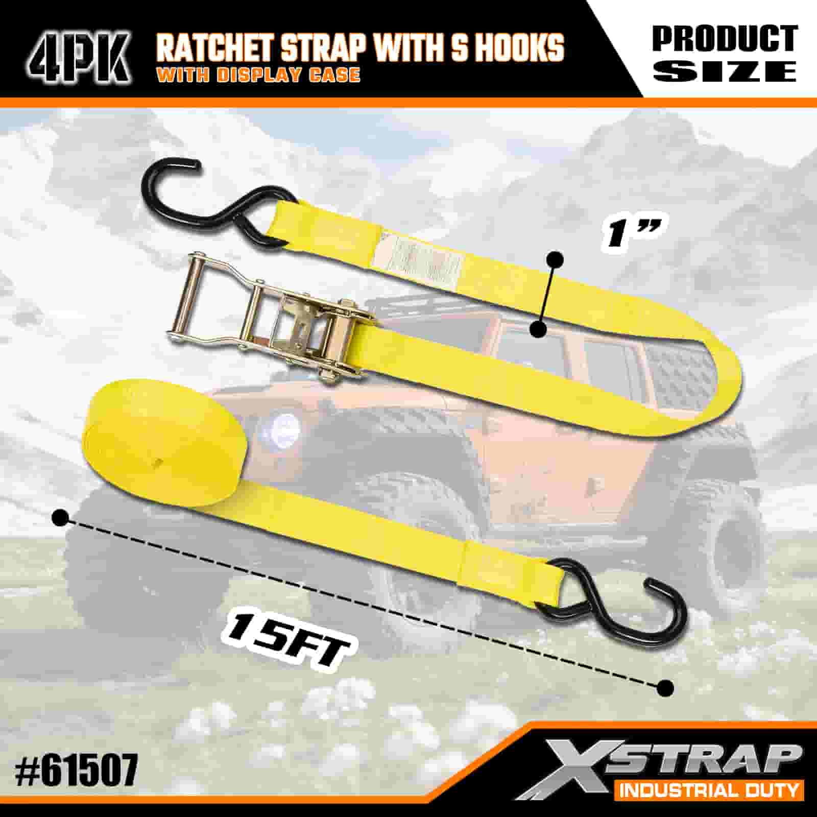 Xstrap 4 pachete de curea cu clichet cu cârlige S, curea de prindere din poliester de 1 inch x 15 pi Curea cu clichet de tragere, curele de fixare pentru ancorare pentru încărcătură cu o capacitate de 400 lbs cu cârlige S pentru profesioniștii serioși să securizeze remorca de marfă, remorca cu pat plat, barca de schi, mașina mică.
