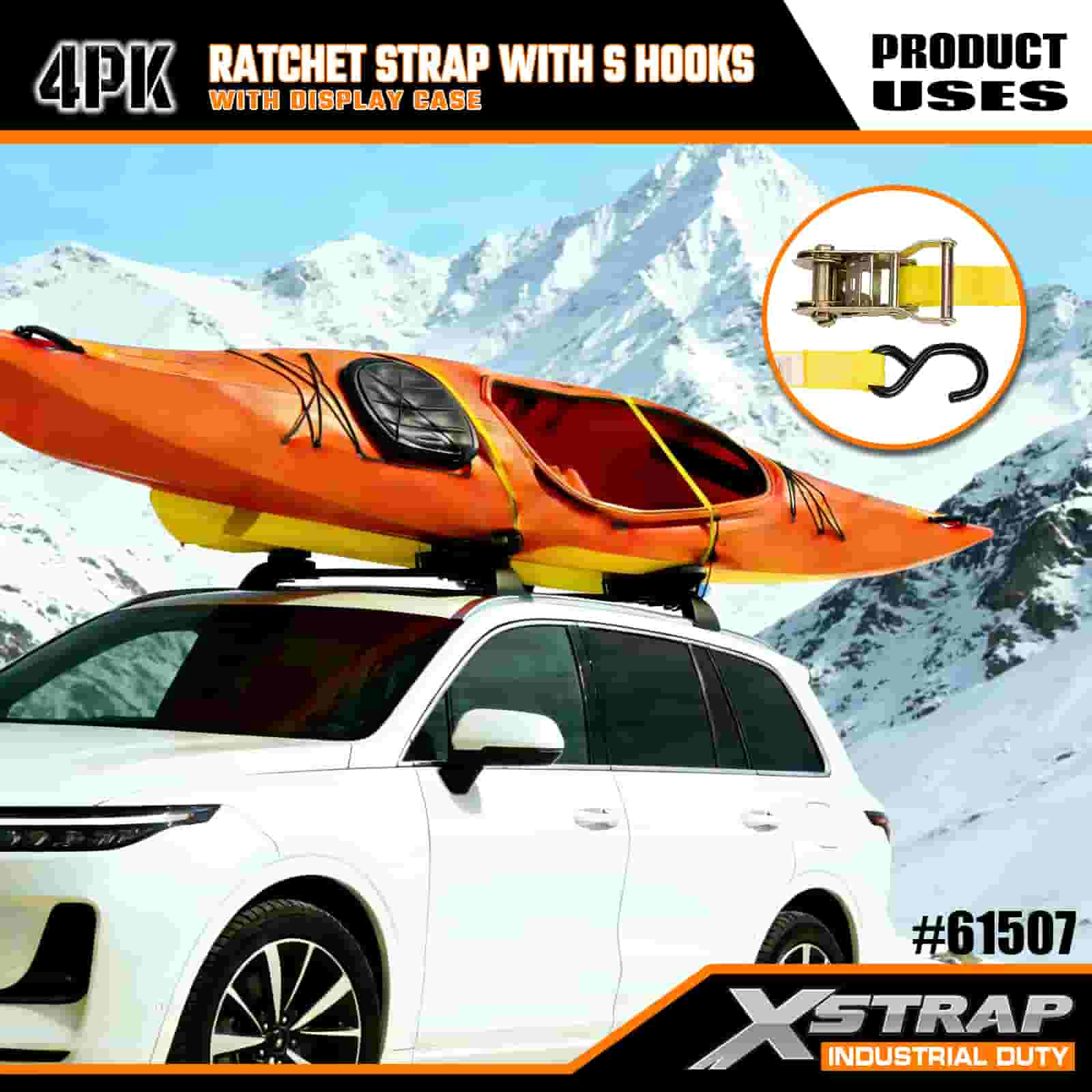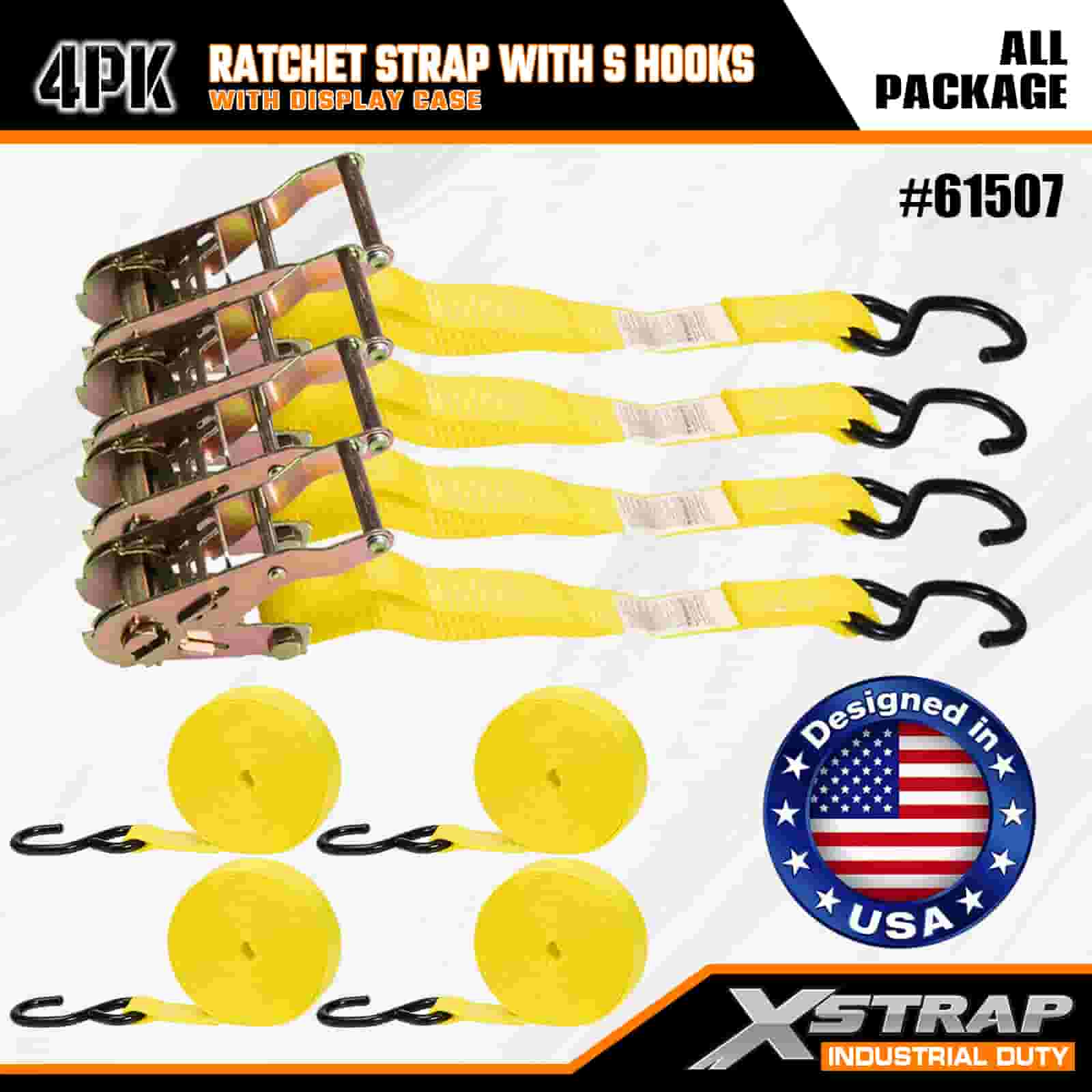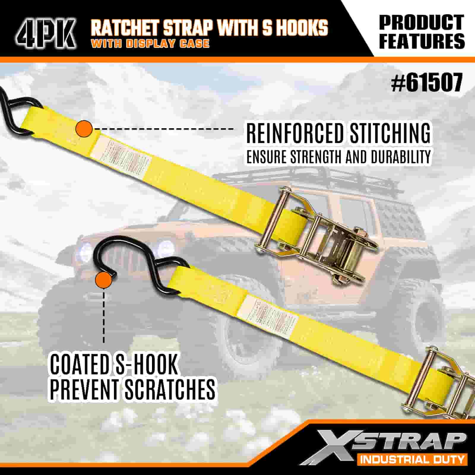 Xstrap 4 pachete de curea cu clichet cu cârlige S, curea de prindere din poliester de 1 inch x 15 pi Curea cu clichet de tragere, curele de fixare pentru ancorare pentru încărcătură cu o capacitate de 400 lbs cu cârlige S pentru profesioniștii serioși să securizeze remorca de marfă, remorca cu pat plat, barca de schi, mașina mică.