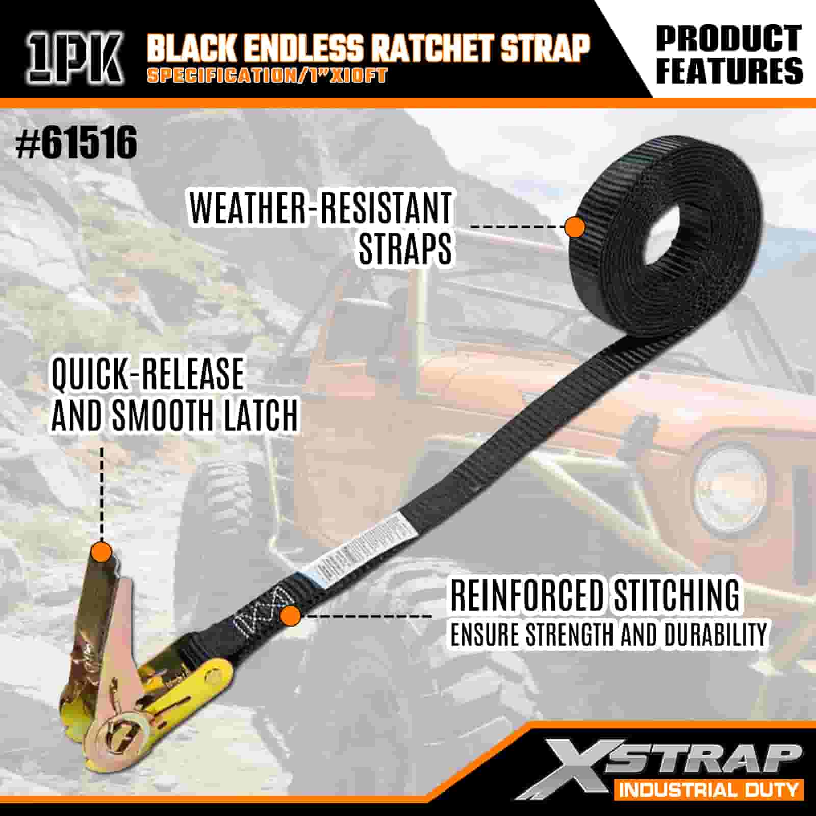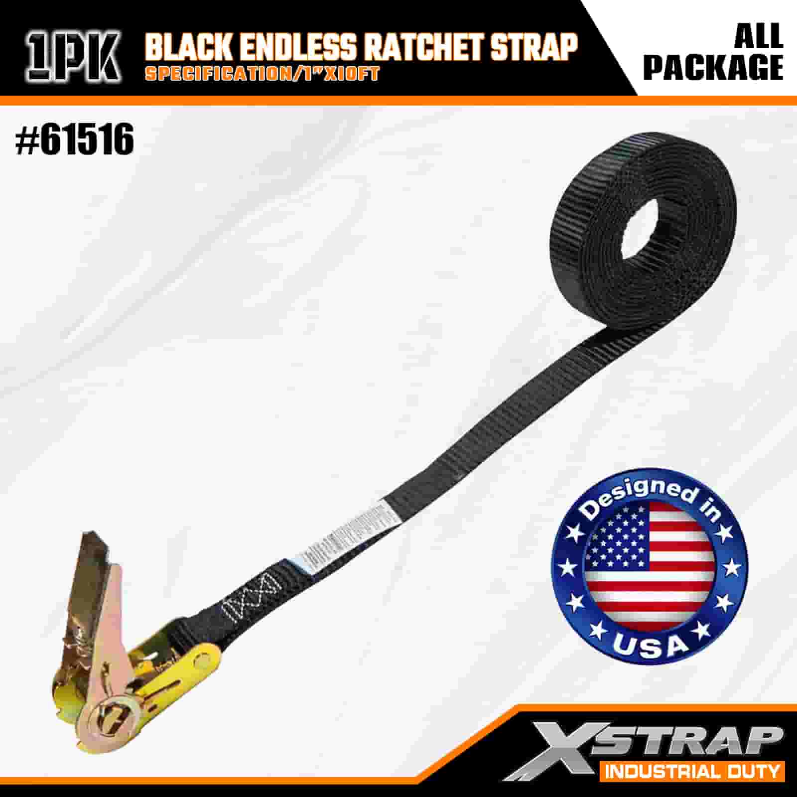 Curea cu clichet fără sfârșit Xstrap neagră, curea de prindere din poliester de 1 inch x 10 pi Curea cu clichet de tragere, curele de fixare pentru ancorarea încărcăturii cu o capacitate de 500 de livre pentru profesioniștii serioși pentru a securiza remorca de marfă, remorca cu pat plat, barca de schi, mașina mică.