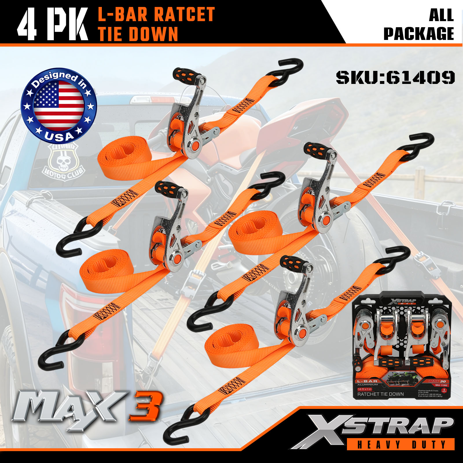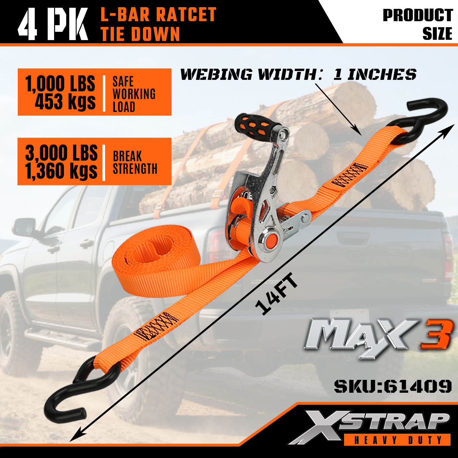 Xstrap pachet de 4 curele de fixare cu bară în L, curele de fixare din poliester de 1 inchi x 14 pi Curea cu clichet de tragere, curele de fixare pentru ancorare pentru încărcătură cu o capacitate de 1000 de kg cu cârlige în S pentru camioane, SUV, suporturi superioare pentru mașini, motociclete.