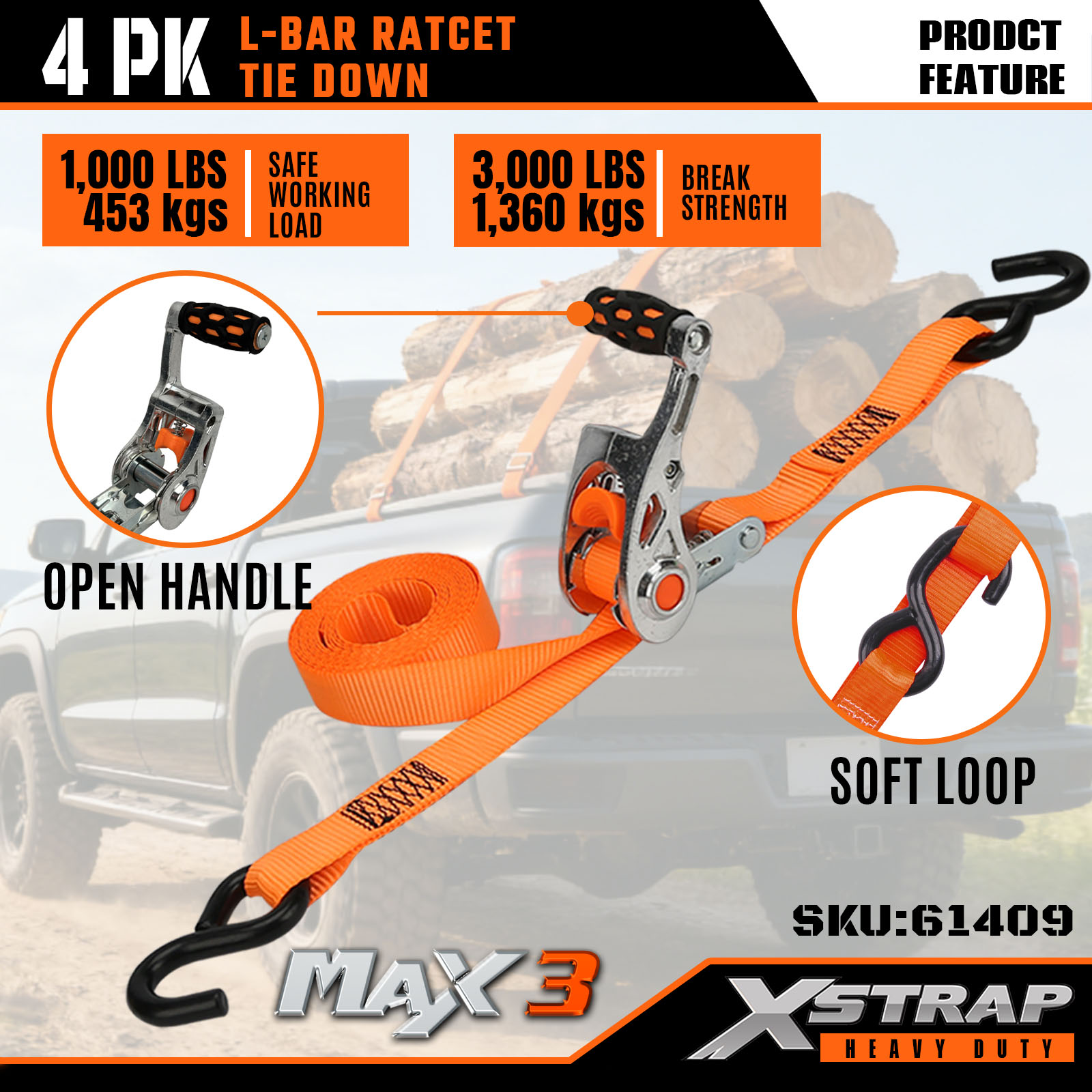 - Marcaje clare privind capacitatea de încărcare: fiecare curea este etichetată cu o sarcină de lucru sigură de 453 kg/1.000 lbs și o rezistență la rupere de 1.360 kg/3.000 lbs, oferind instrucțiuni clare de siguranță pentru o utilizare corectă și sigură.