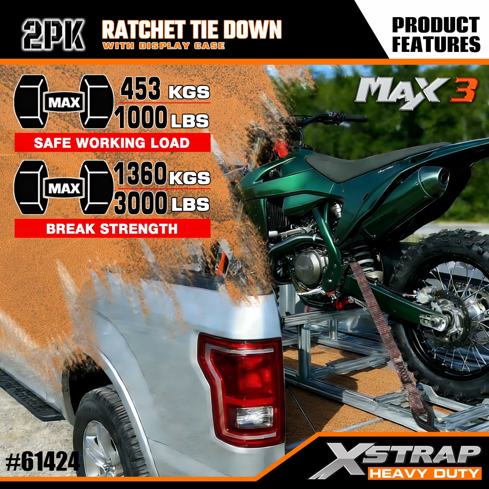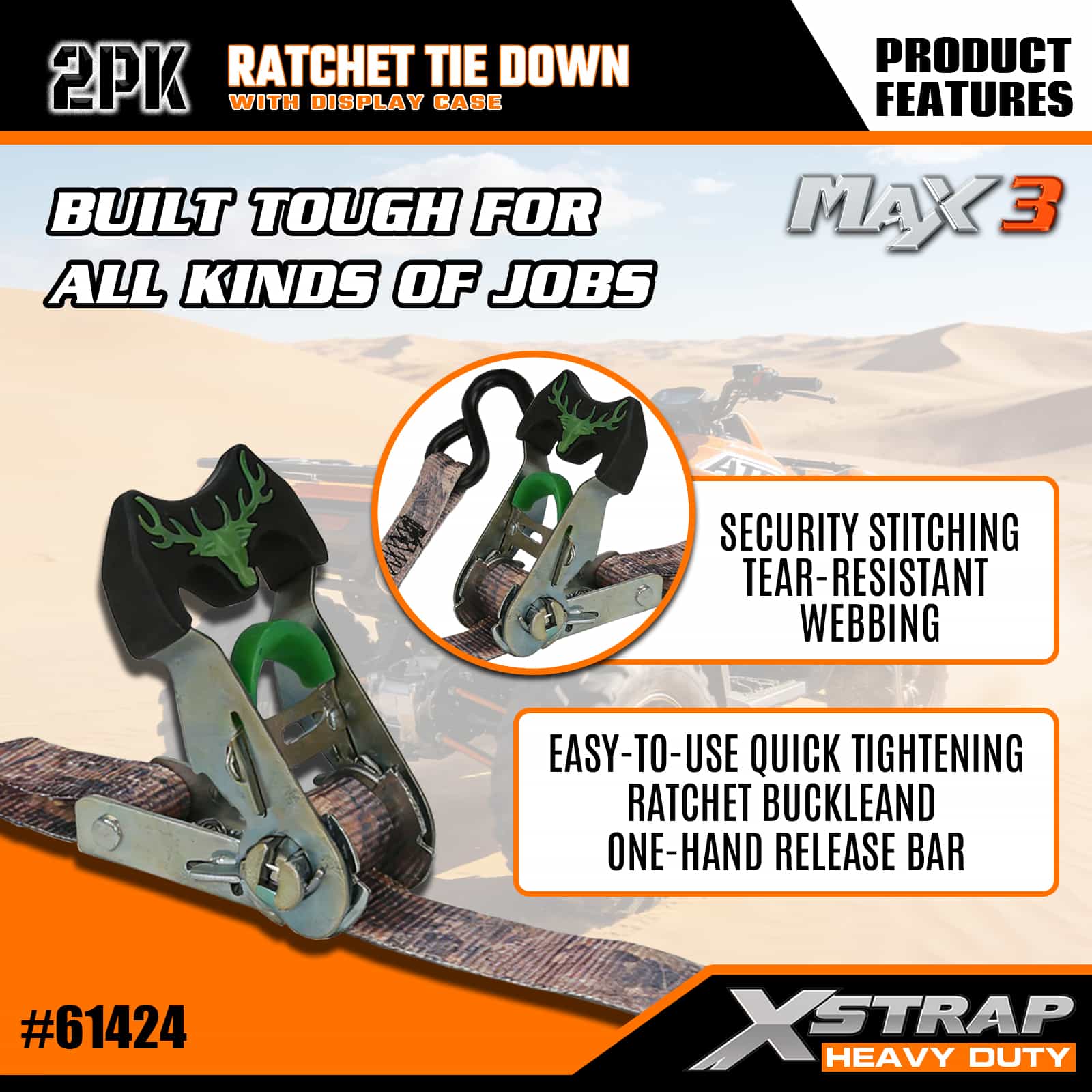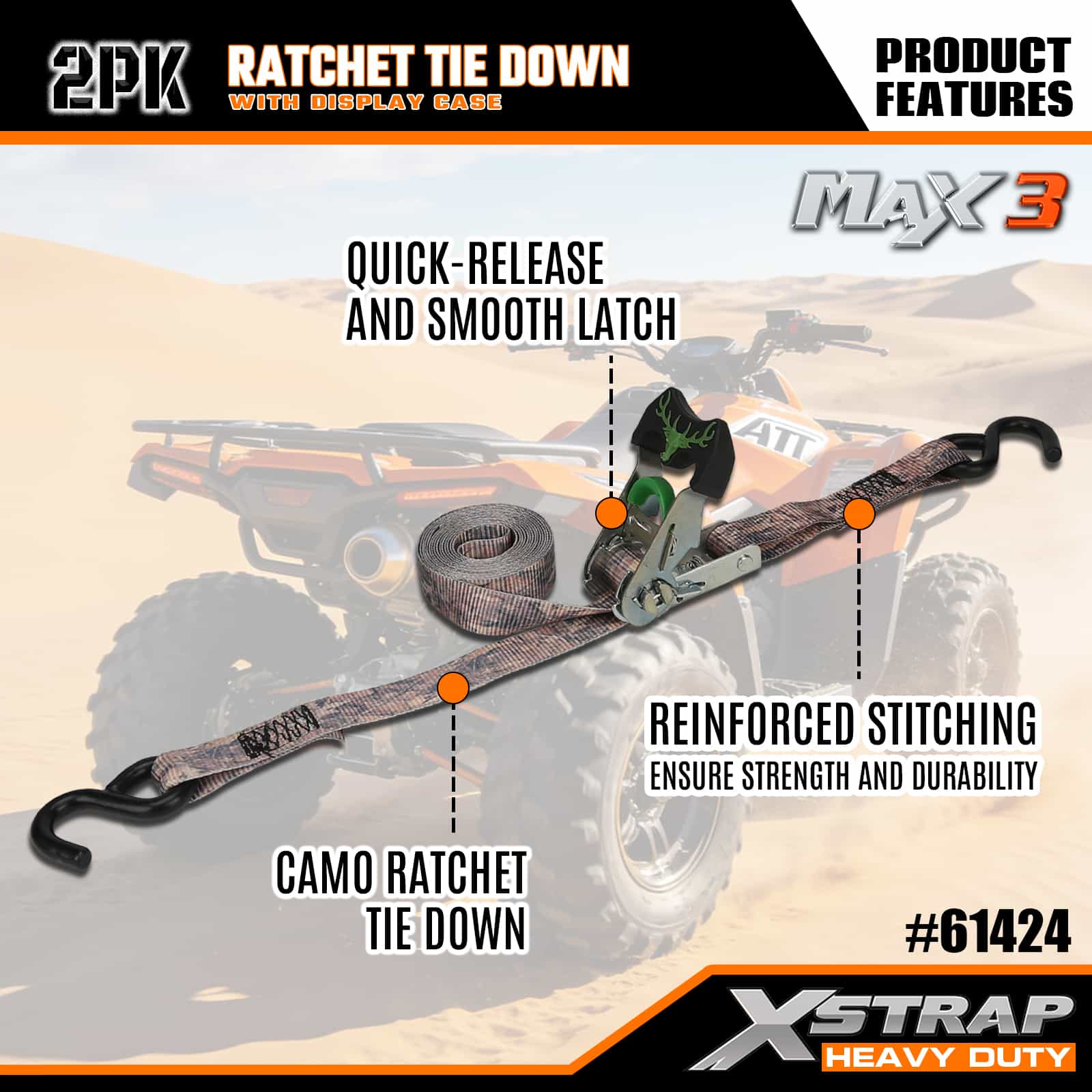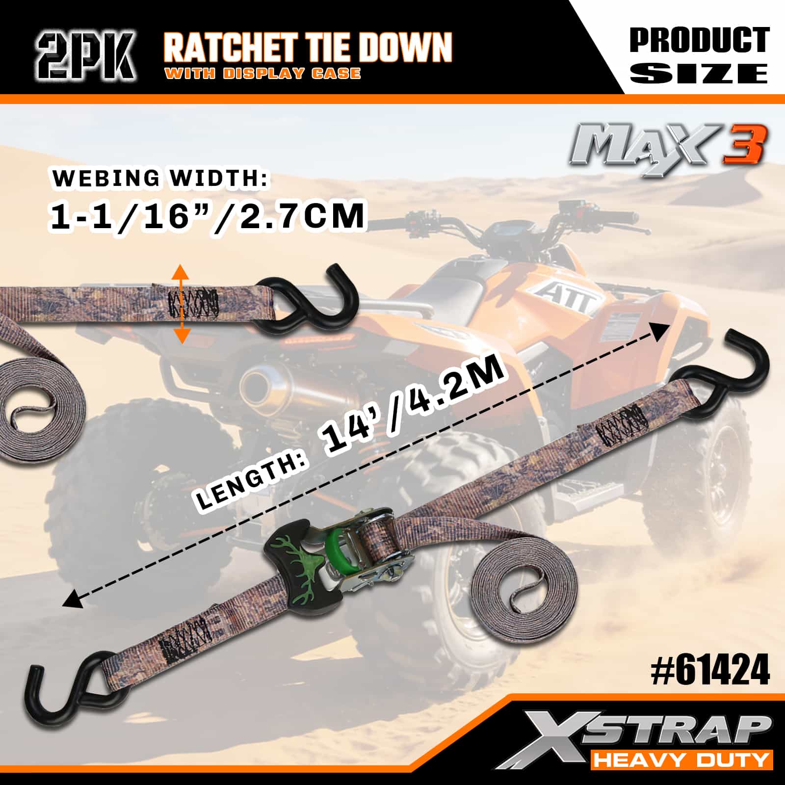 Xstrap 2 Pachet de fixare cu clichet Camo, 1-1/16 ” x 14’ curea de prindere din poliester Curea cu clichet de tragere, curele de fixare pentru ancorare de încărcătură cu o capacitate de 1000 lbs cu cârlige S pentru camionetă, SUV, suporturi superioare pentru mașină, motocicletă, barcă de pescuit ușoară, motocicletă de pescuit, tractor cu jetn.