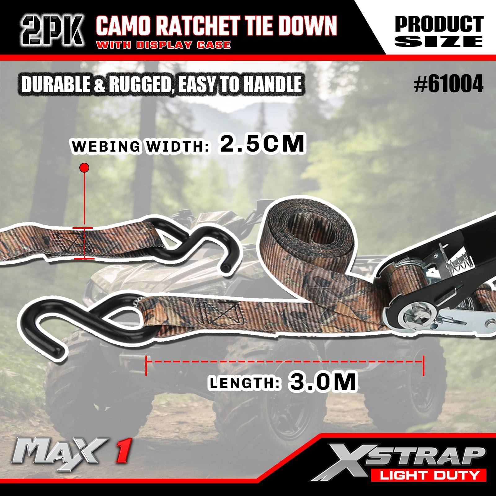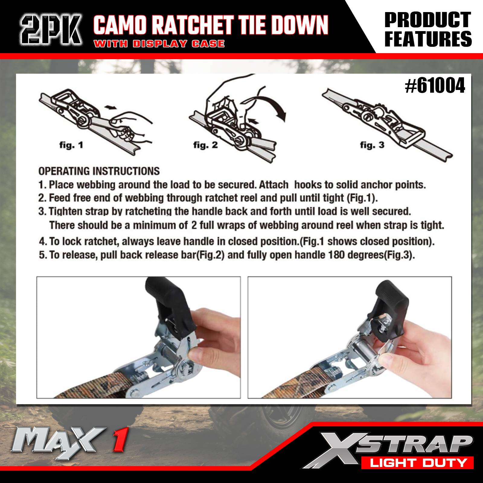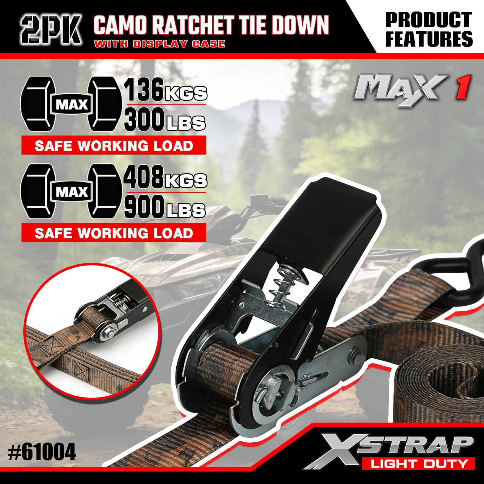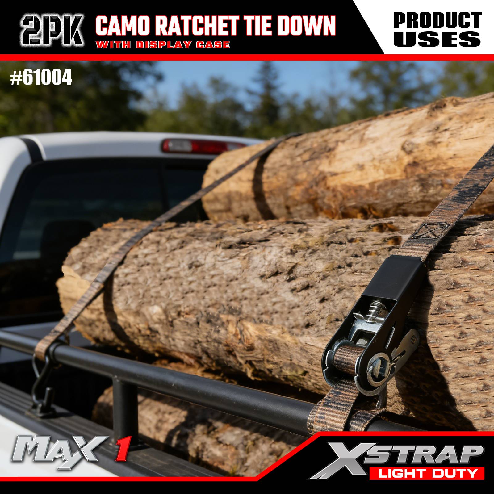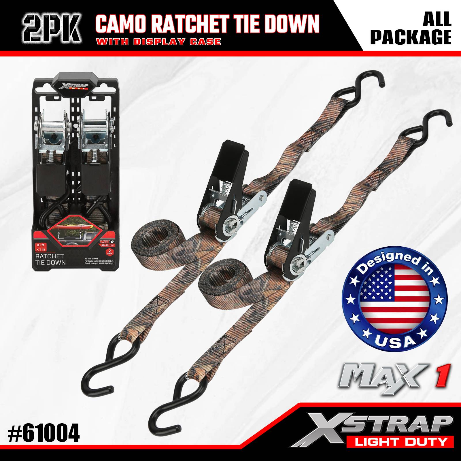 Xstrap Pachet de 2 curele de fixare cu clichet, 1"x10' - Capac de încărcare de 300 lbs - 900 lbs rezistență la rupere - curele de marfă pentru mutarea aparatelor, echipamente de gazon, motociclete, camuflaj