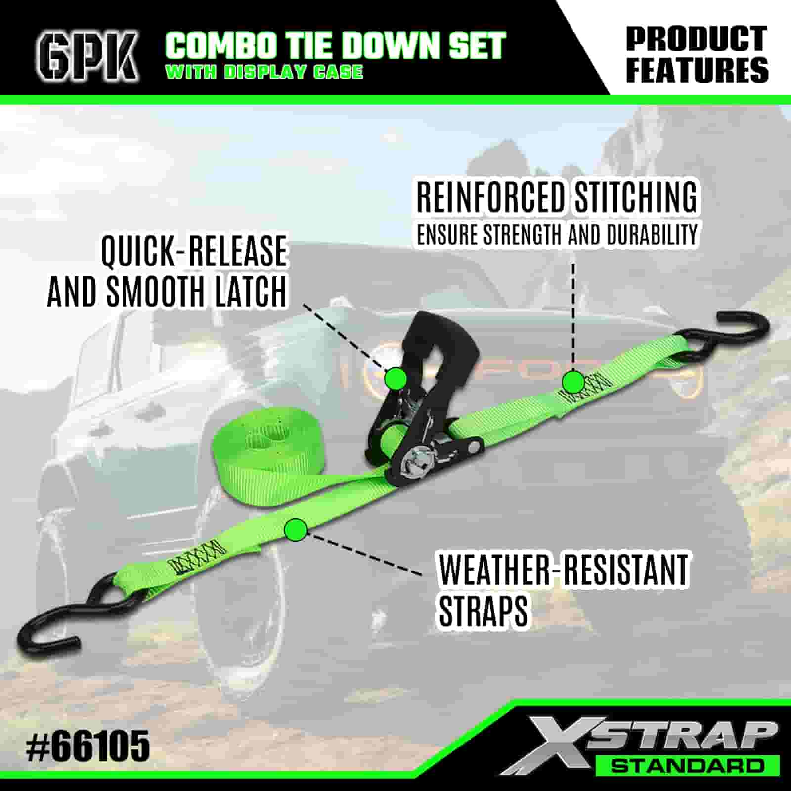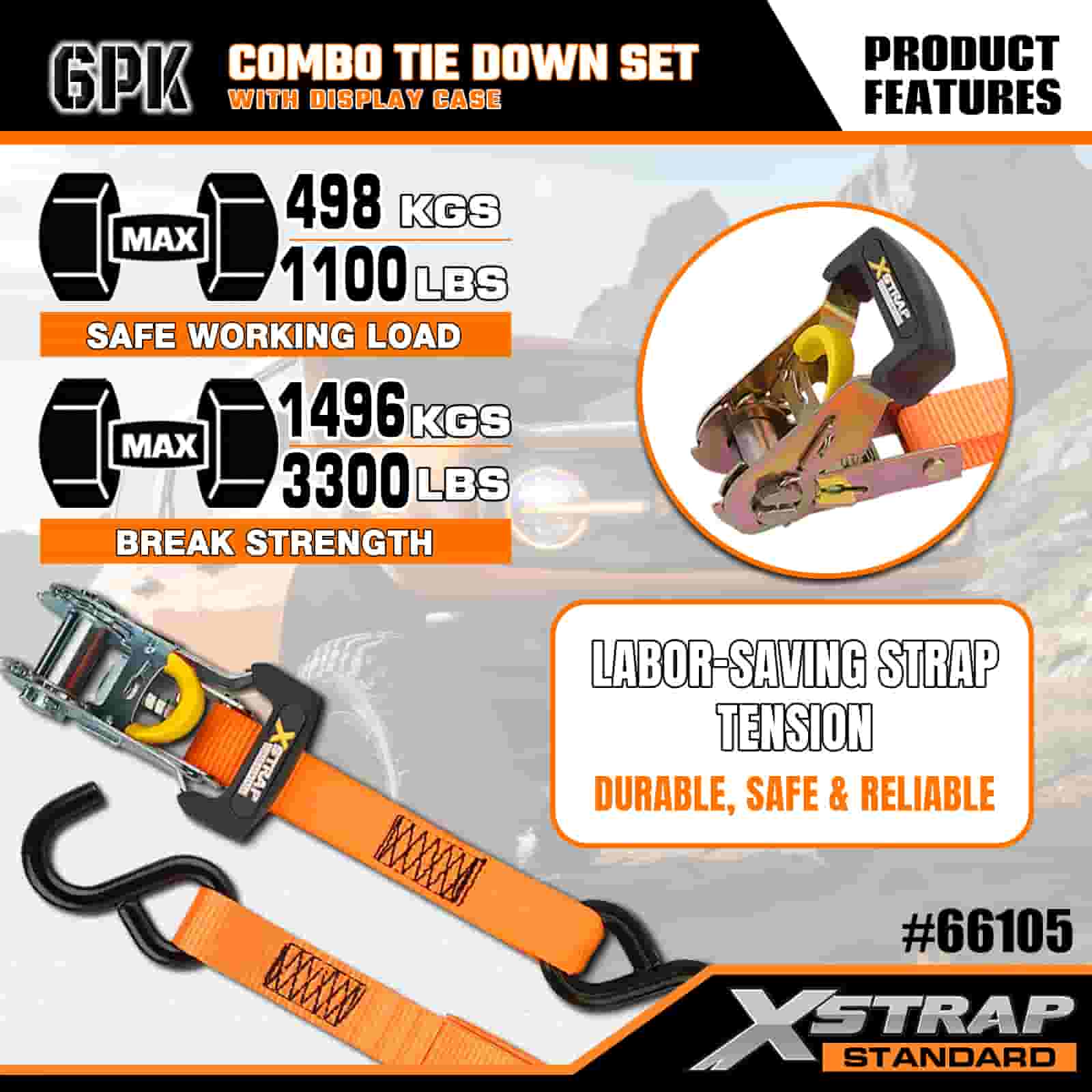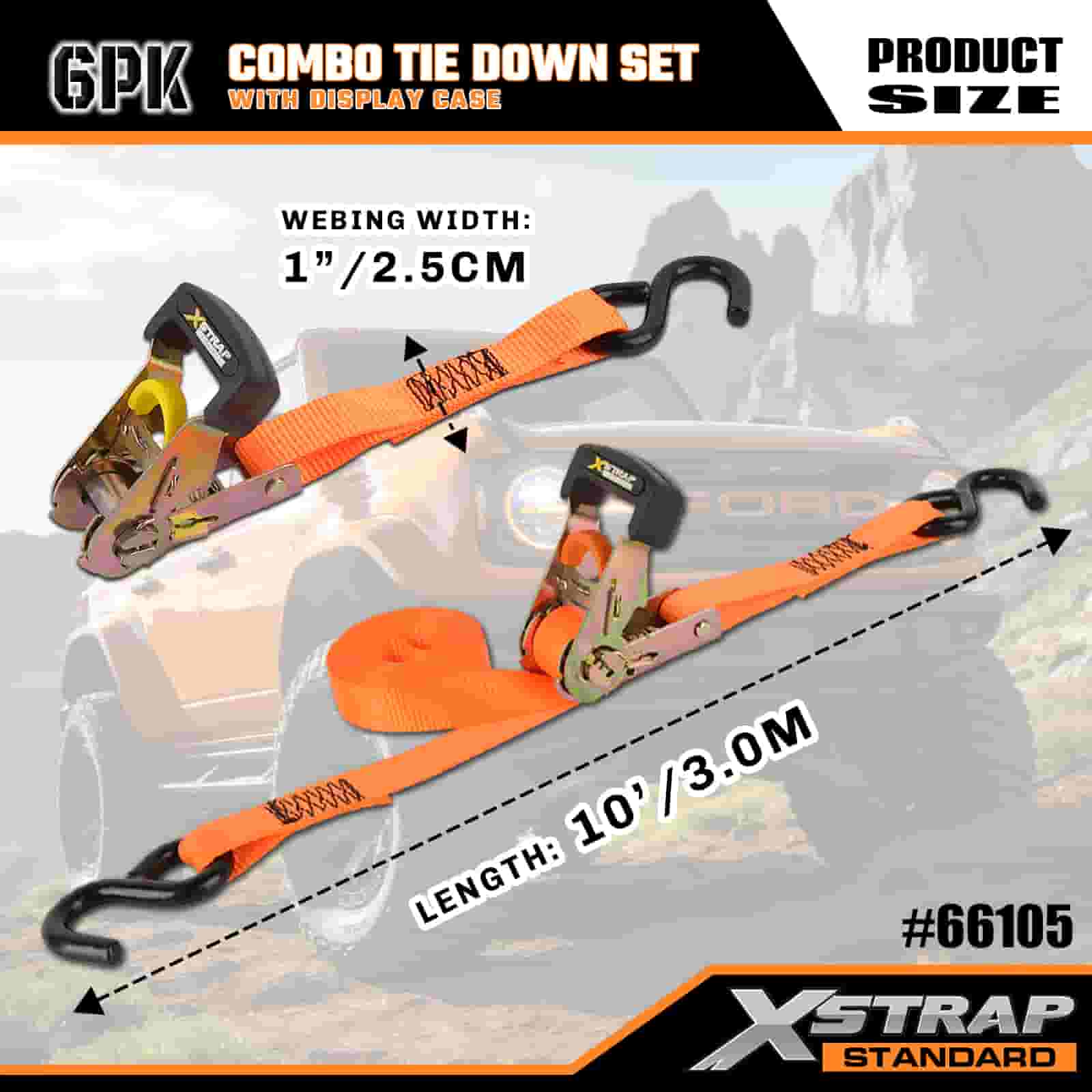 Pachet de 6 Xstrap cu clichet din aluminiu, curea de fixare din poliester de 1 inch x 14 pi și 1 inch x 10 pi Curea cu clichet de tragere, capacitate de 500 lbs și 1100 lbs, curele de fixare pentru ancorare a încărcăturii cu cârlige în S pentru controlul portbagajului SUV, camionetă, camionetă, control UV, camionetă.