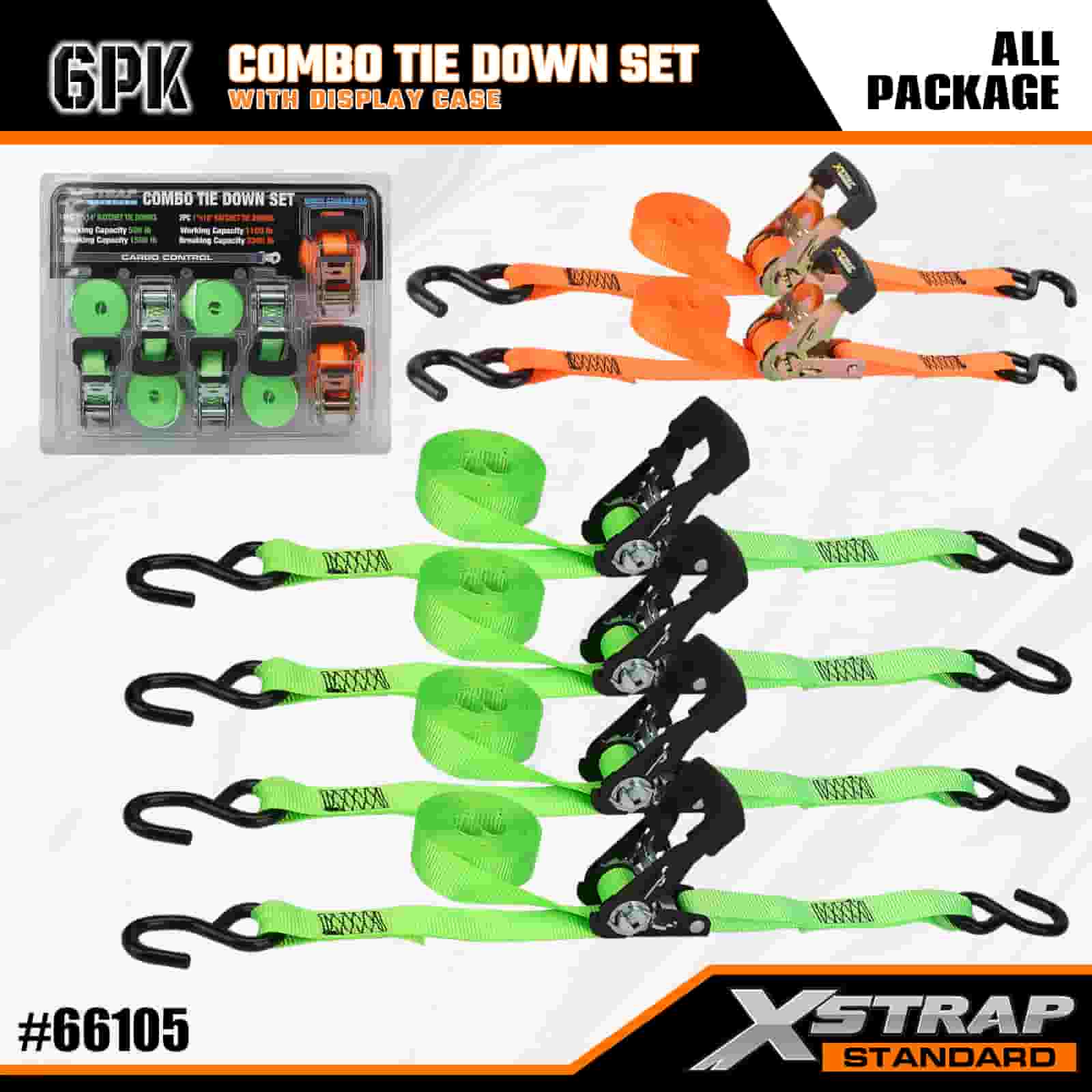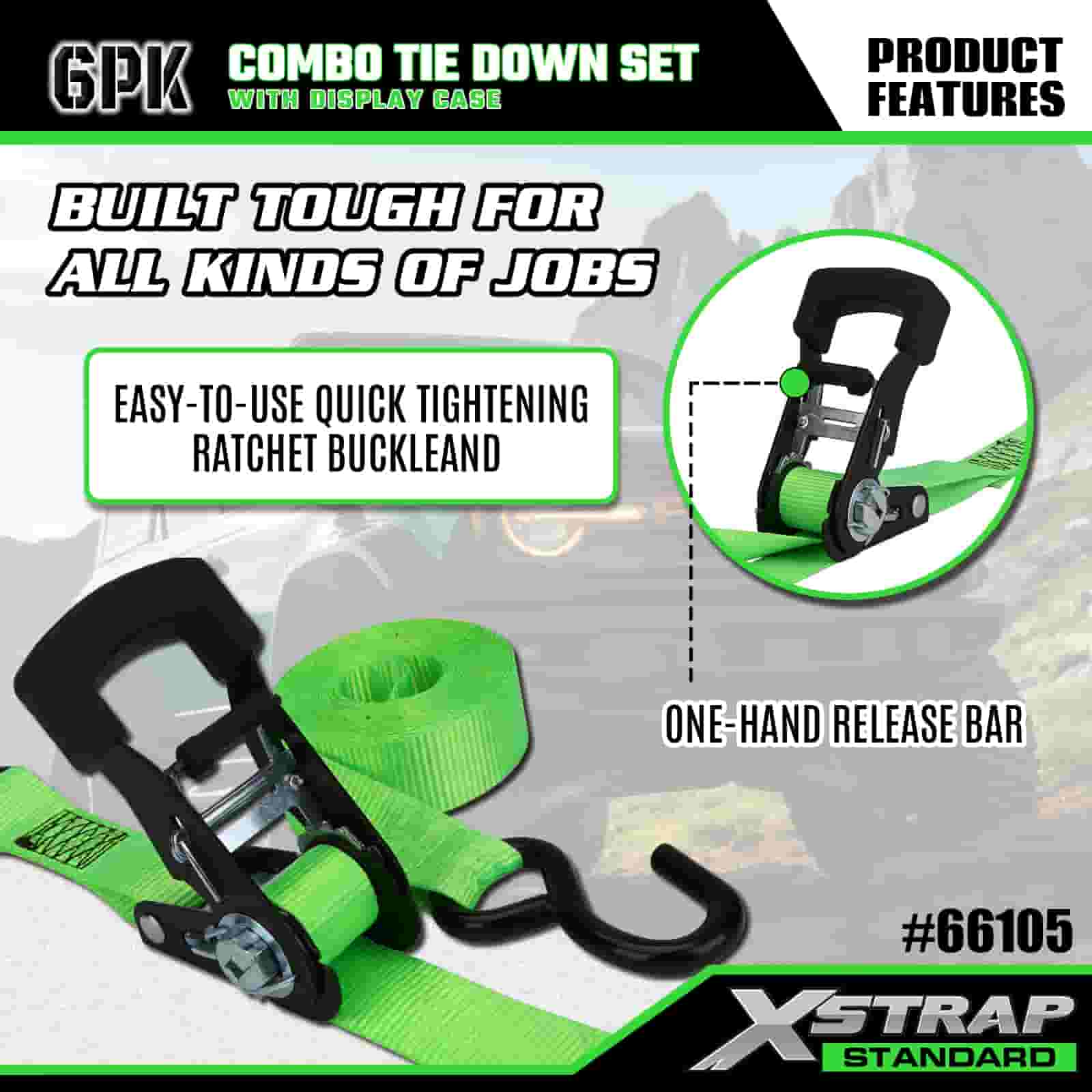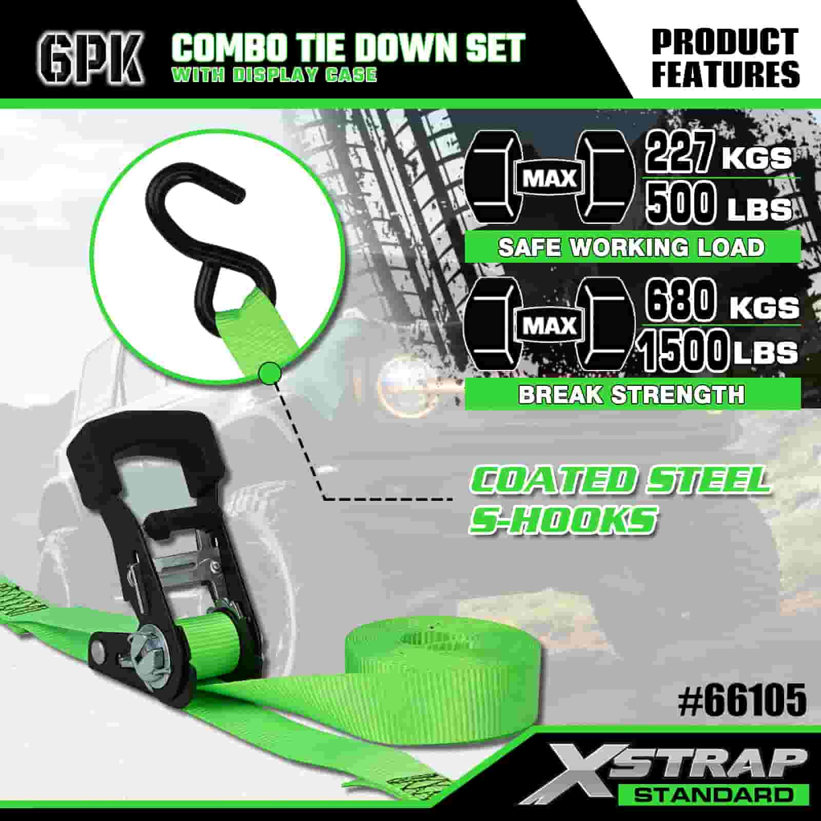 Pachet de 6 Xstrap cu clichet din aluminiu, curea de fixare din poliester de 1 inch x 14 pi și 1 inch x 10 pi Curea cu clichet de tragere, capacitate de 500 lbs și 1100 lbs, curele de fixare pentru ancorare a încărcăturii cu cârlige în S pentru controlul portbagajului SUV, camionetă, camionetă, control UV, camionetă.