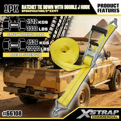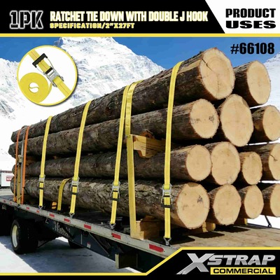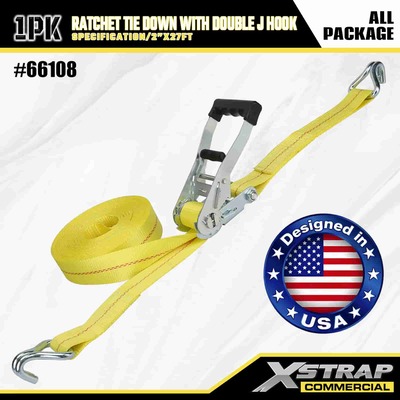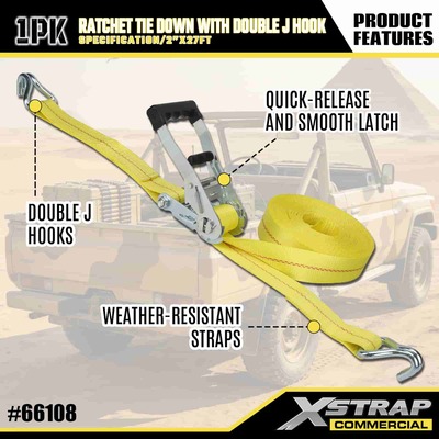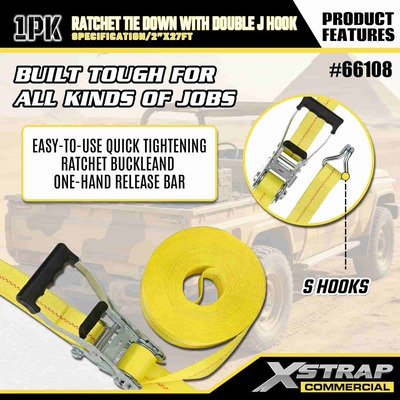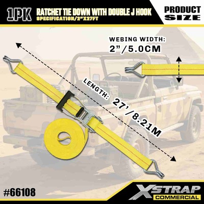Fixare cu clichet Xstrap cu cârlige J dublu, curea de fixare din poliester de 2 inchi x 27 pi Curea cu clichet cu tragere, curele de fixare pentru ancorare a încărcăturii cu o capacitate de 3333 lbs cu cârlige dublu J pentru camionetă de control al încărcăturii, SUV, suporturi superioare pentru mașină, motociclete.