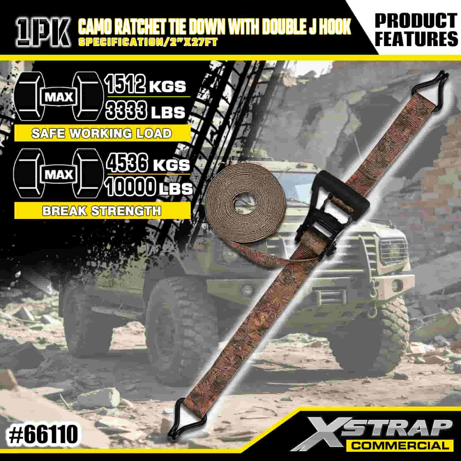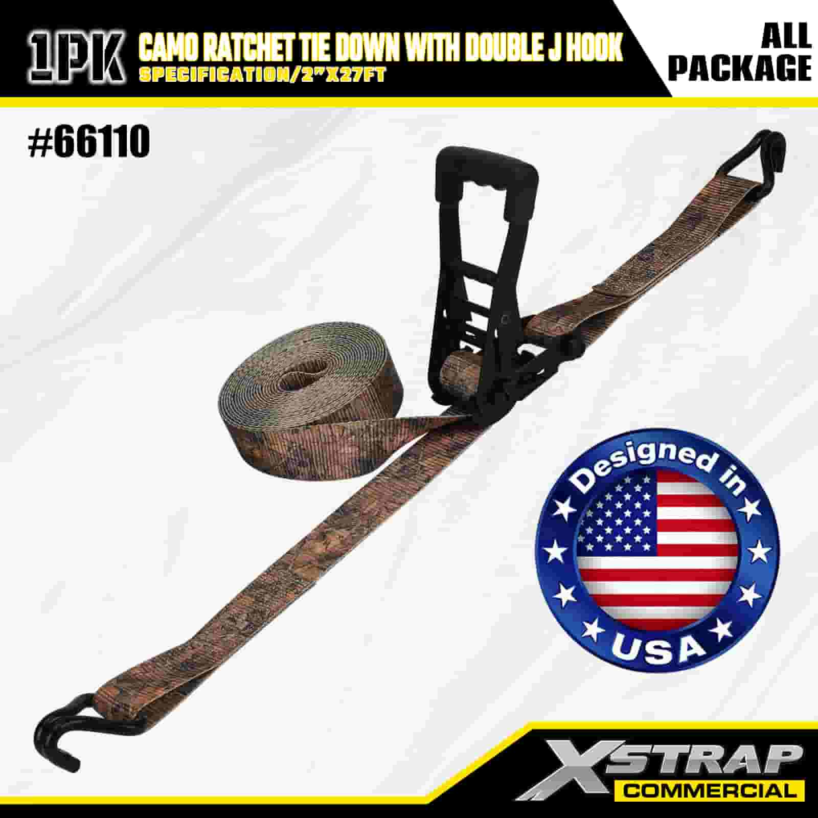 Fixare cu clichet Xstrap CAMO cu cârlige dublu J, curea de prindere din poliester de 2 inchi x 27 pi, curea cu clichet de tragere, curele de fixare pentru încărcătură cu o capacitate de 3333 lbs cu cârlige dublu J pentru camionetă de control al încărcăturii, SUV, suporturi superioare pentru mașină, motociclete,.