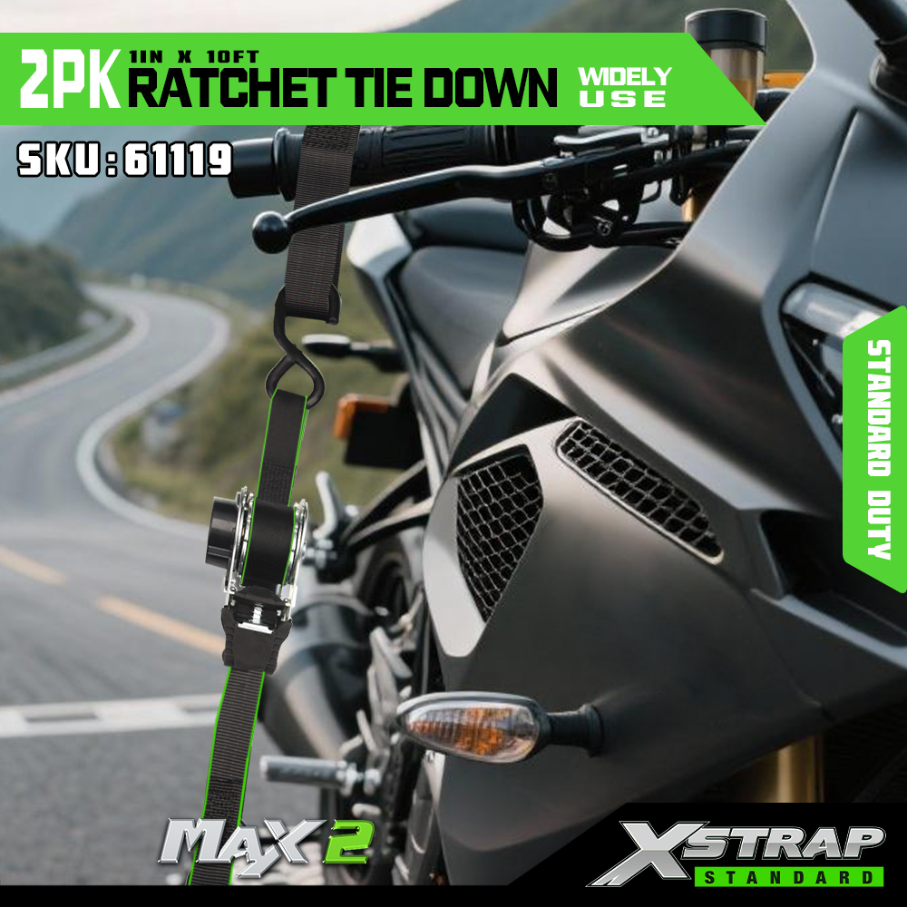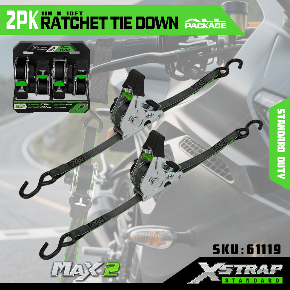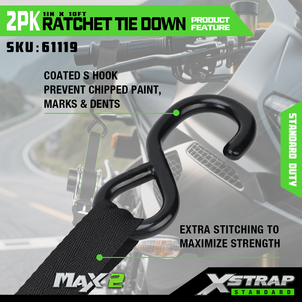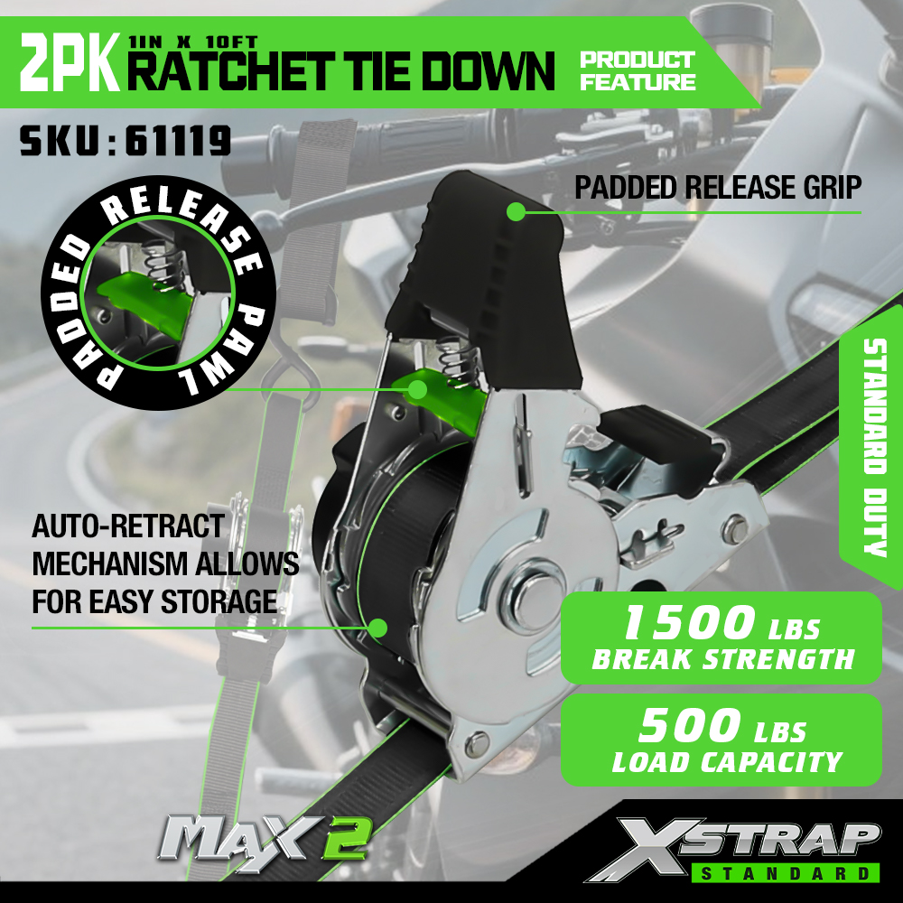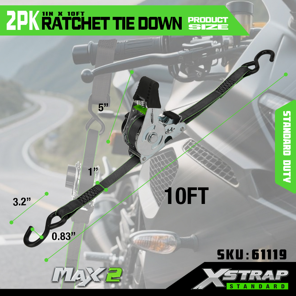 Fixare cu clichet Xstrap 2 pachet, curea de prindere din poliester 1” x 10 pi Curea cu clichet de tragere, curele de fixare pentru ancorare pentru încărcătură cu o capacitate de 500 lbs cu cârlige în S pentru camionetă, SUV, suporturi superioare pentru mașină, motocicletă, barcă de pescuit ușoară, jet ski, moto de zăpadă, tractor de gazon.