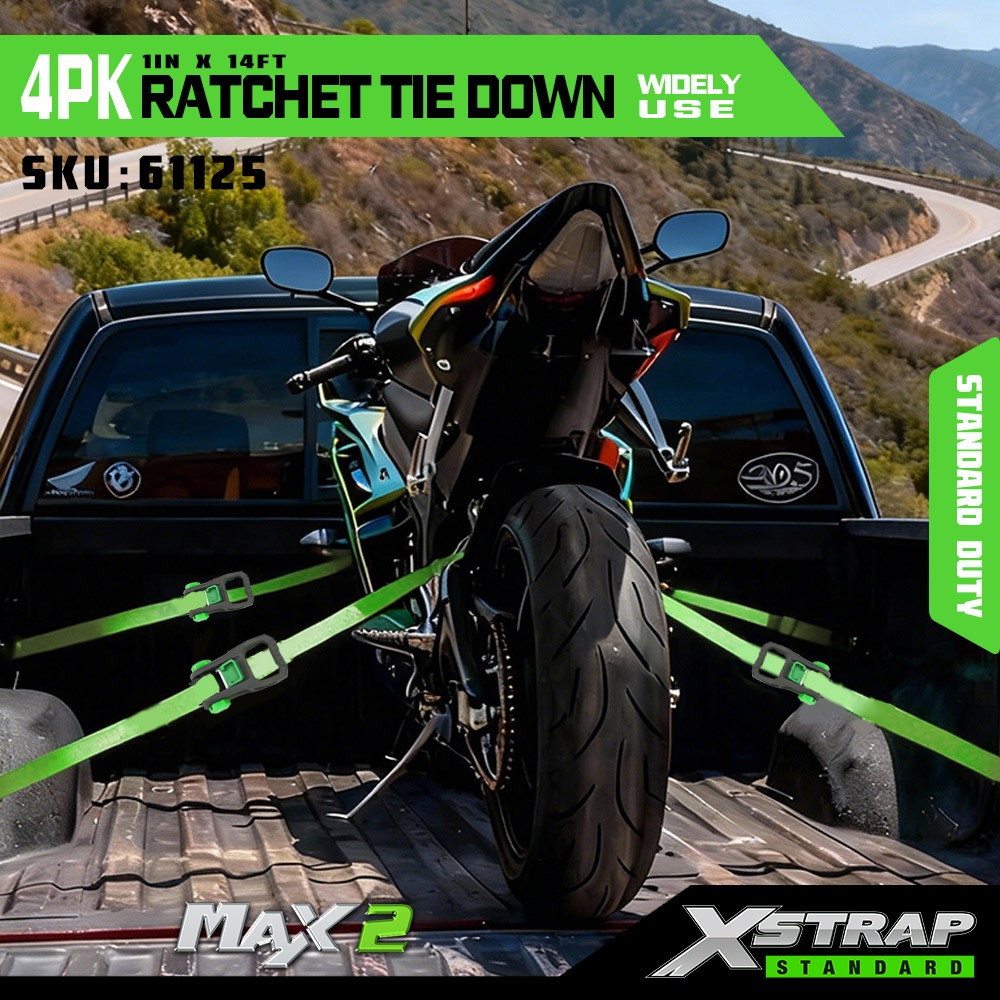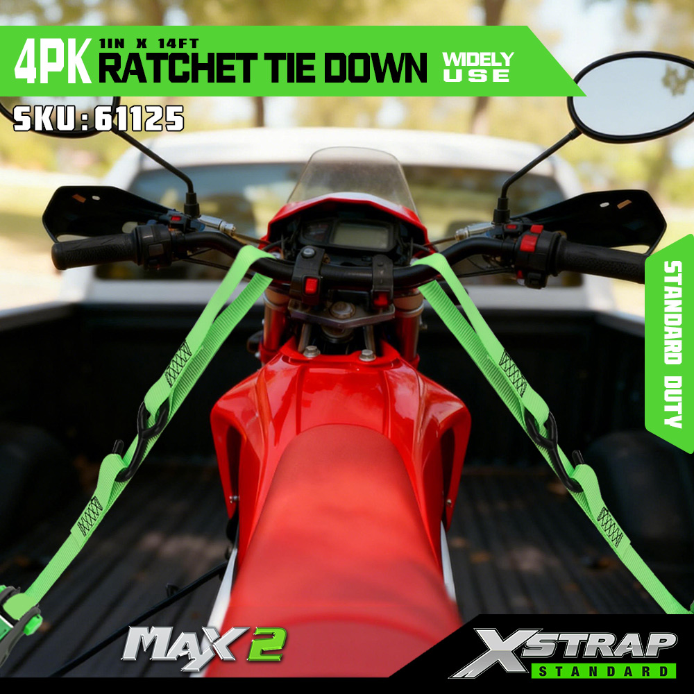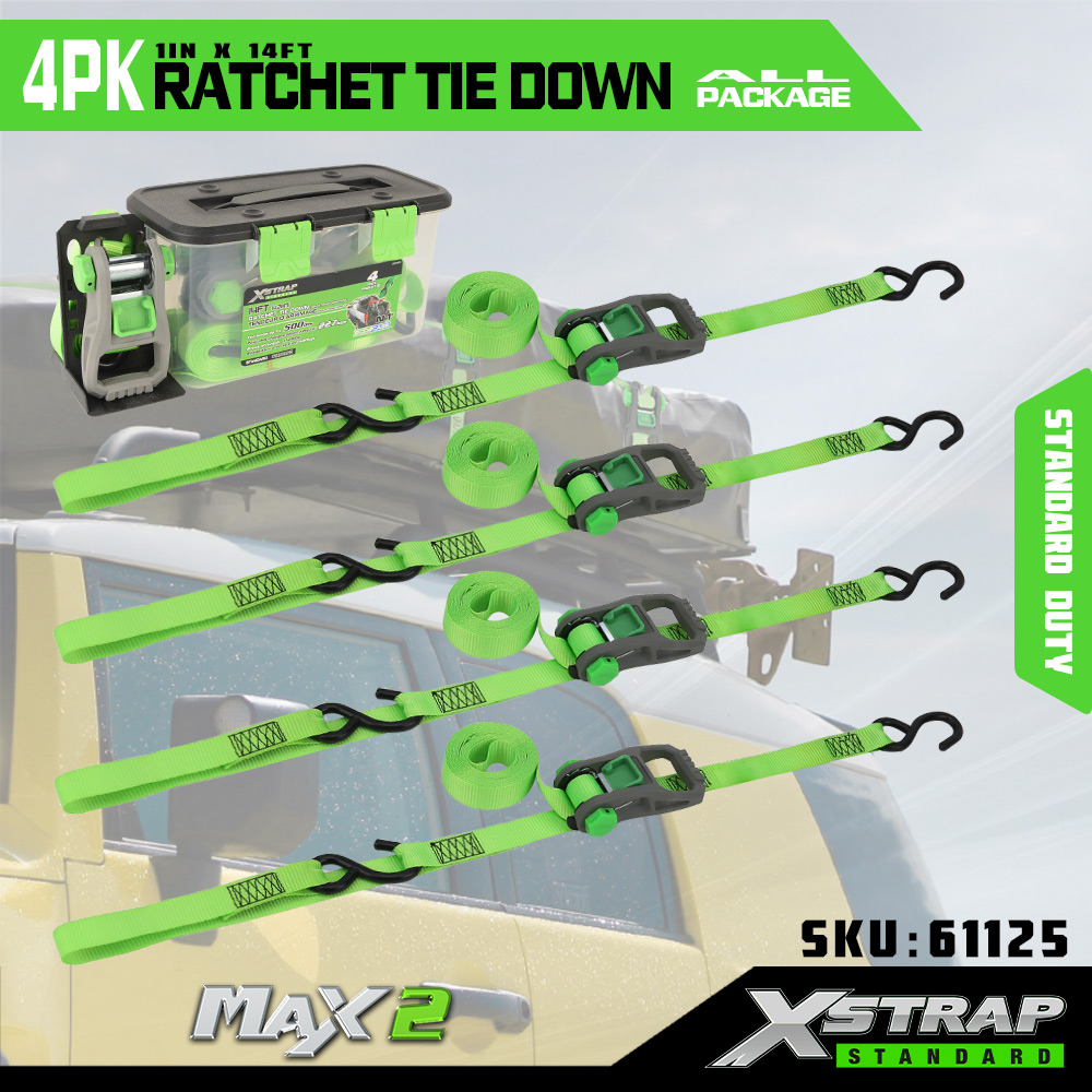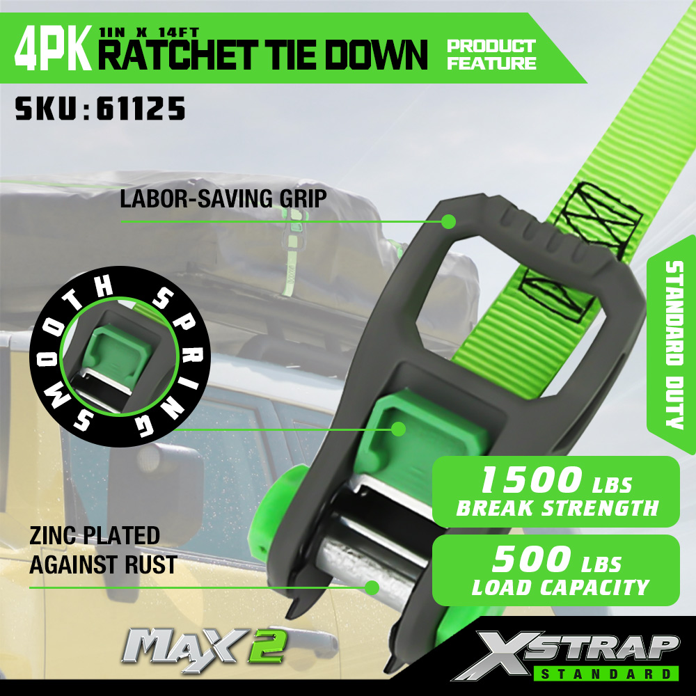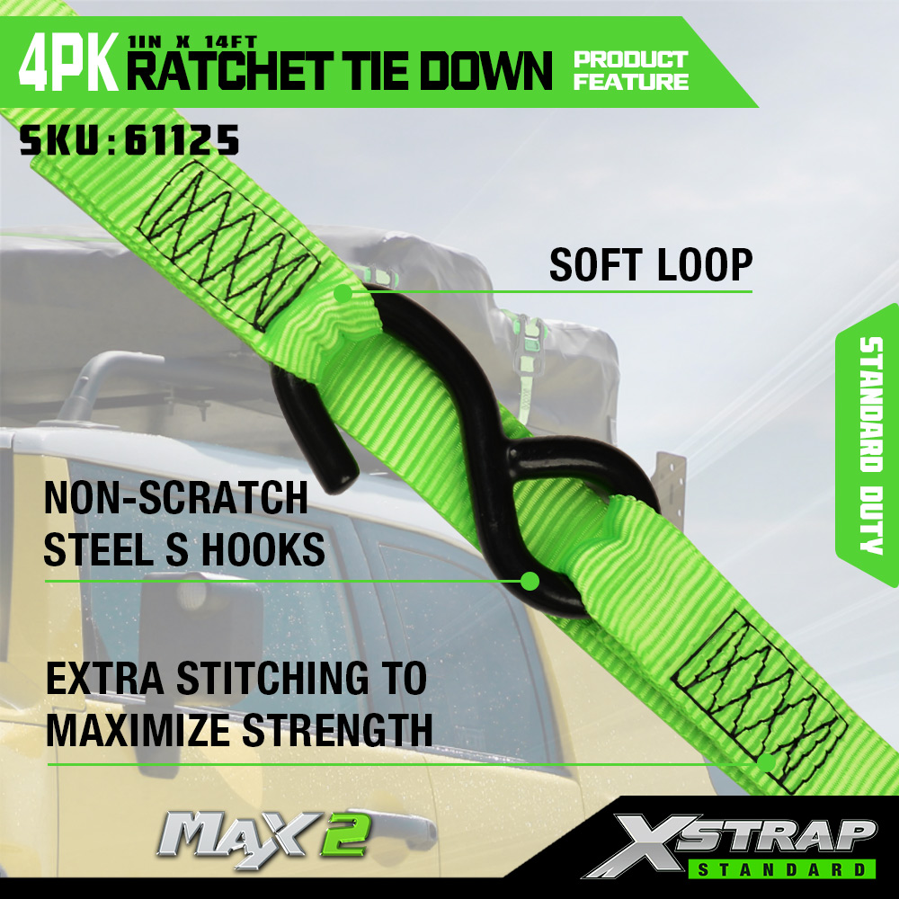 Pachet Xstrap cu clichet, curea de fixare din poliester de 1 inch x 14 pi cu cureaua de tragere cu buclă moale, curele de fixare pentru încărcătură cu o capacitate de 500 lbs cu cârlige S pentru camionete, SUV, suporturi superioare pentru mașini, motociclete, barcă ușoară de pescuit, jet ski, motos de zăpadă.