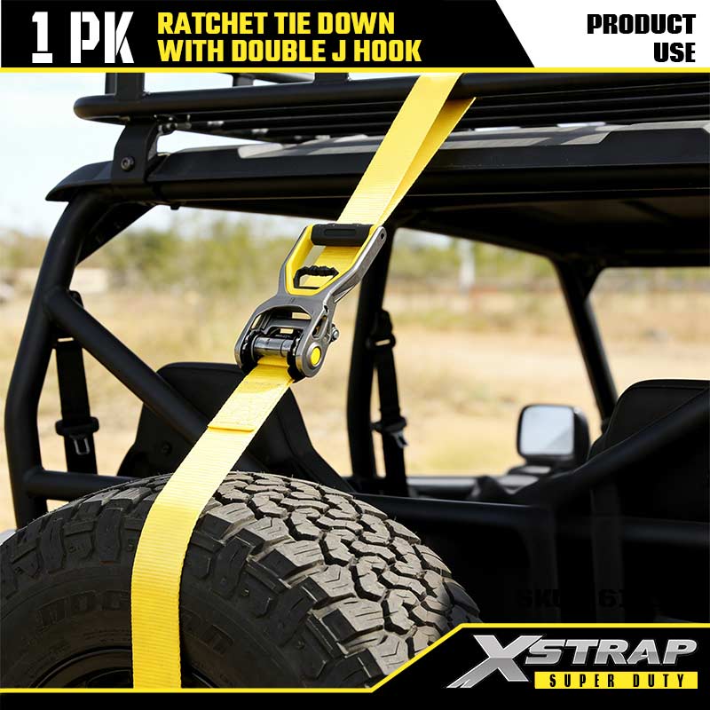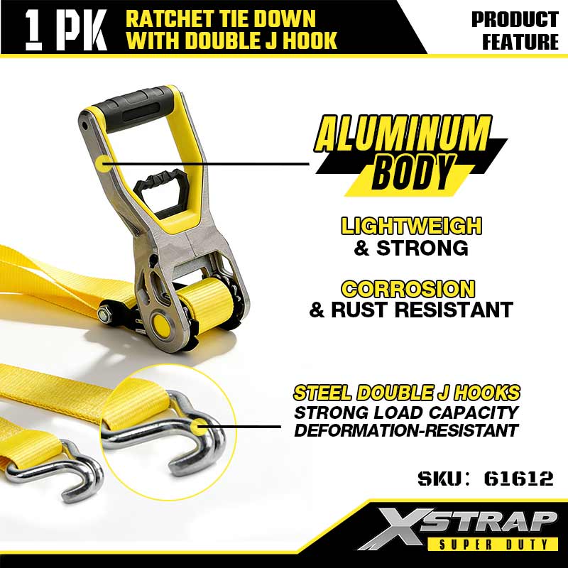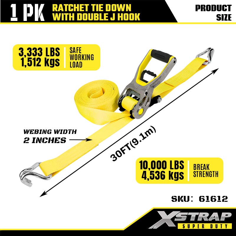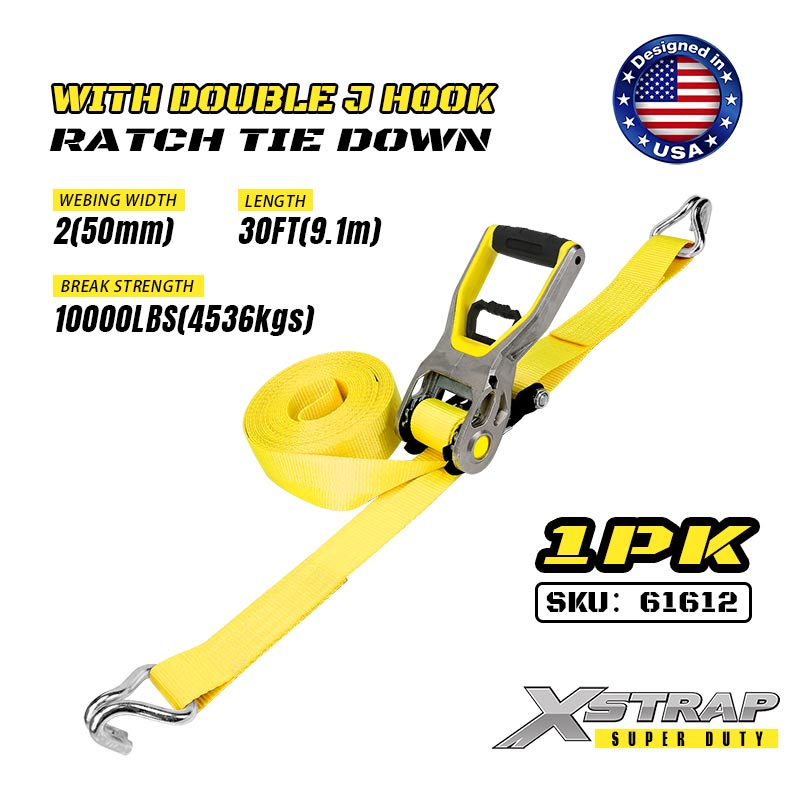 Xstrap 2PK cu cârlige dublu J, 2” x 30’ curea de fixare din poliester curea cu clichet, 3333lbs capacitate de fixare a legăturii de încărcătură Curele de fixare cu cârlige dublu J pentru remorcă rezistentă, remorcă cu pat plat, barcă de schi, mașină mică, echipament greu.