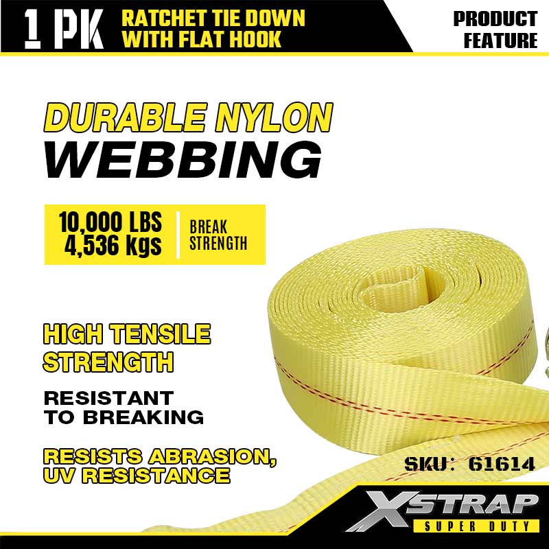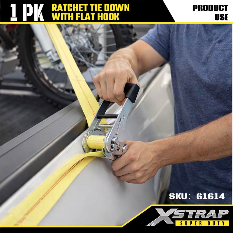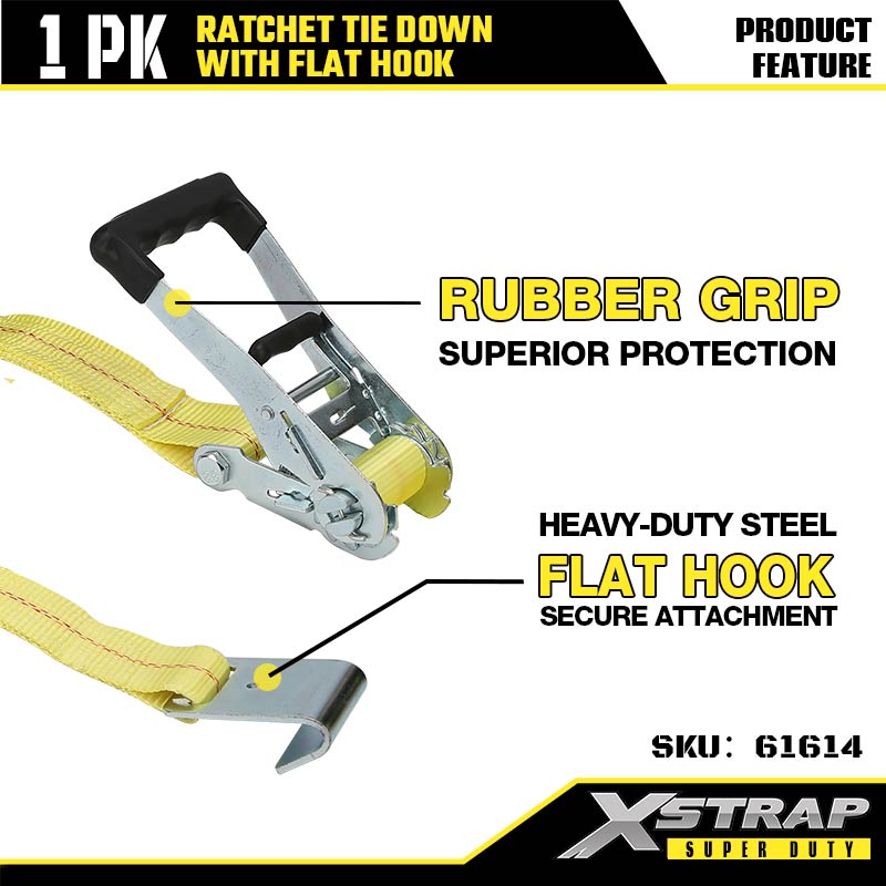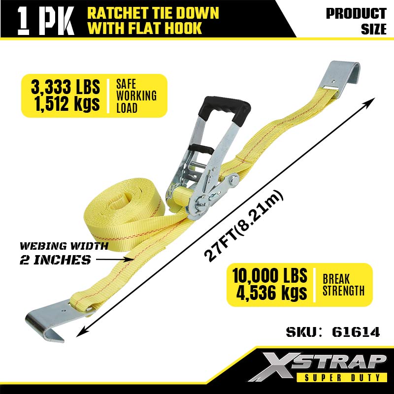 Xstrap Ratcet Fixare cu cârlige plate, 2” x 27’ curea de fixare din poliester Curea cu clichet, Capacitate 3333 lbs Curele de fixare pentru ancorare pentru încărcătură cu cârlige plate pentru remorcă rezistentă, remorcă cu pat plat, barcă de schi, mașină mică, echipament greu.