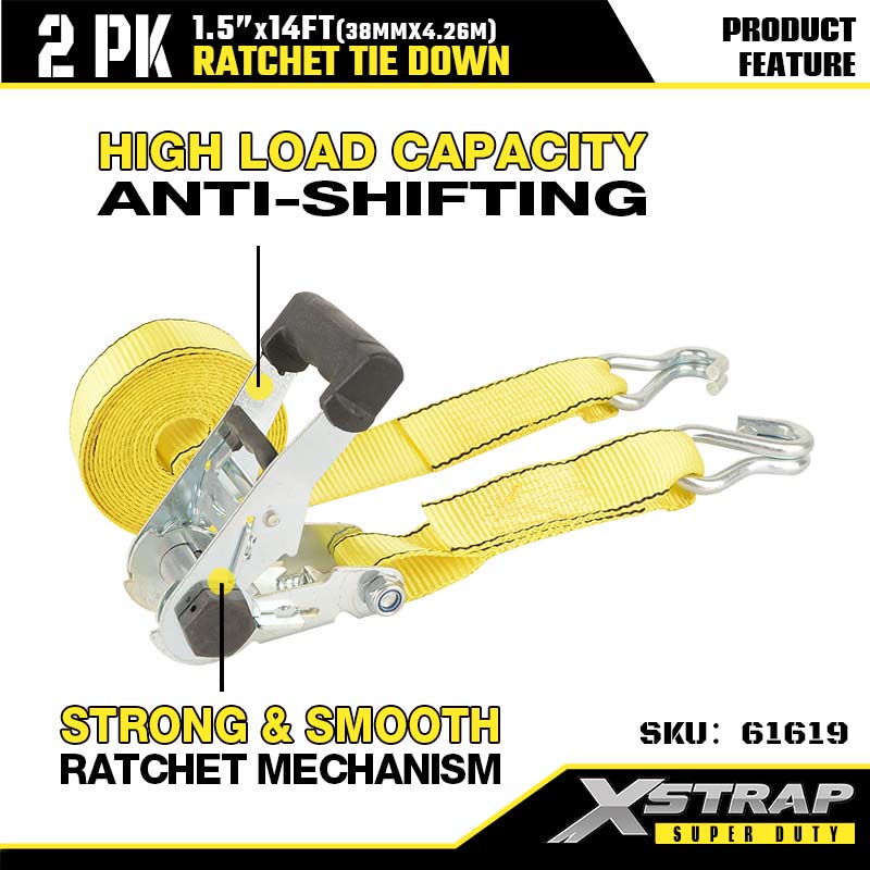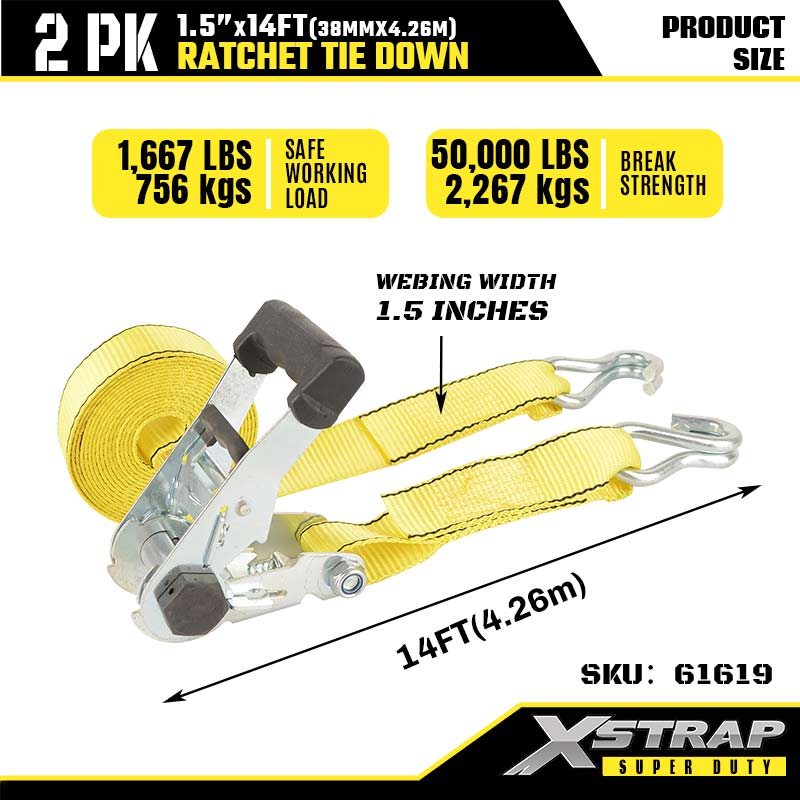 Xstrap 2PK cu cârlige dublu J, 1-1/2” x 14’ curea de fixare din poliester cu clichet, 1667 lbs Capacitate de fixare curele de fixare pentru încărcătură cu cârlige dublu J pentru remorcă rezistentă, remorcă cu pat, barcă de schi, mașină mică, greutăți.