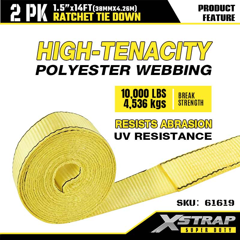 - Cenile din poliester de înaltă tenacitate: chinga din poliester cu o lățime de 1,5 inchi rezistă la uzură, întindere și abraziune. Este rezistent la UV pentru a rezista la soare și ploaie, astfel este puternic pentru utilizarea termenului lung pe șantiere sau drumuri secundare.