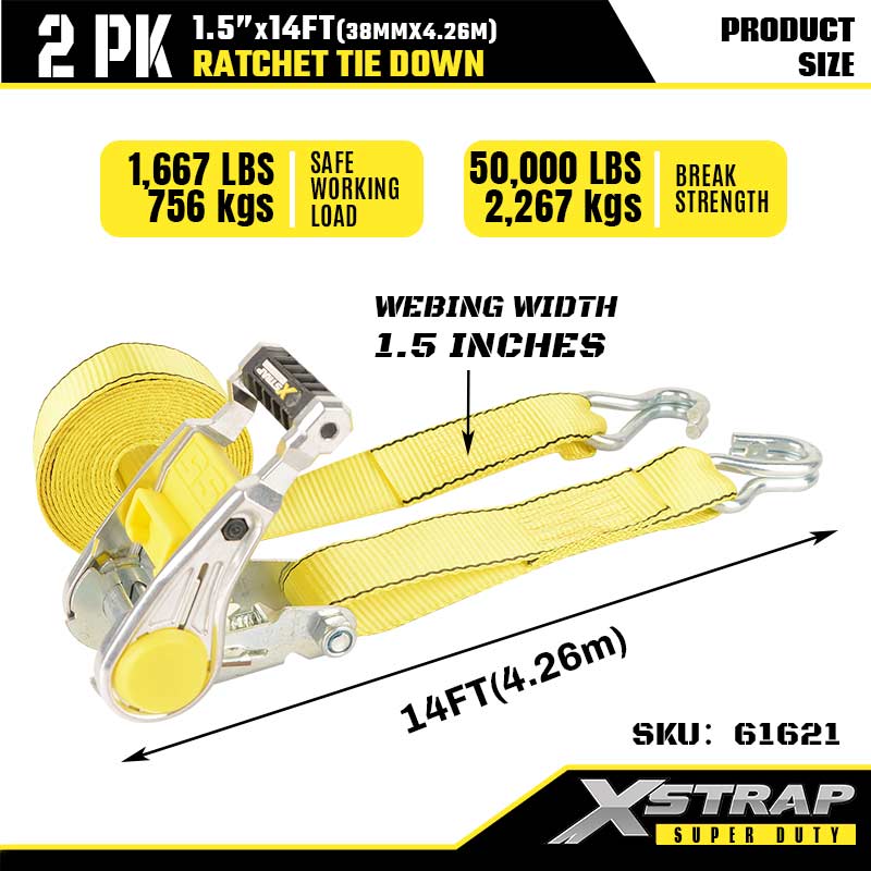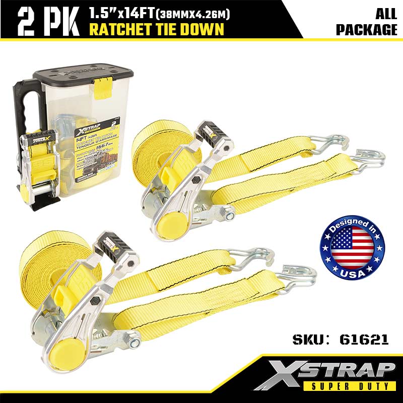 Xstrap 2PK cu cârlige dublu J, 1-1/2” x 14’ curea de fixare din poliester cu clichet, 1667 lbs Capacitate de fixare curele de fixare pentru încărcătură cu cârlige dublu J pentru remorcă rezistentă, remorcă cu pat, barcă de schi, mașină mică, greutăți.