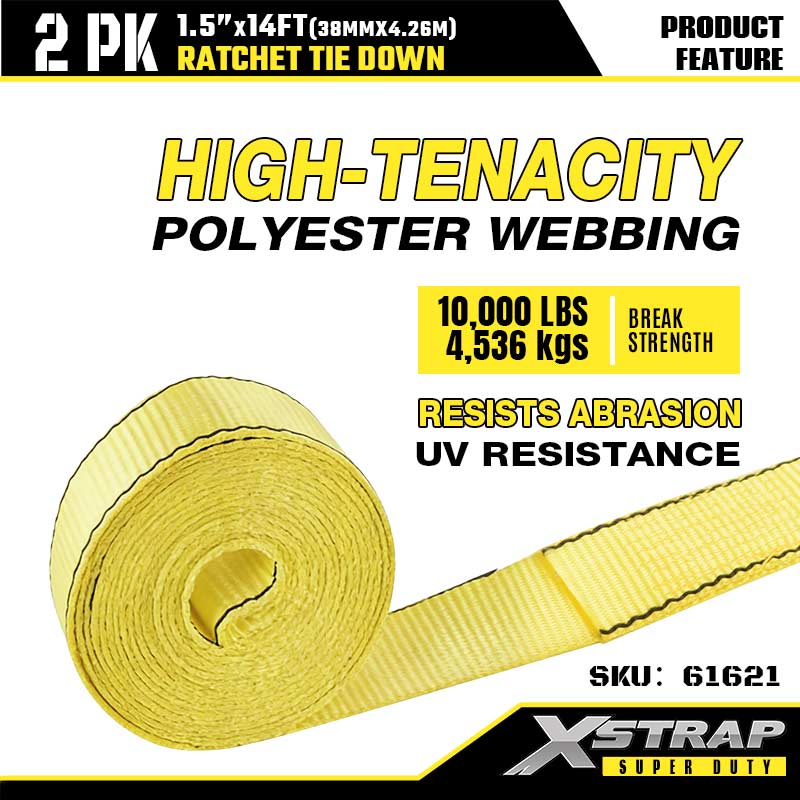 - Cenile din poliester de înaltă tenacitate: chinga din poliester cu o lățime de 1,5 inchi rezistă la uzură, întindere și deteriorări UV, astfel încât rezistă la soare, ploaie și teren accidentat. Este suficient de dur pentru materialele de construcție și suficient de blând pentru a vă proteja echipamentul de exterior de zgârieturi.