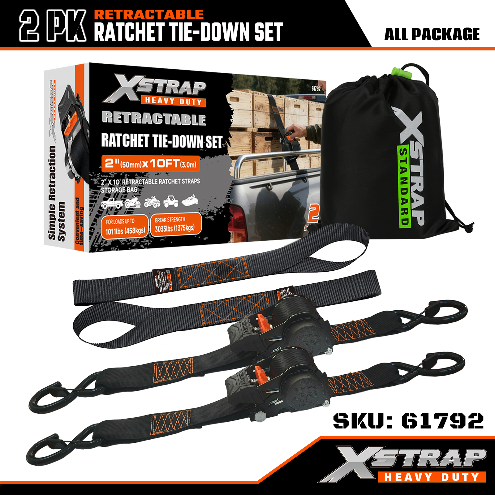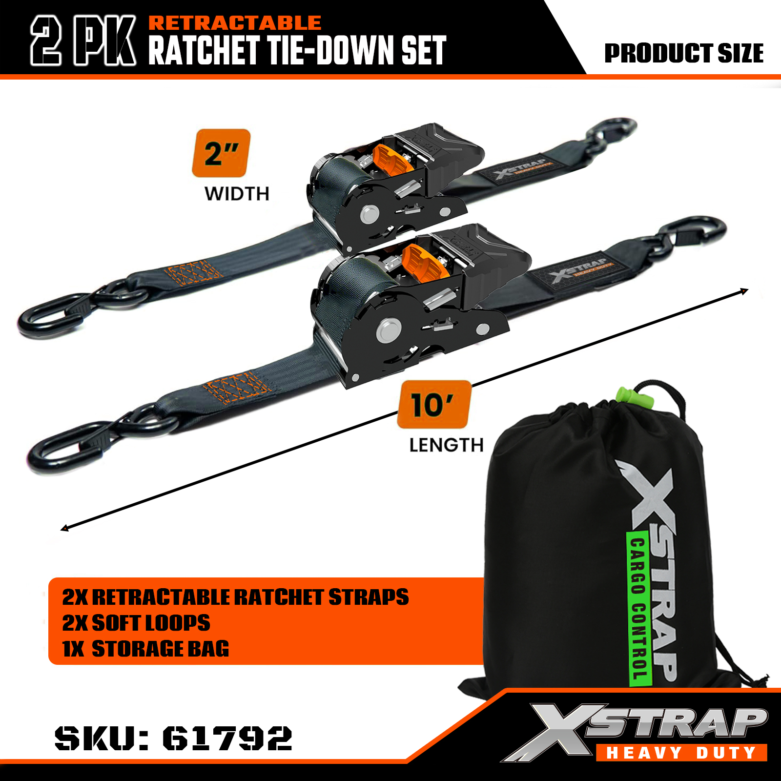 Set de fixare cu clichet retractabil Xstrap 2PK cu cârlige S de siguranță, curea cu clichet din poliester de 2” x 10 pi, capacitate de 1011 lbs Curele de fixare pentru ancorare a încărcăturii cu cârlige S de siguranță pentru camion, remorcă de marfă, motocicletă.